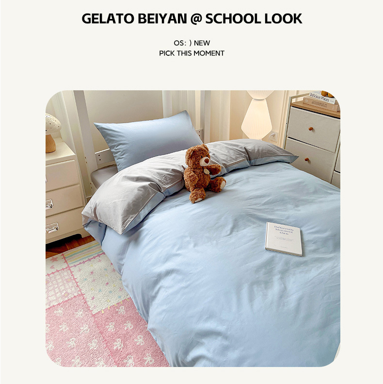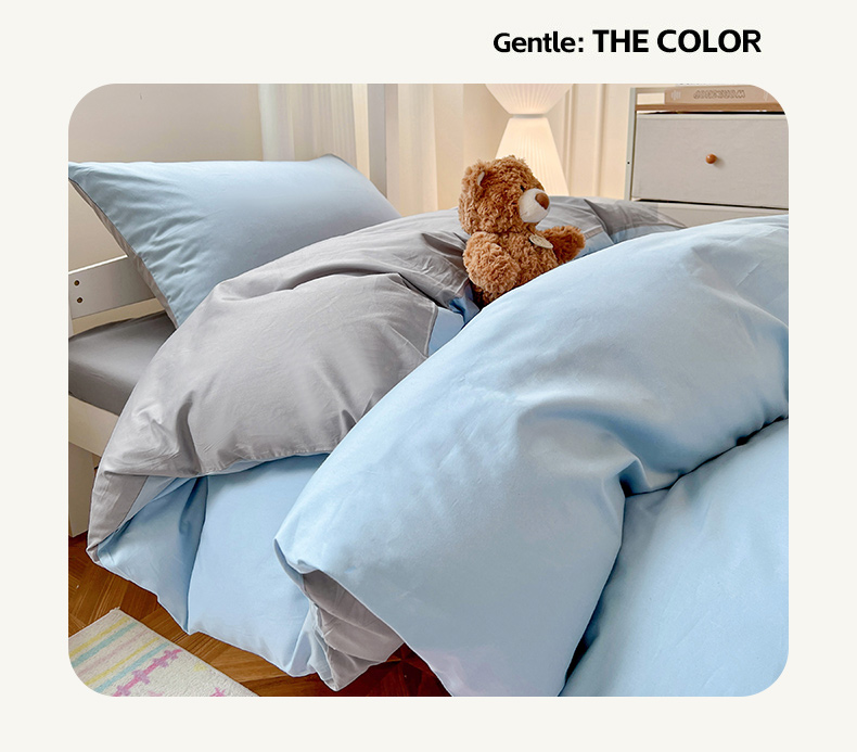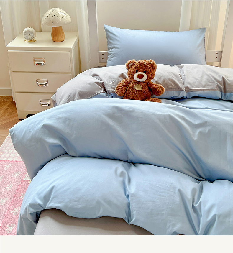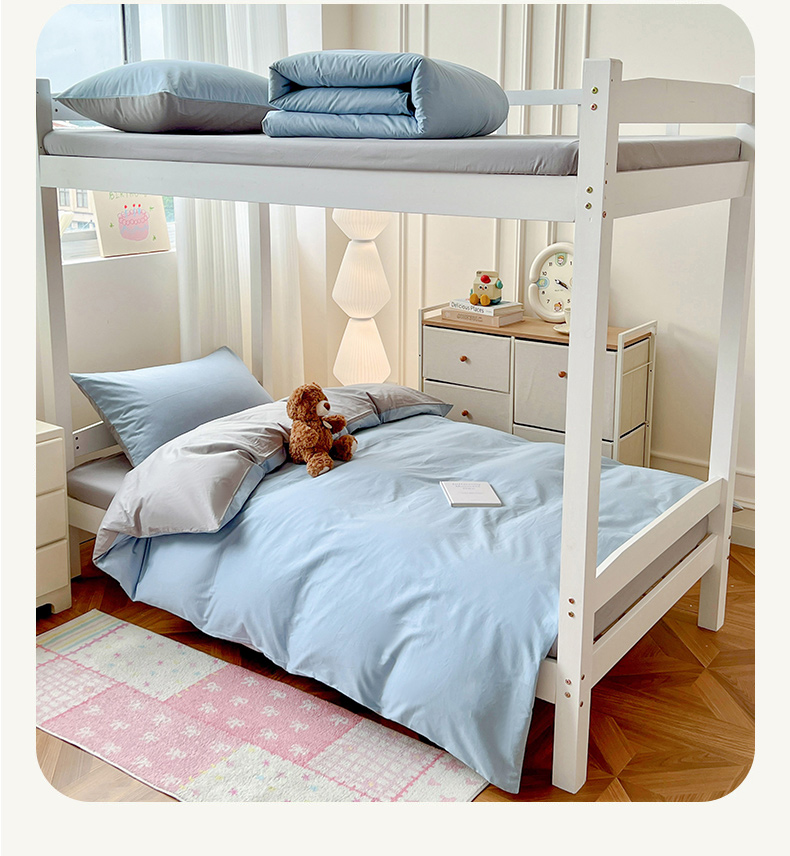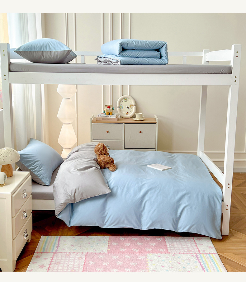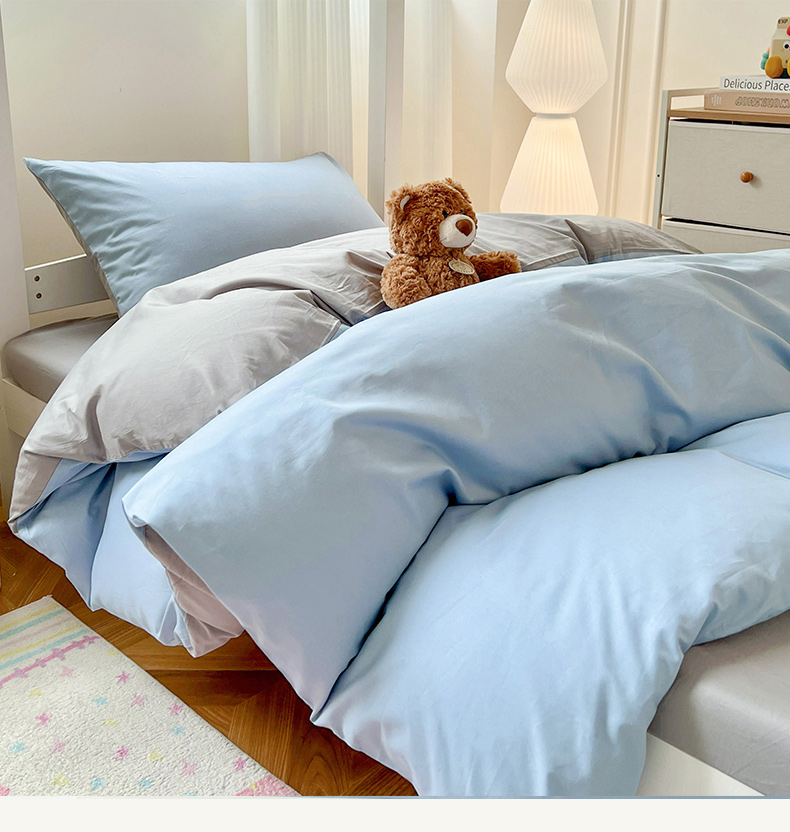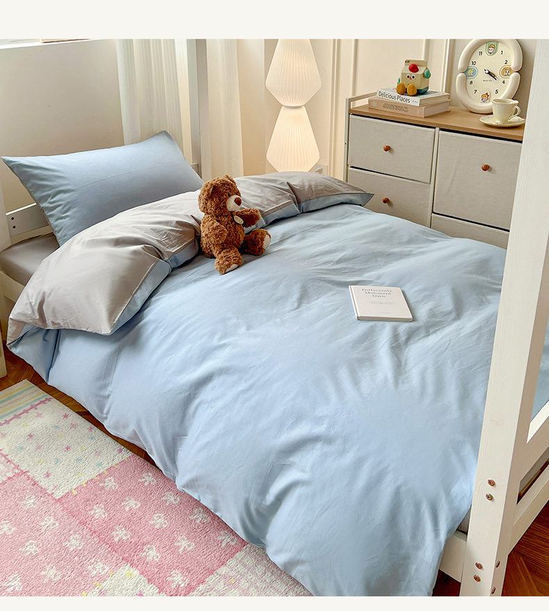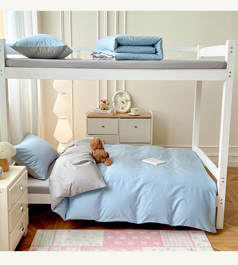 商品名称:泽西家纺 2025新款A类加密全棉40支13376简约风宿舍双拼纯色纯棉学生三件套 淡蓝+深灰