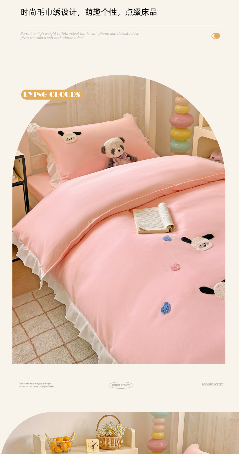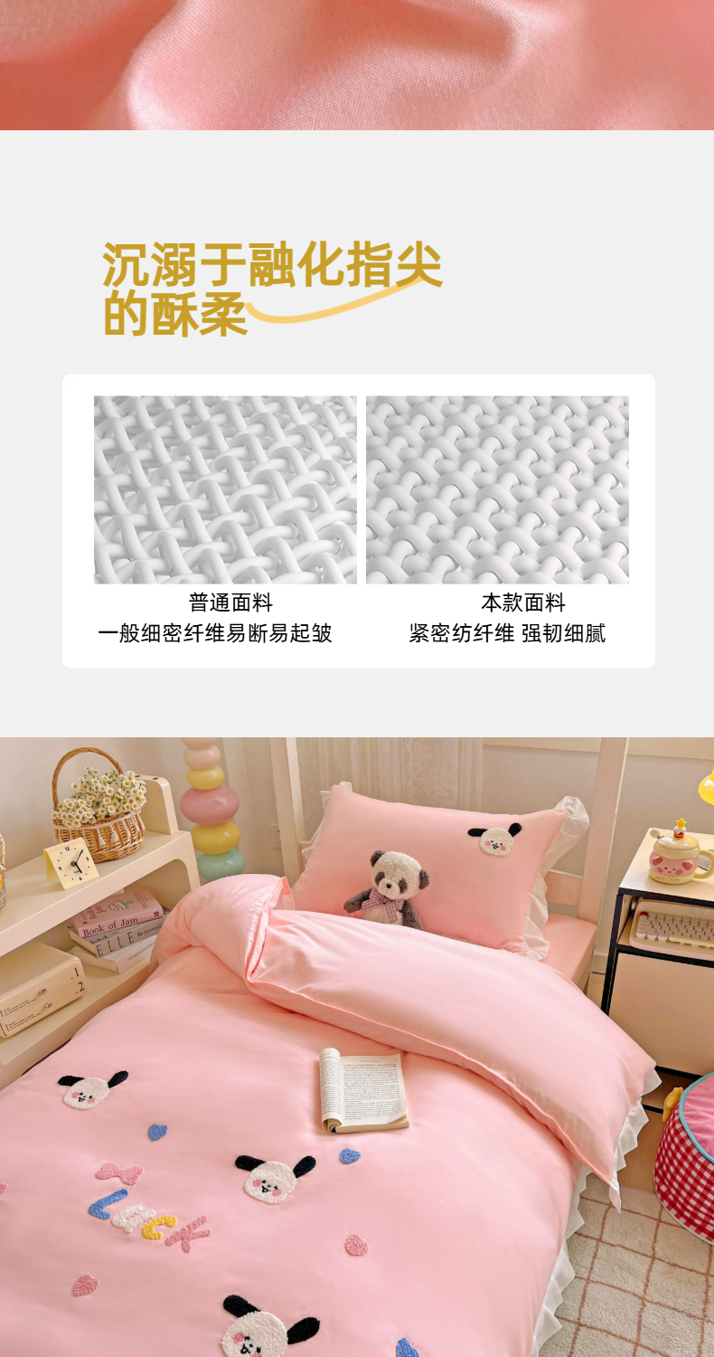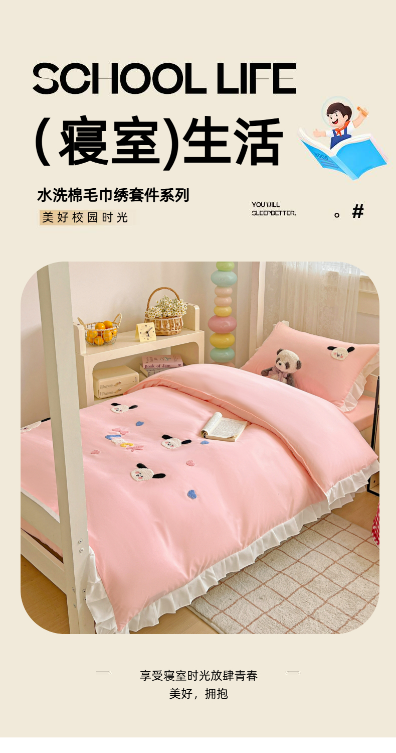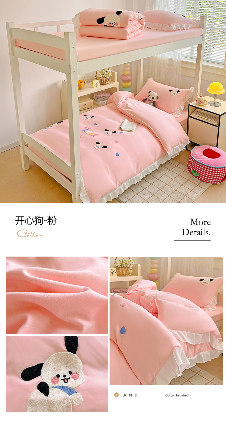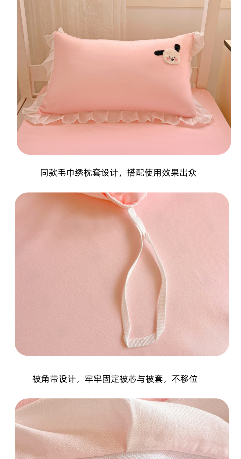 当前位置: 91家纺网 > 商品网购 > 床品套件 > 三件套 > 雨菲家纺 2025新款学生季水洗棉毛巾绣花荷叶花边三件套四件套床单床笠款 开心狗粉