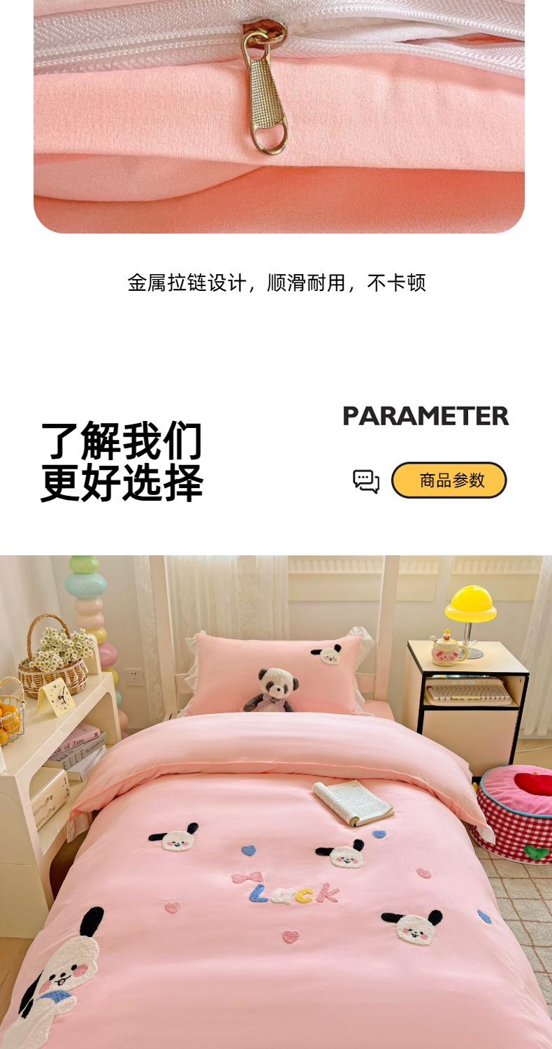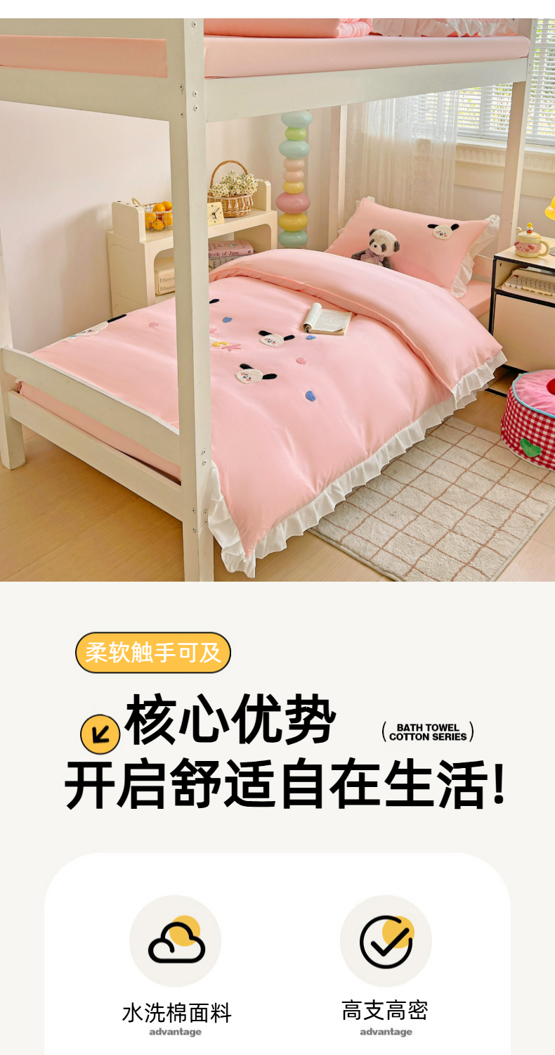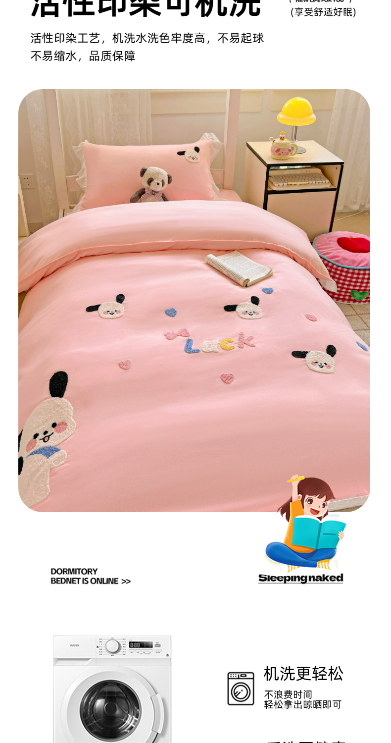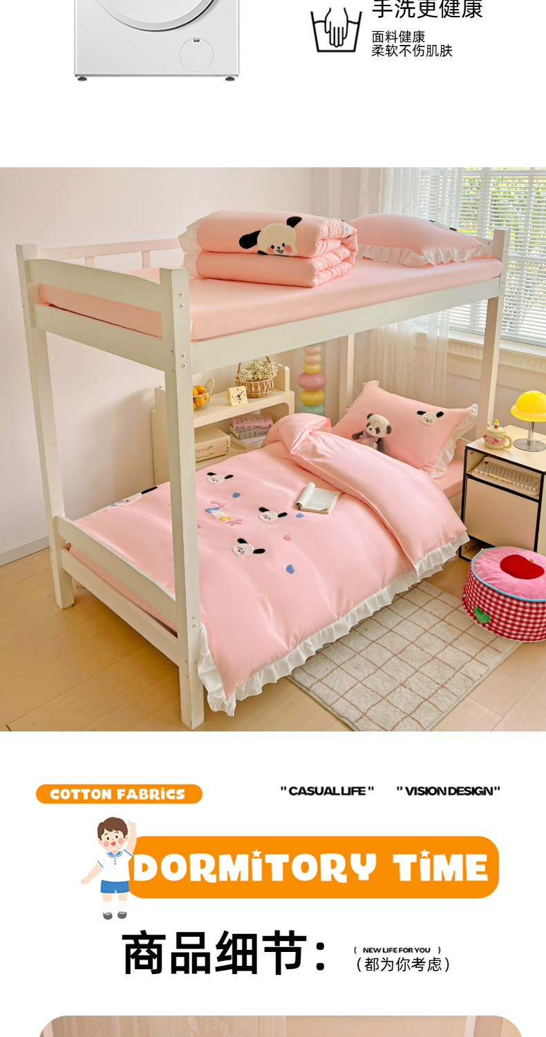 当前位置: 91家纺网 > 商品网购 > 床品套件 > 三件套 > 雨菲家纺 2025新款学生季水洗棉毛巾绣花荷叶花边三件套四件套床单床笠款 开心狗粉