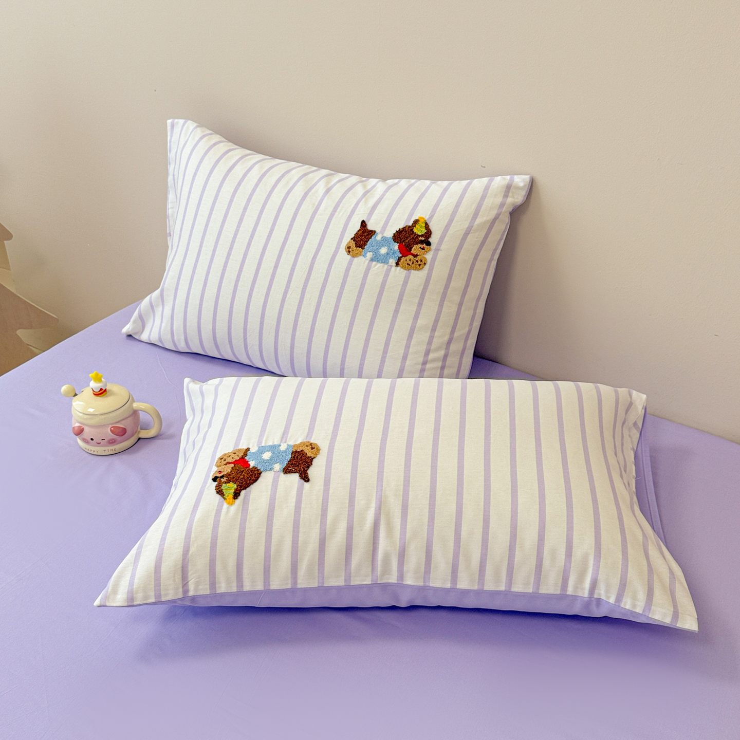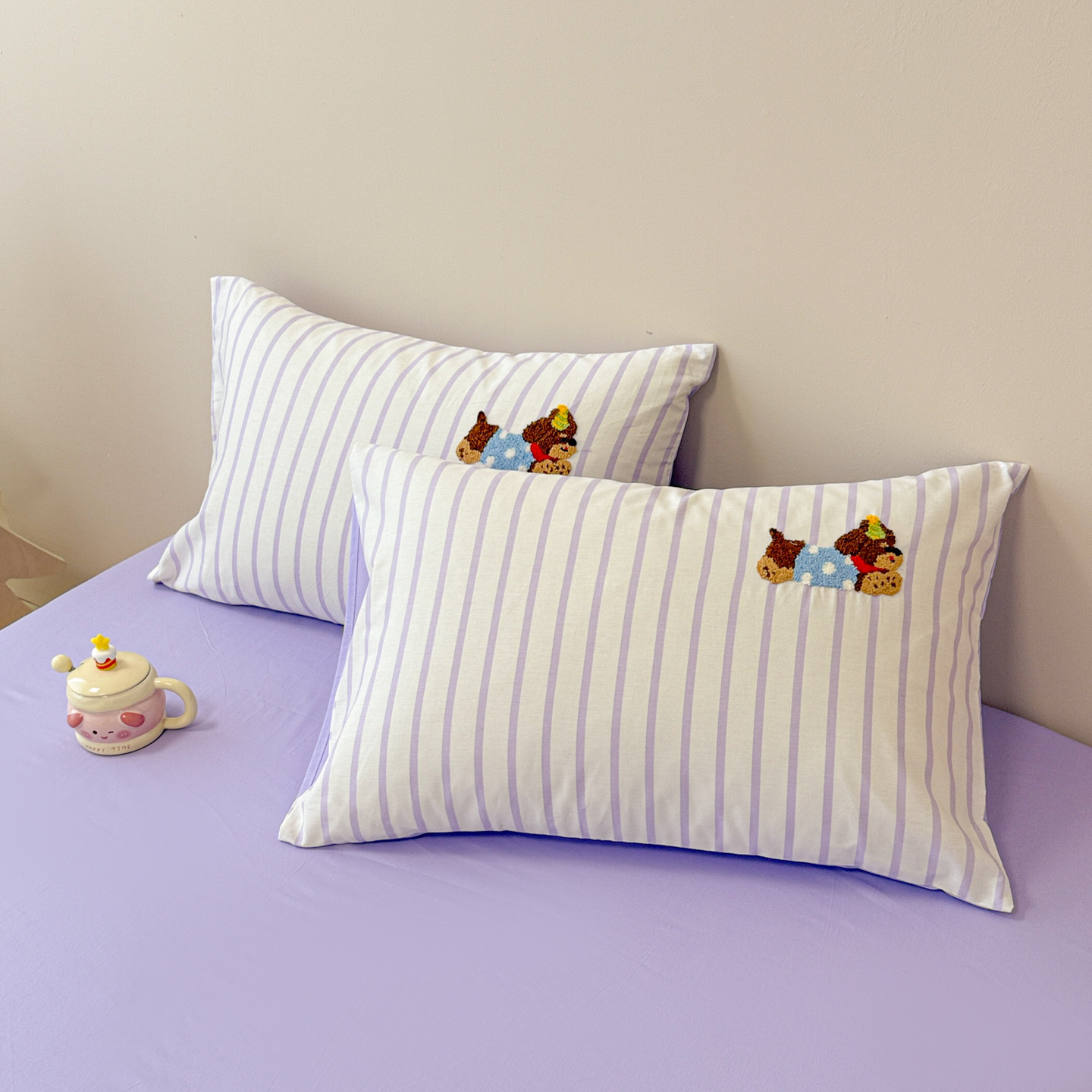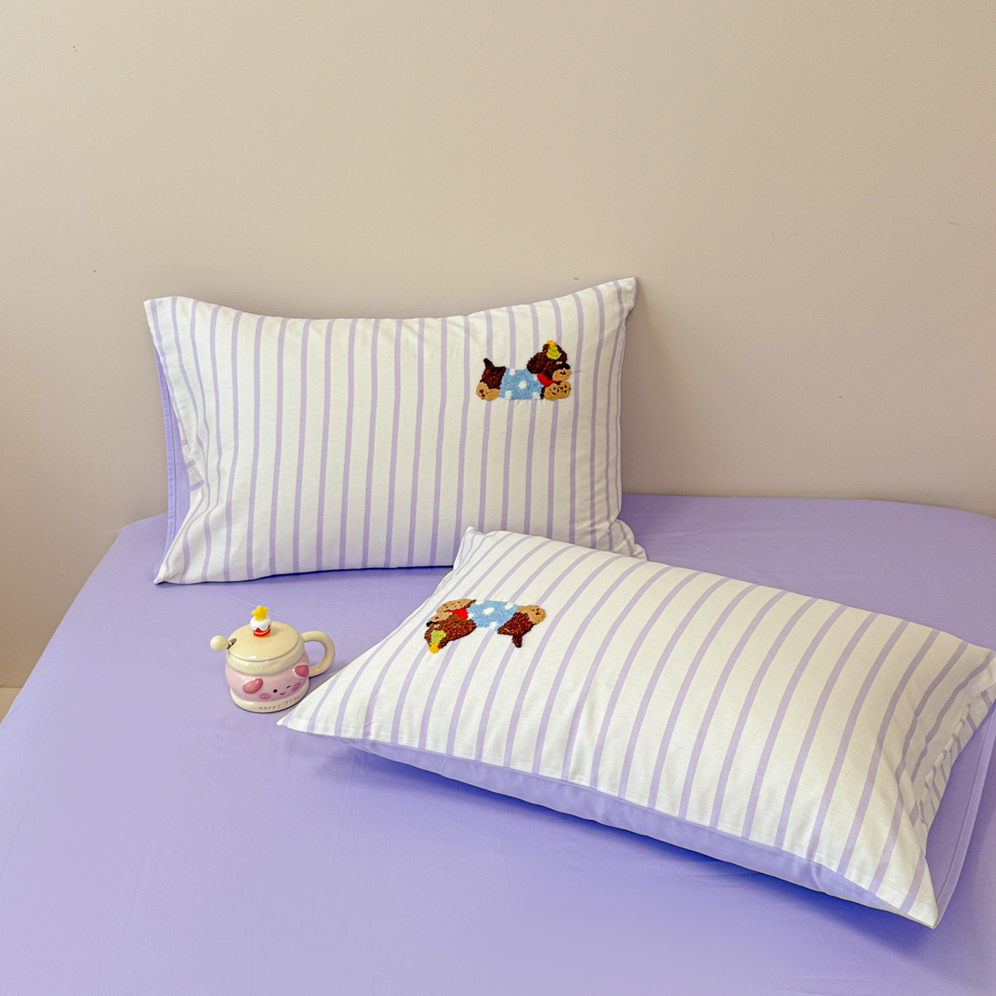 商品名称:呗旺鹿 2025新款全棉纯棉条纹毛巾绣卡通单枕套 枕套单件 紫条纹-狗狗派对
