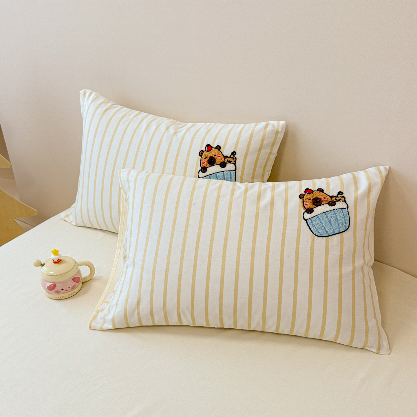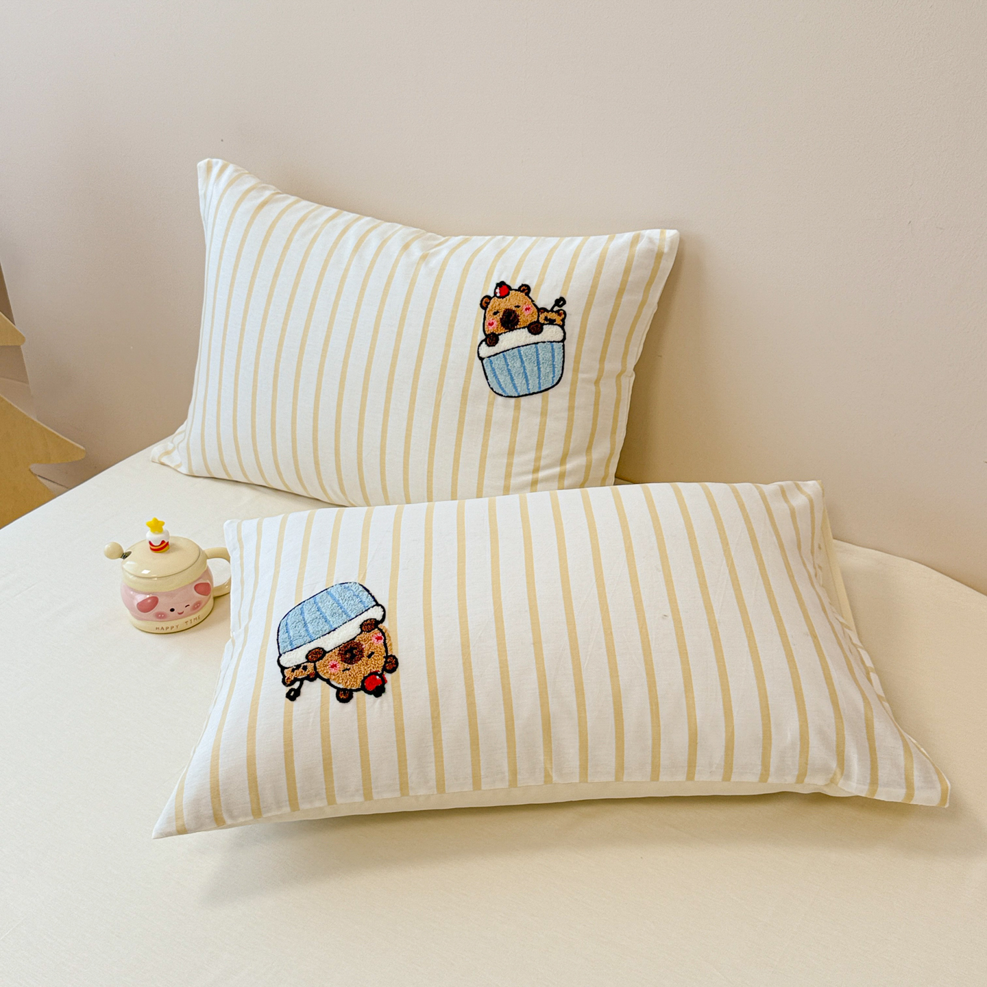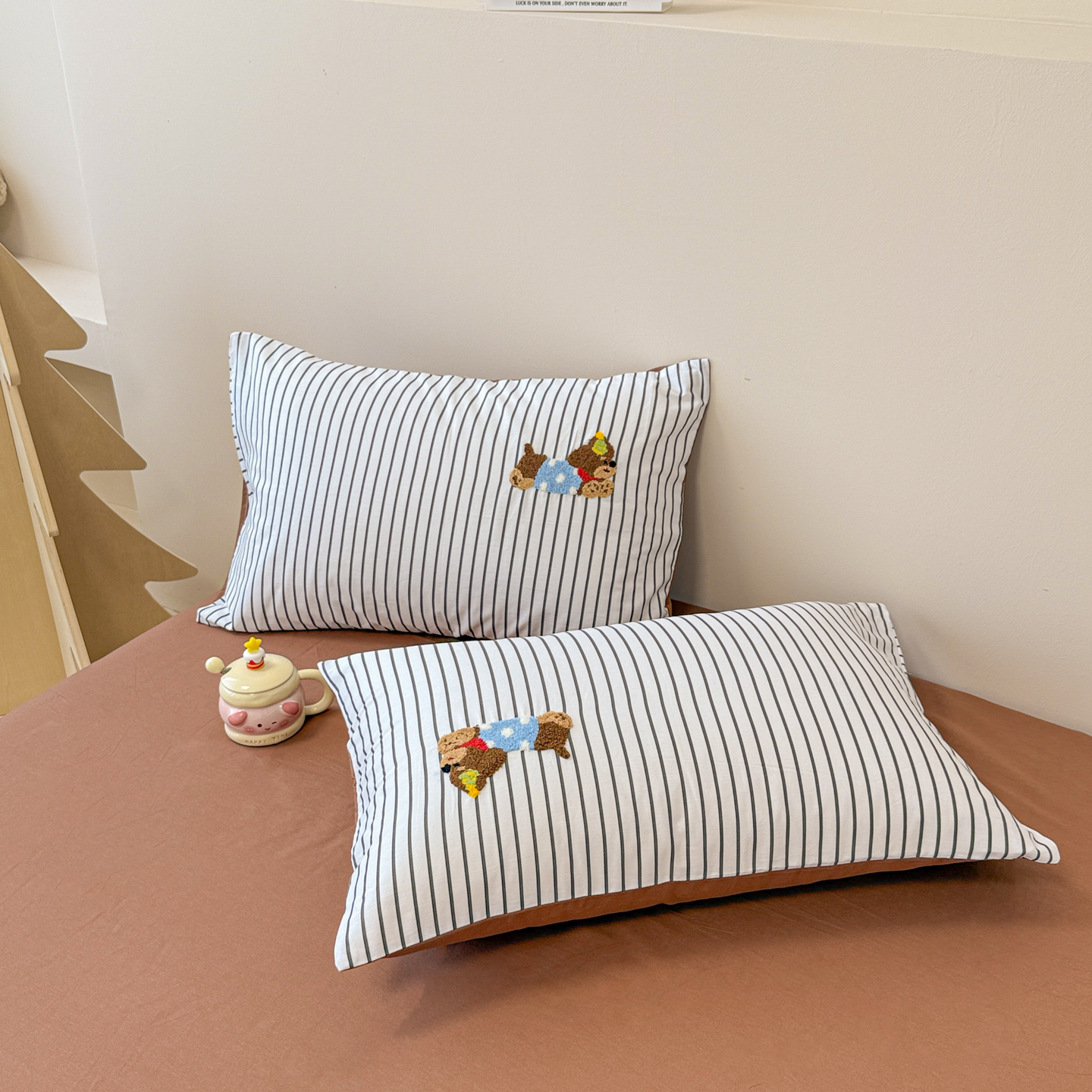 商品名称:呗旺鹿 2025新款全棉纯棉条纹毛巾绣卡通单枕套 枕套单件 紫条纹-狗狗派对