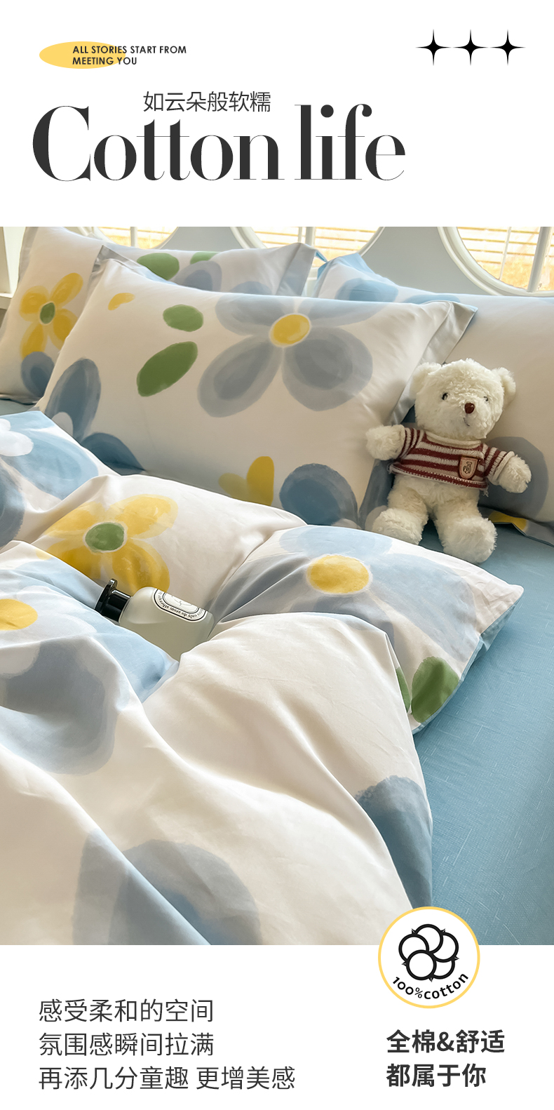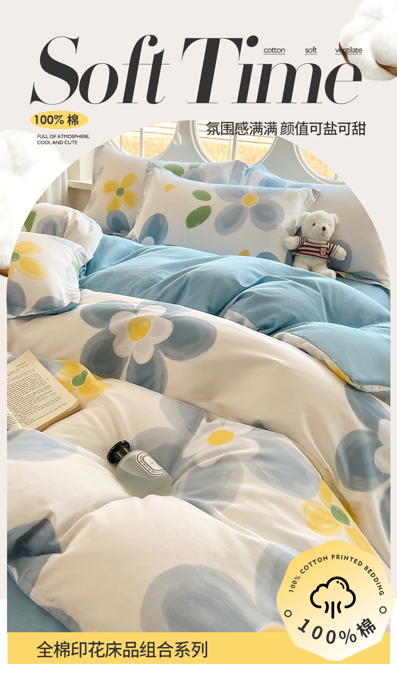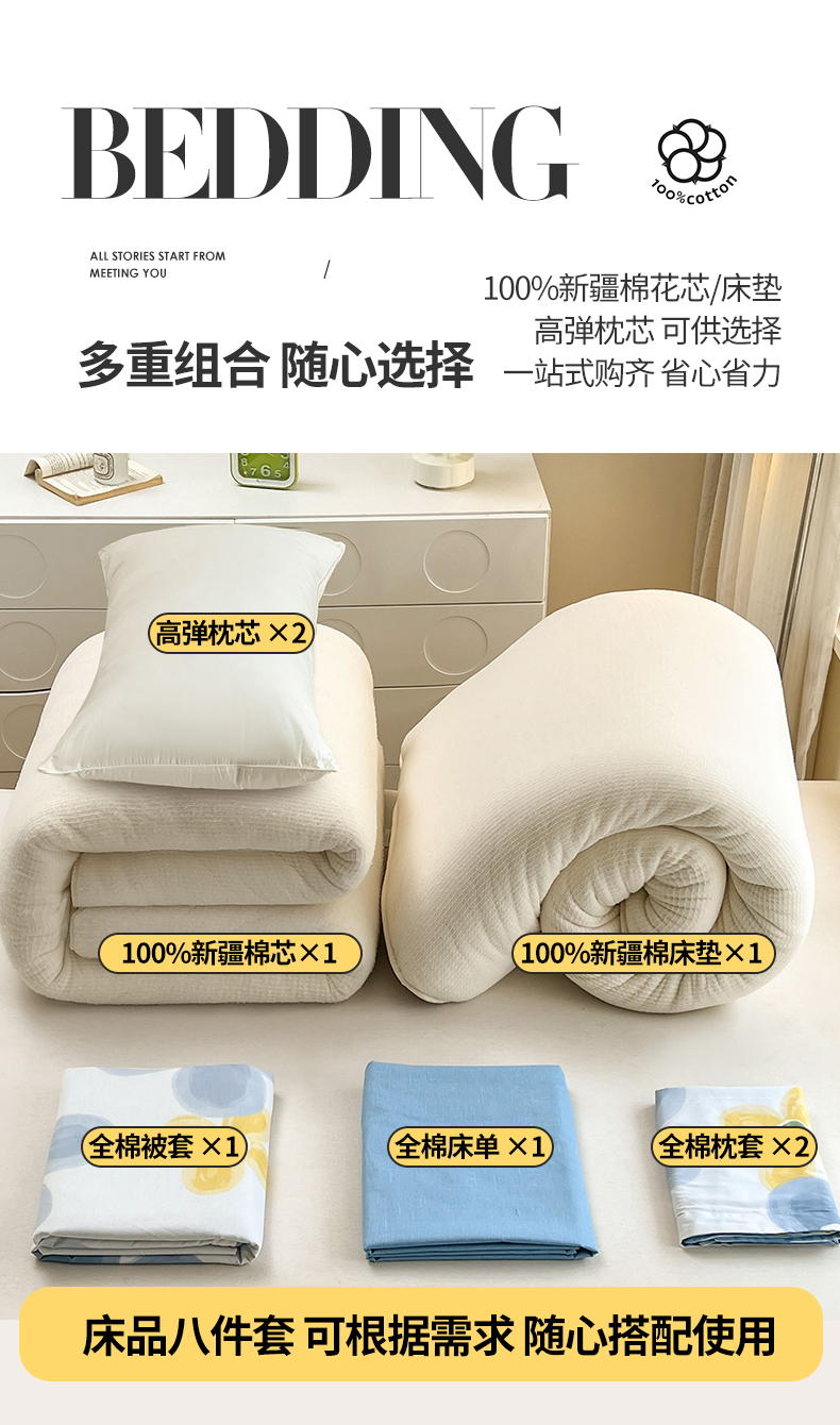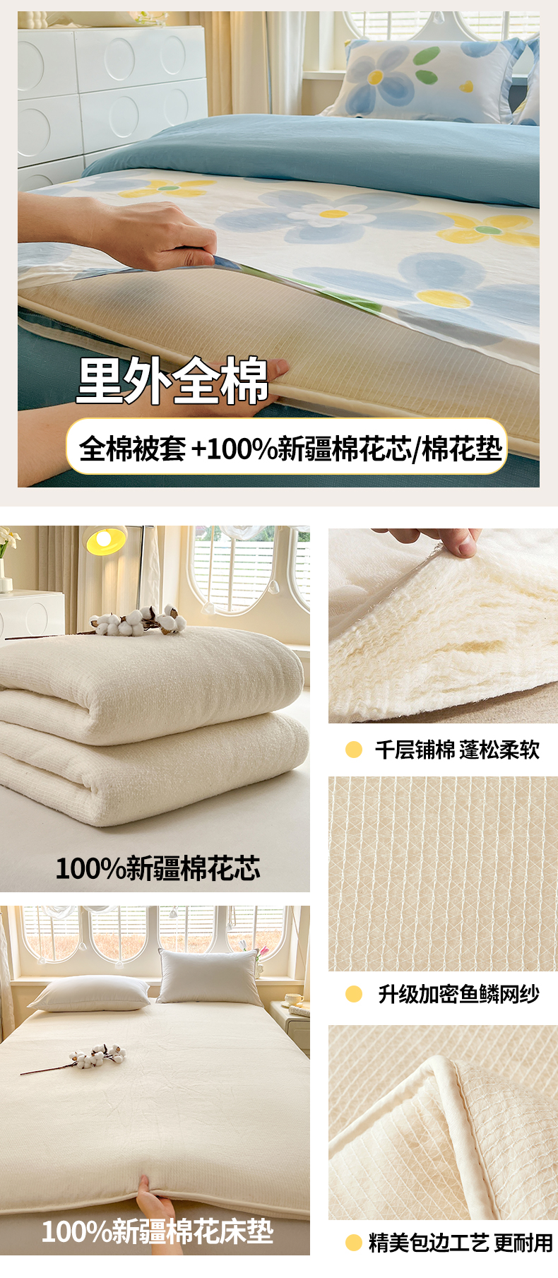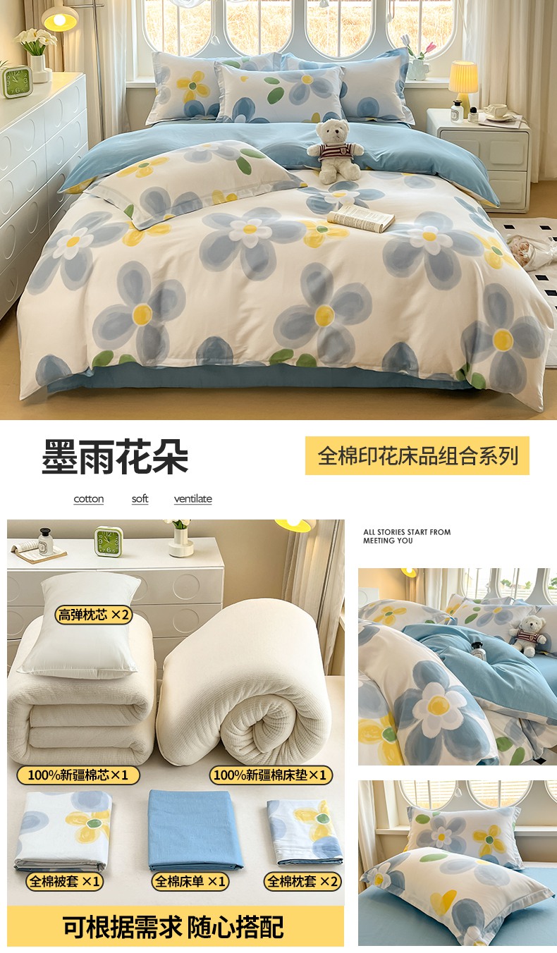 商品名称:西域种棉人·千百笠 2025新款全棉纯棉大学生宿舍100%新疆棉花被子被褥一整套枕头床垫三件套六件套 墨雨花朵