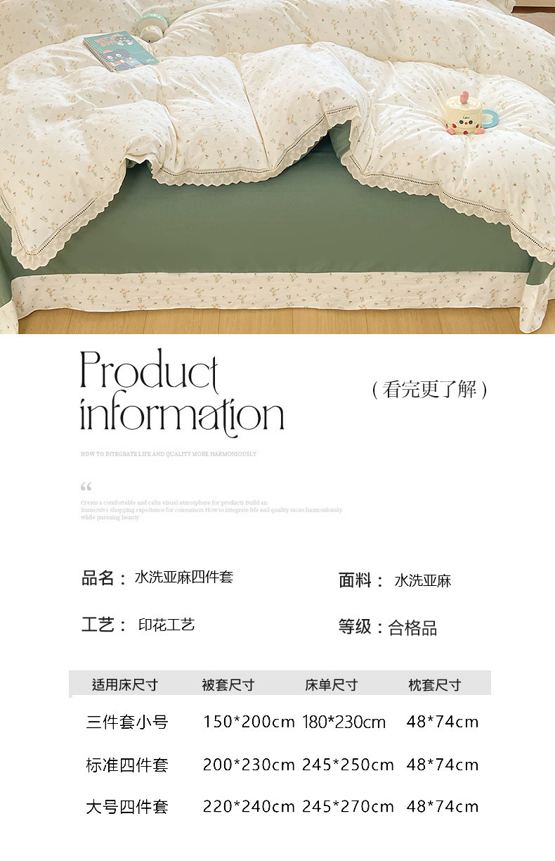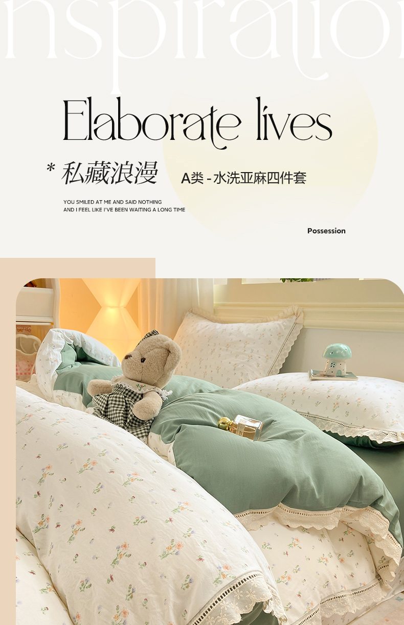 (总)大麦家纺 2025新款水洗亚麻花边四件套,粉黛佳人,风木槿咖,浮生花语,海棠花溪,花颜,锦瑟,满园花开,山花浪漫,颂青时,香榭花园,玉茗
