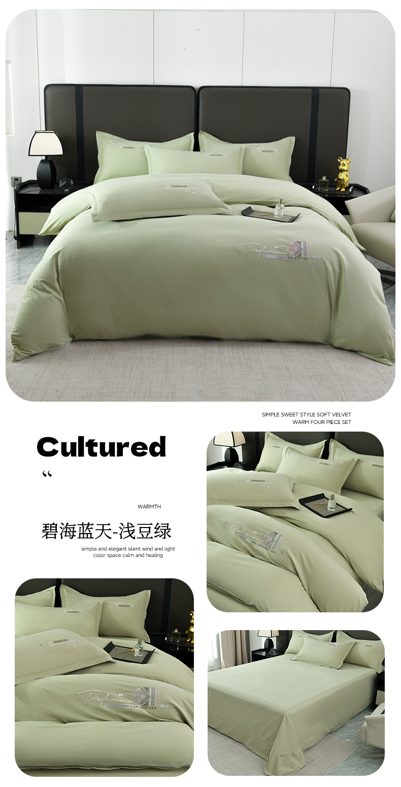 当前位置: 91家纺网 > 商品网购 > 床品套件 > 四件套 > 长绒棉四件套 > U品汇 2025新品40S长绒棉加厚全棉纯棉陶瓷磨毛刺绣花四件套100%棉碳素磨毛 碧海蓝天-浅豆绿