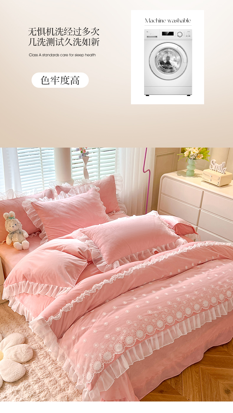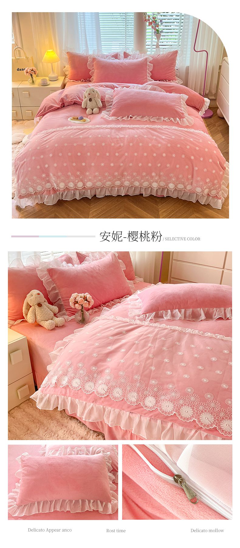 商品名称:唐人居 2025新款法式蕾丝花边宝宝绒四件套--安妮系列 安妮-樱桃粉