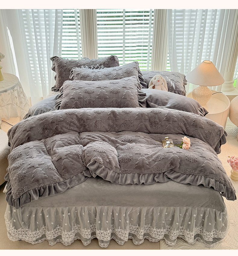唐人居 2025新款雕花花边兔毛绒床裙四件套 小树林-浅粉