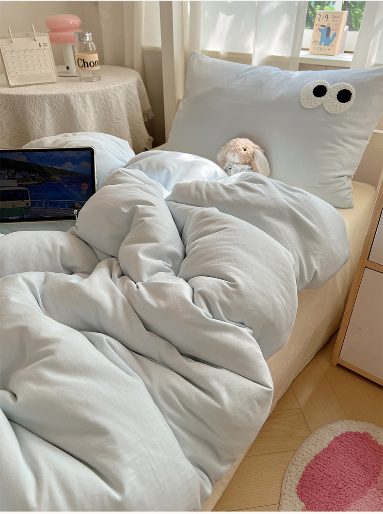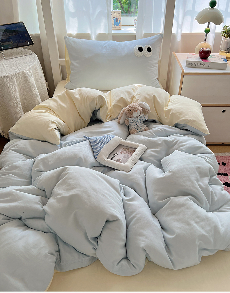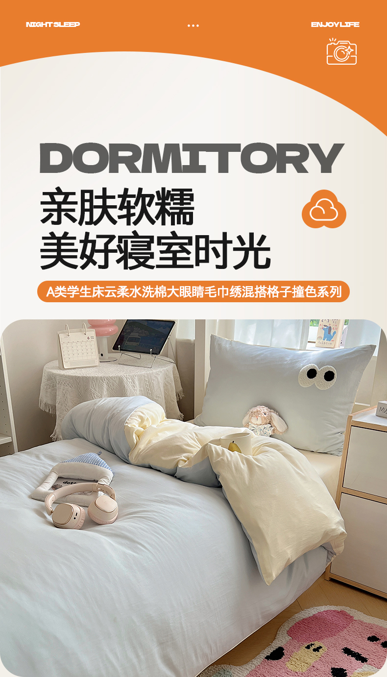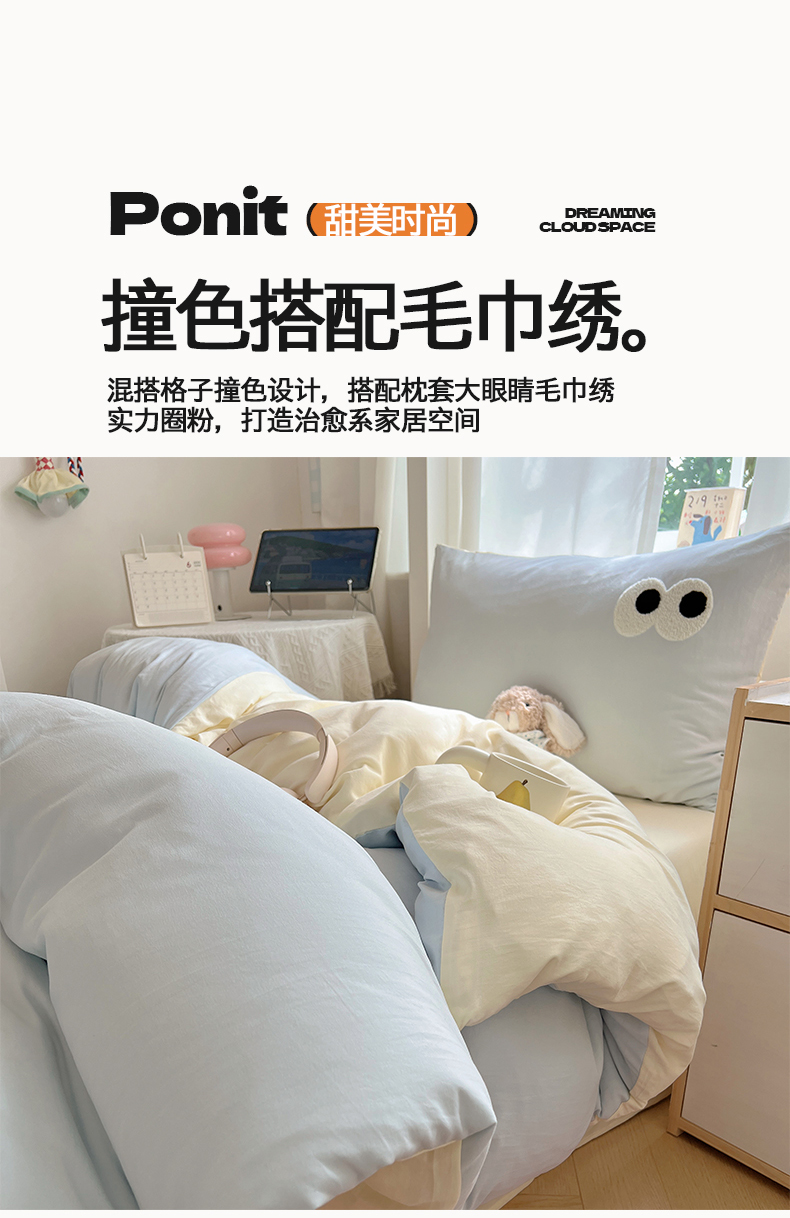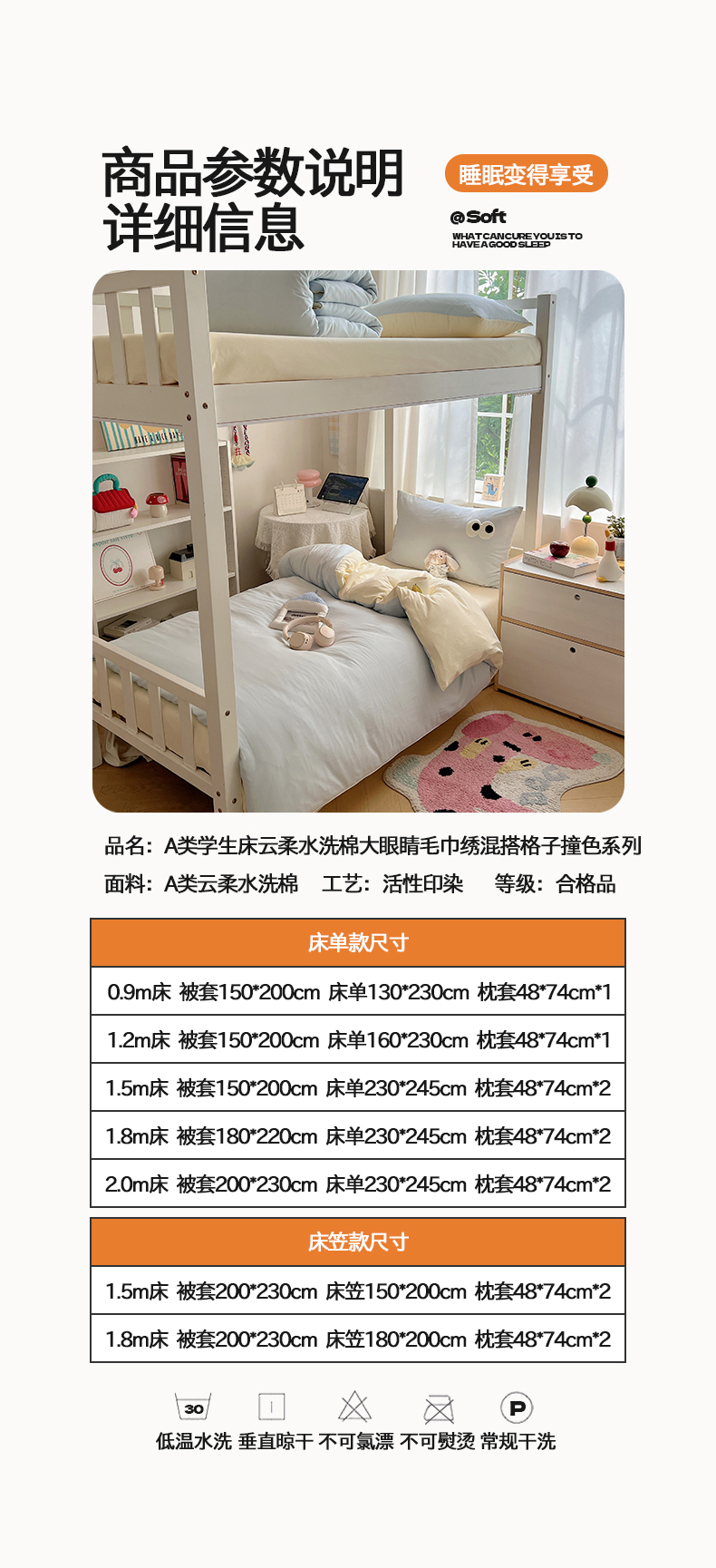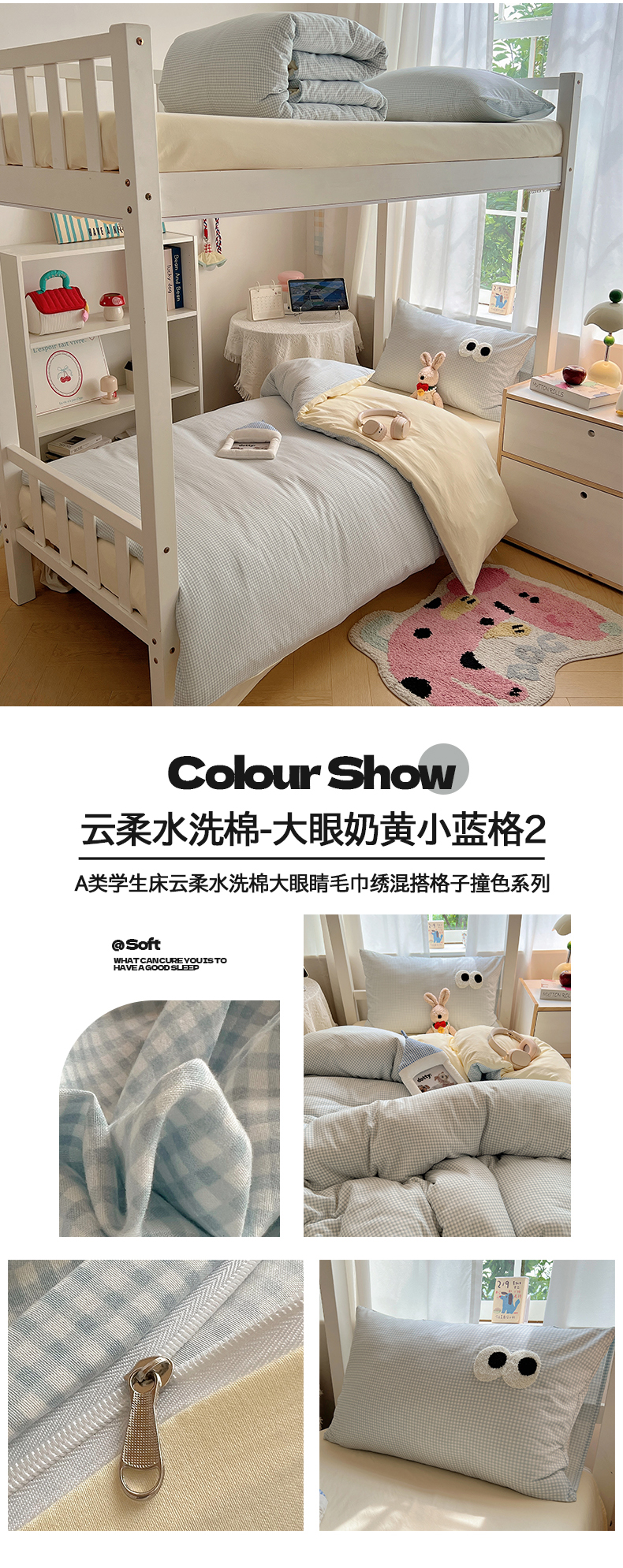 当前位置: 91家纺网 > 商品网购 > 床品套件 > 三件套 > 桃心家居 2025新款A类学生床三件套亲肤舒适软糯云柔水洗棉大眼睛毛巾绣混搭格子撞色系列四件套 云柔水洗棉-大眼海盐奶黄