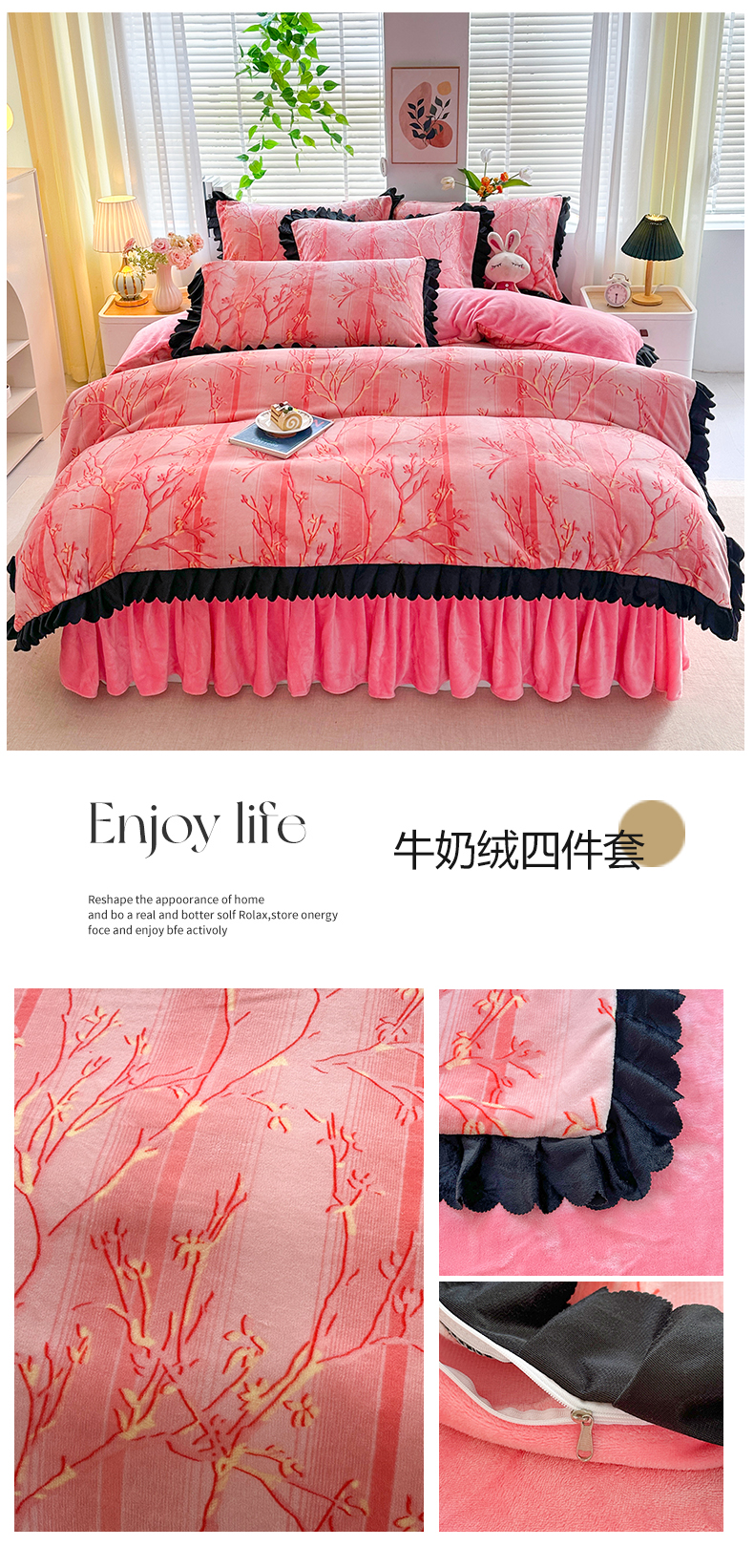 商品名称:望淮家纺 2025新款韩版牛奶绒四件套 梦幻丛林-粉