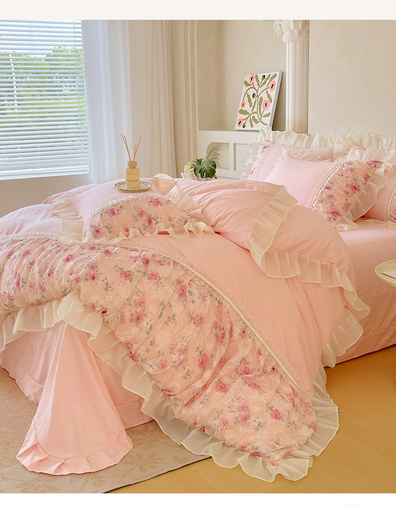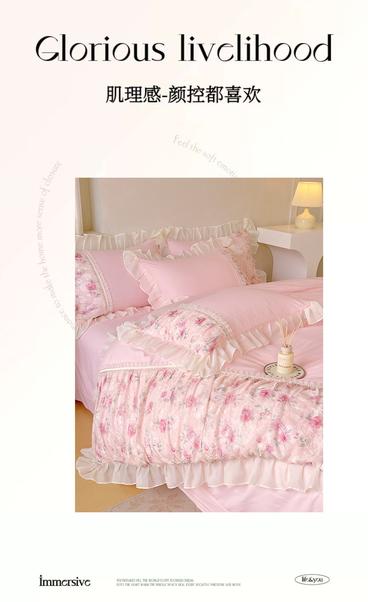 当前位置: 91家纺网 > 商品网购 > 床品套件 > 四件套 > 其它四件套 > 大麦乐田 2025新款法式少女心水洗糯小棉公主风蕾丝花边四件套 米兰春天-浅粉