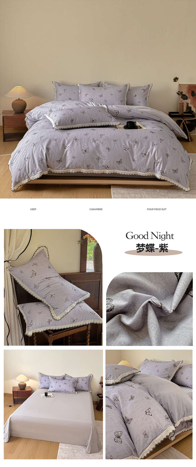 商品名称:舒慕家纺 2025新款全棉磨毛花边赫本风磨毛四件套(送高端包装) 梦蝶-紫