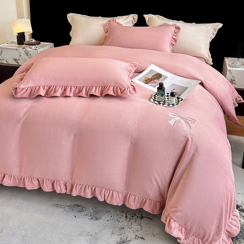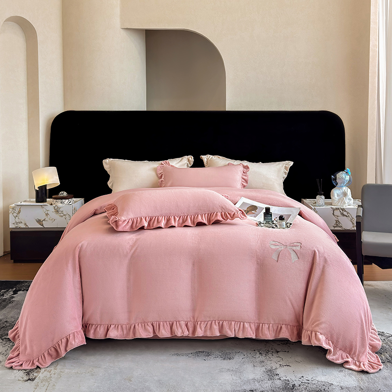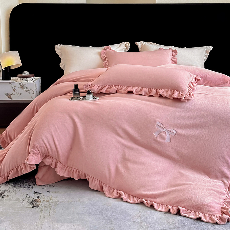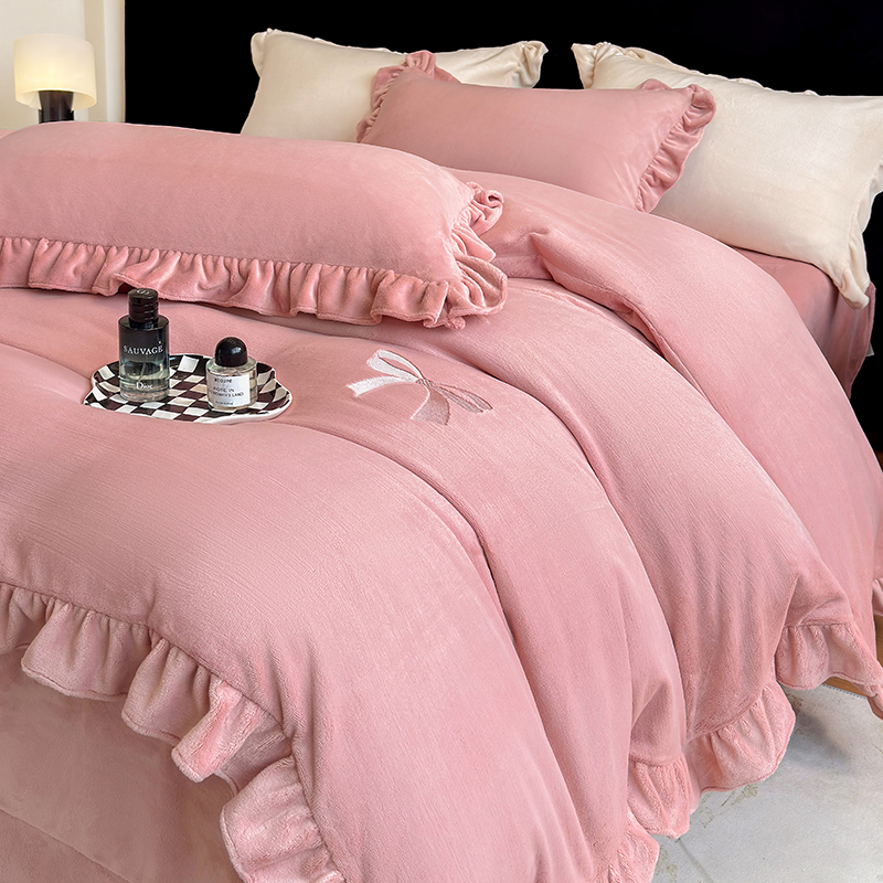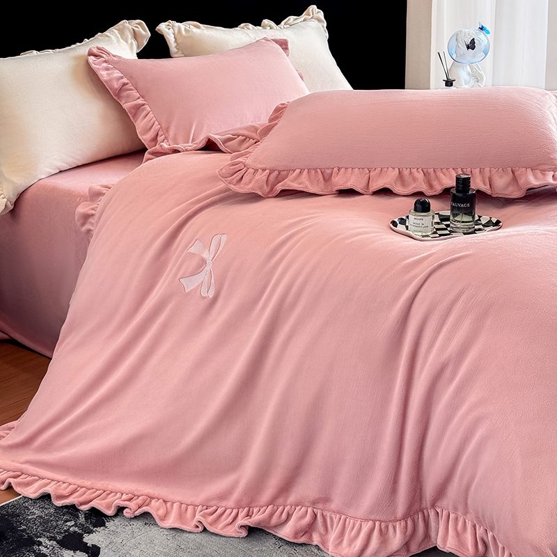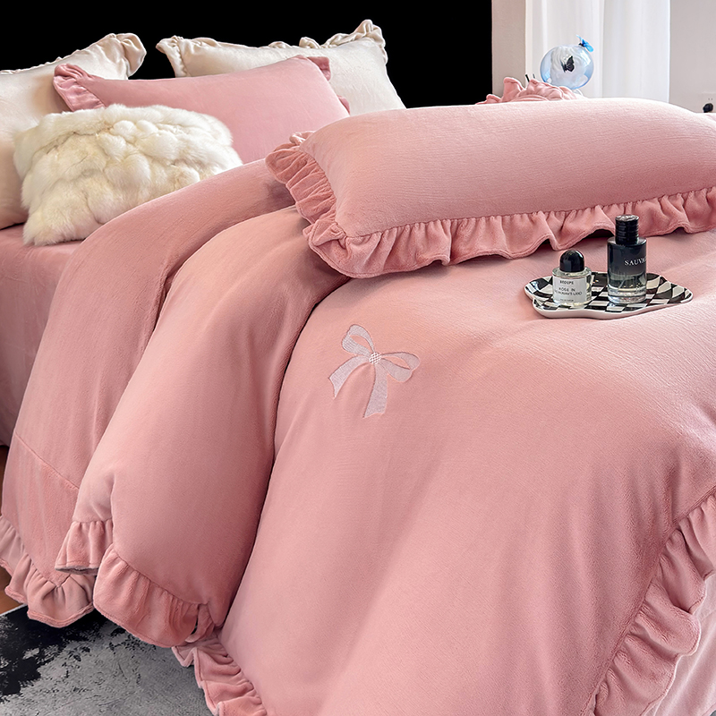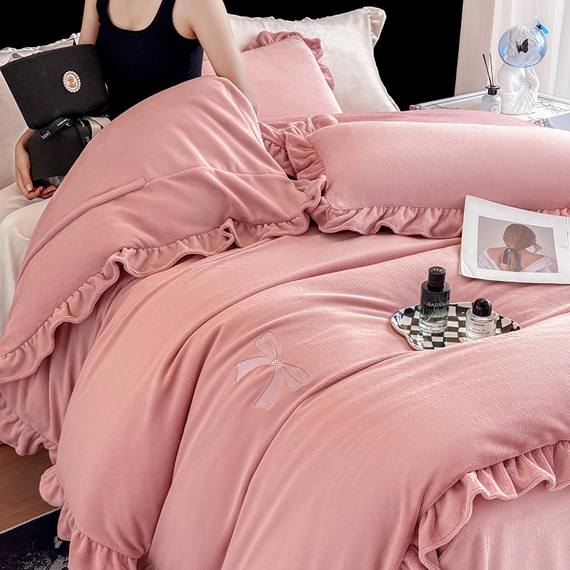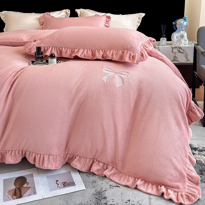 2025新款蝴蝶结绣花牛奶绒四件套 蝴蝶结-少女粉
