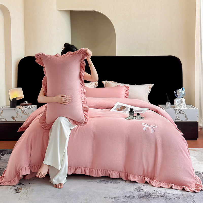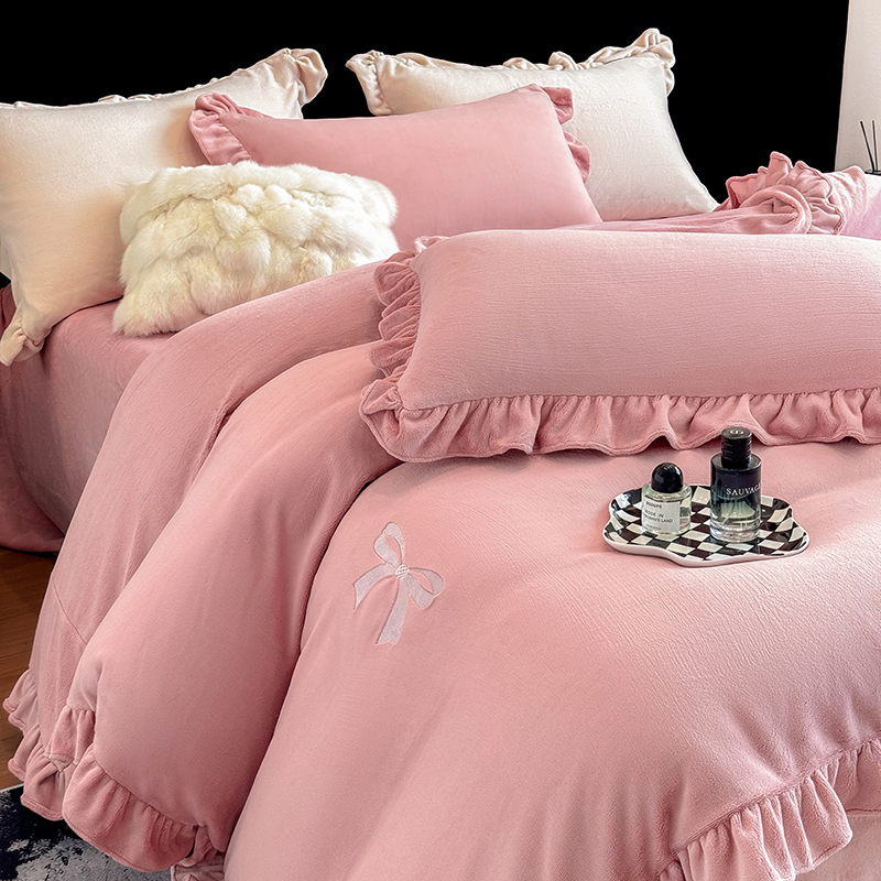商品名称:2025新款蝴蝶结绣花牛奶绒四件套 蝴蝶结-少女粉