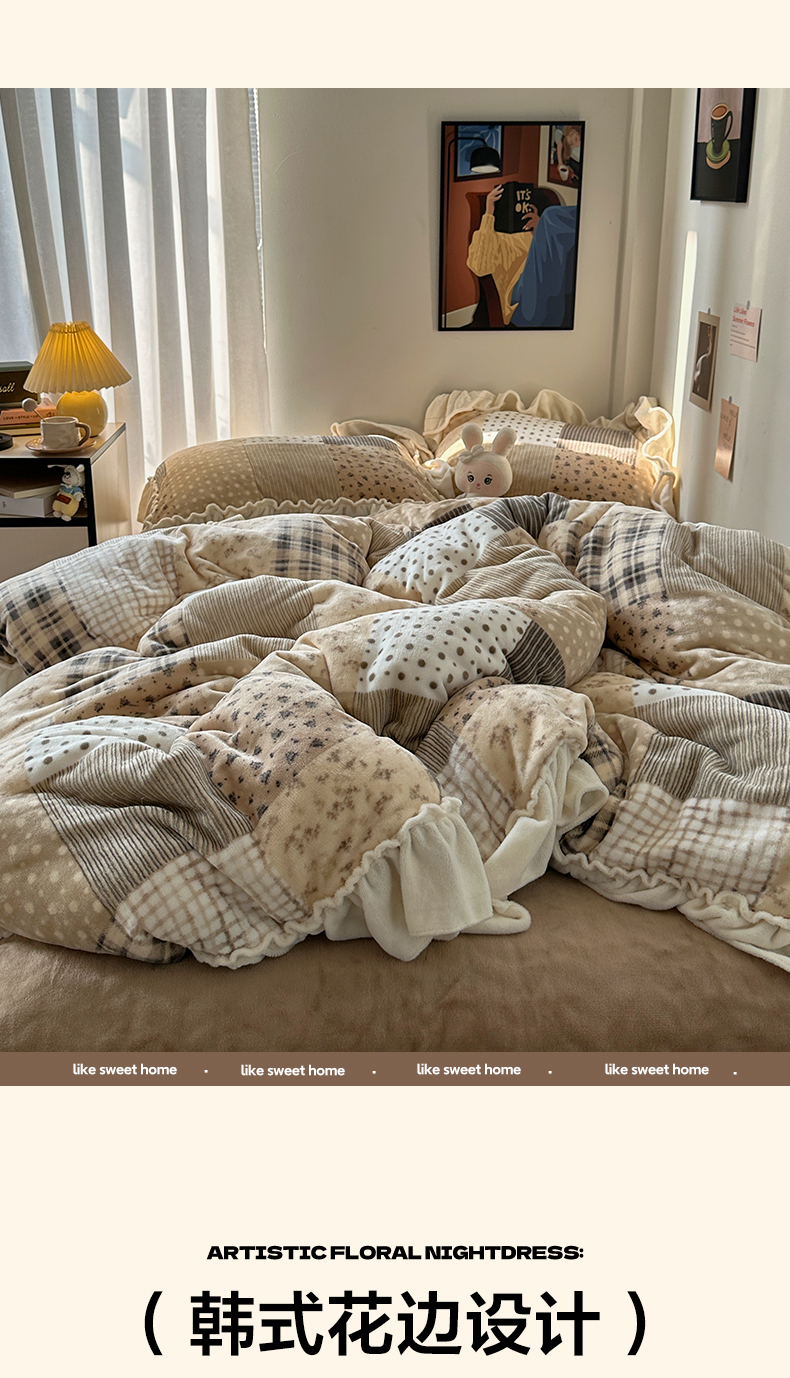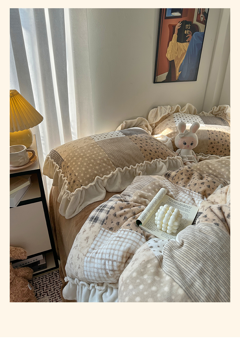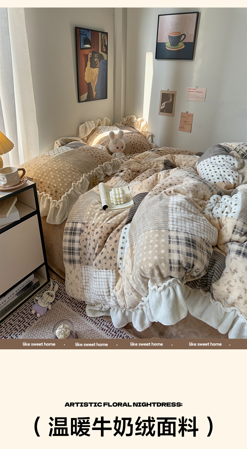 艾咪-Amy ntmy 2025新款博主风花边款牛奶绒四件套-花栖礼 花栖礼-咖