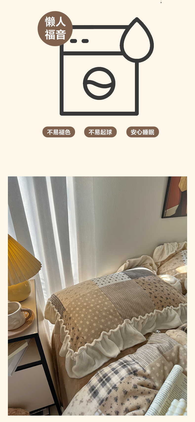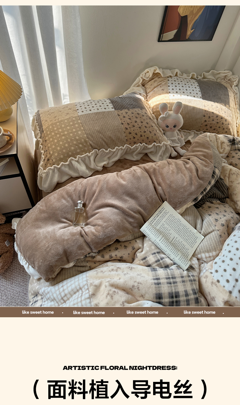 商品名称:艾咪-Amy ntmy 2025新款博主风花边款牛奶绒四件套-花栖礼 花栖礼-咖