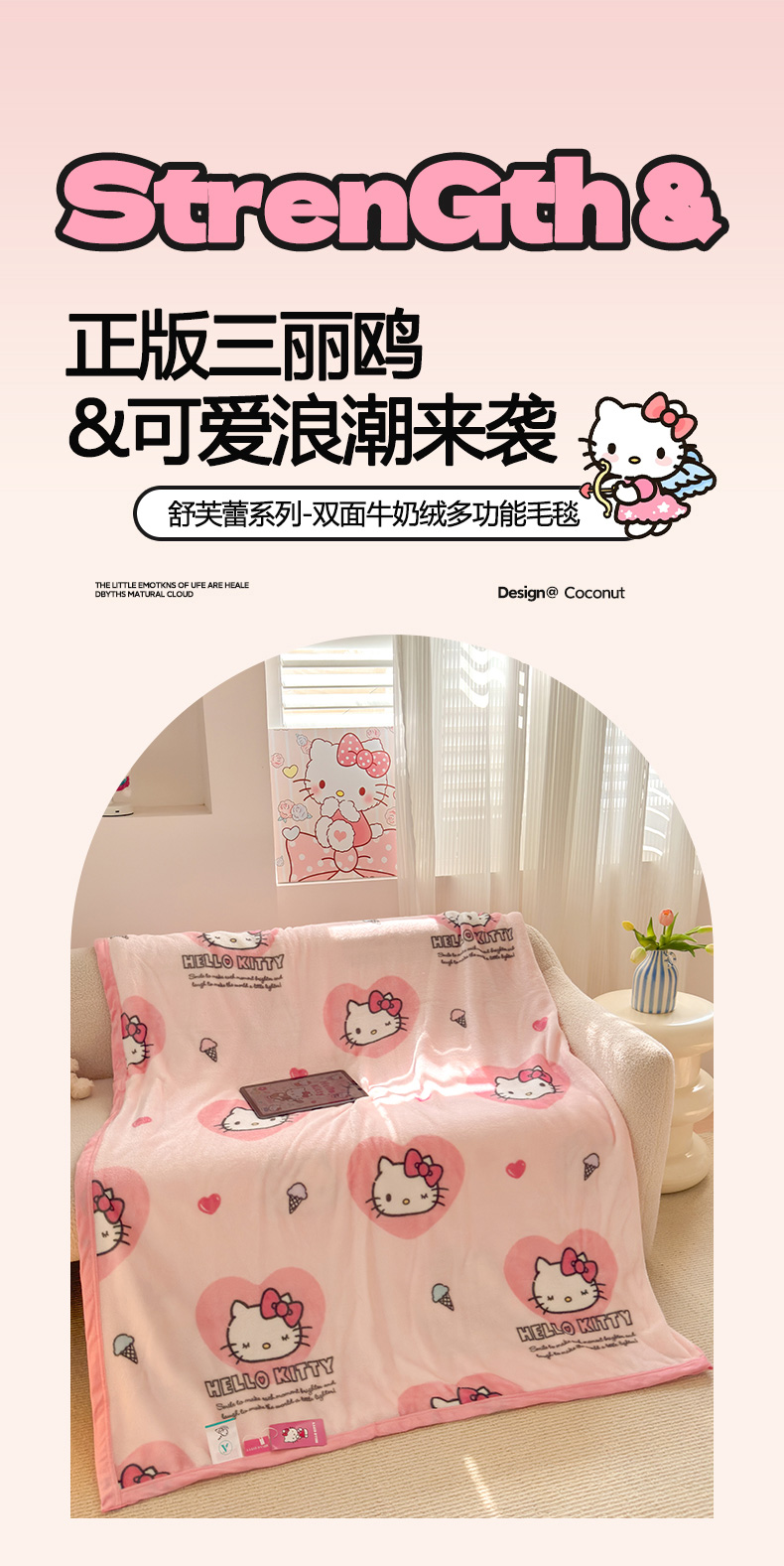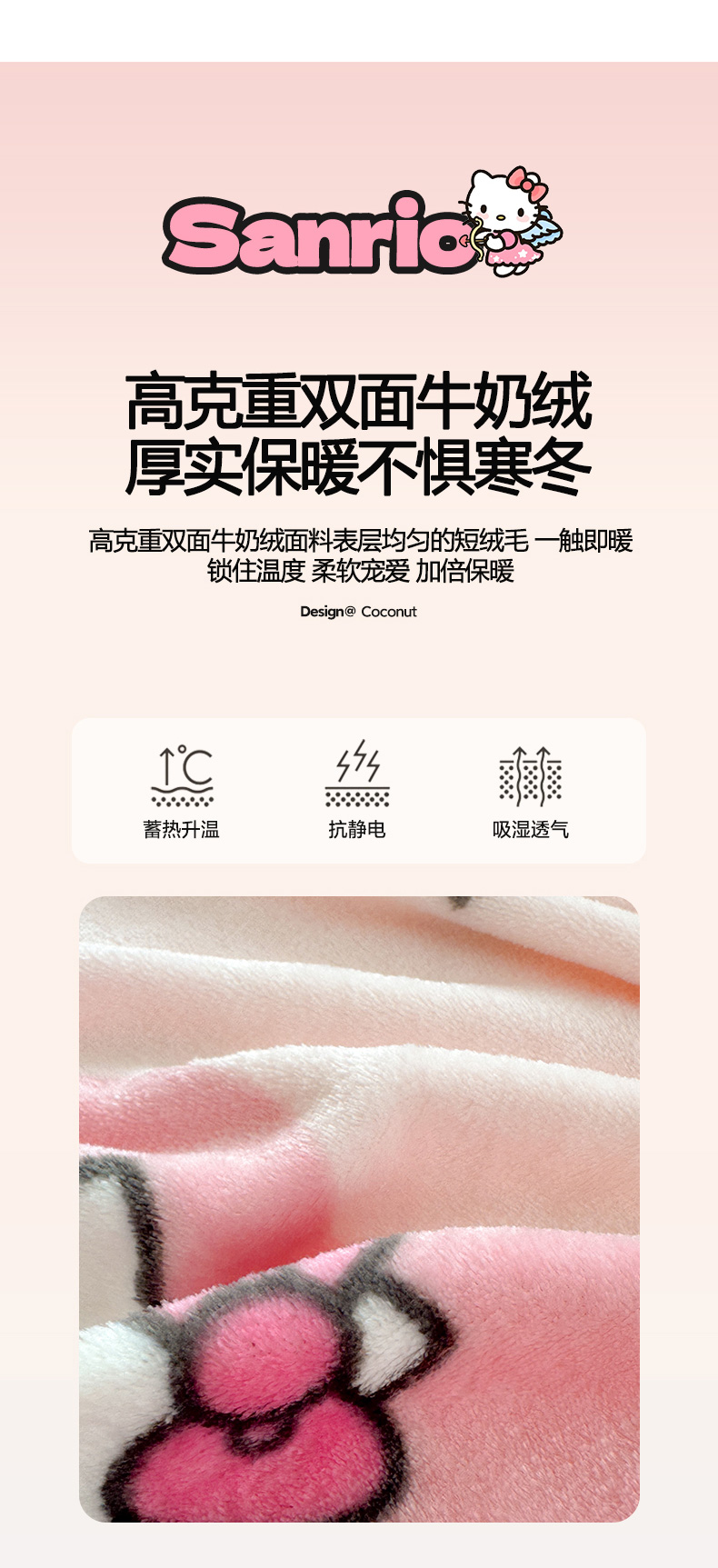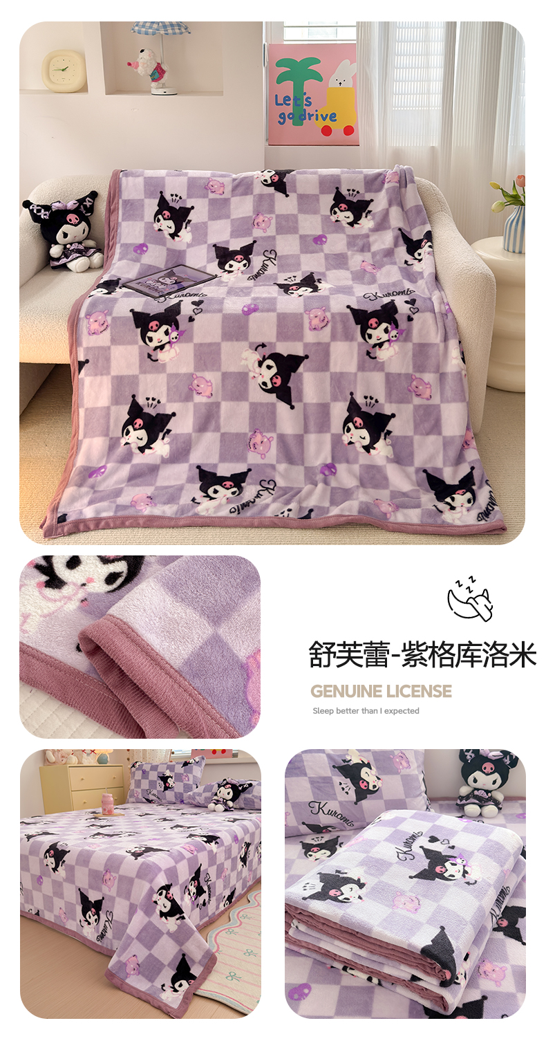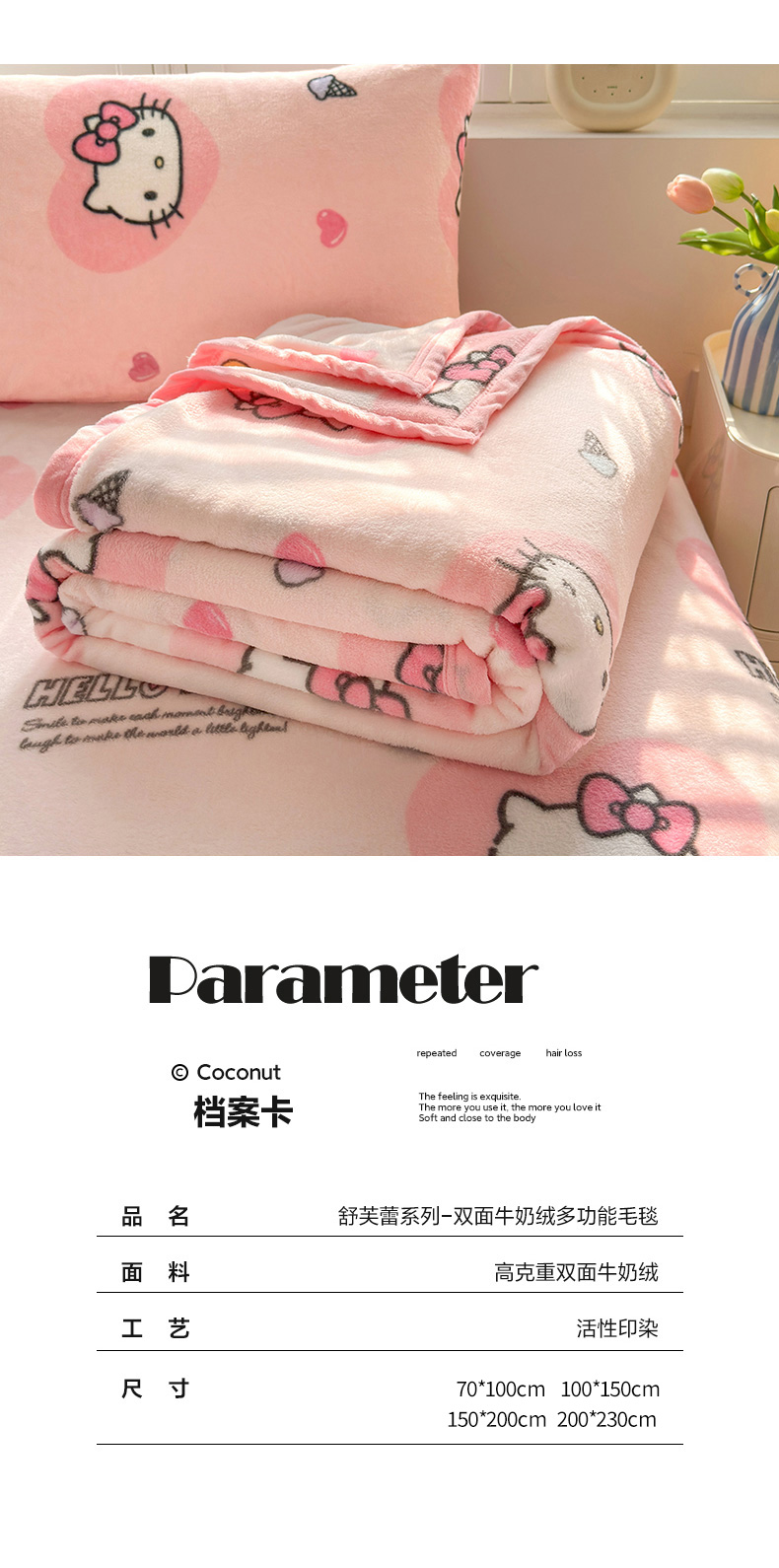 商品名称:初念 2025新款正版三丽鸥双面印花牛奶绒多功能四季款毛毯空调毯(撸猫触感,双倍柔软)(提供买家秀) 舒芙蕾-软萌KT