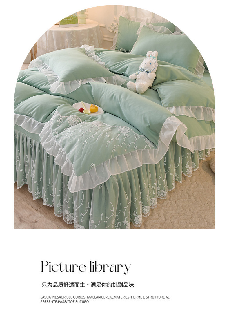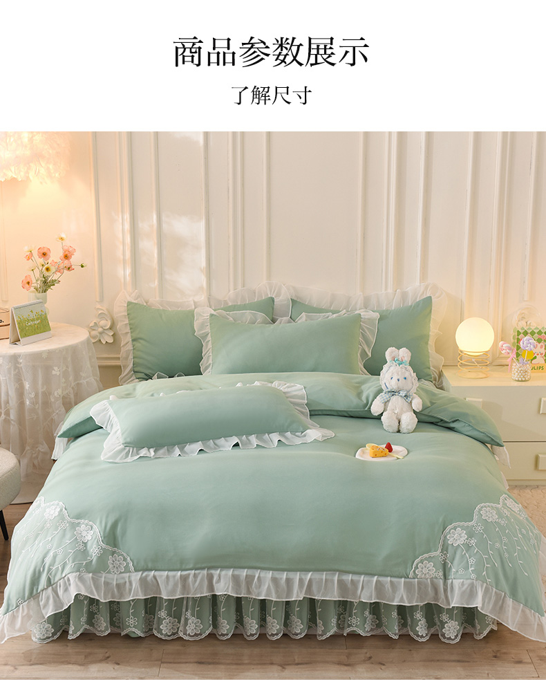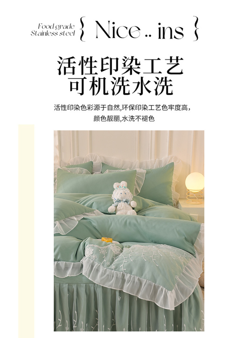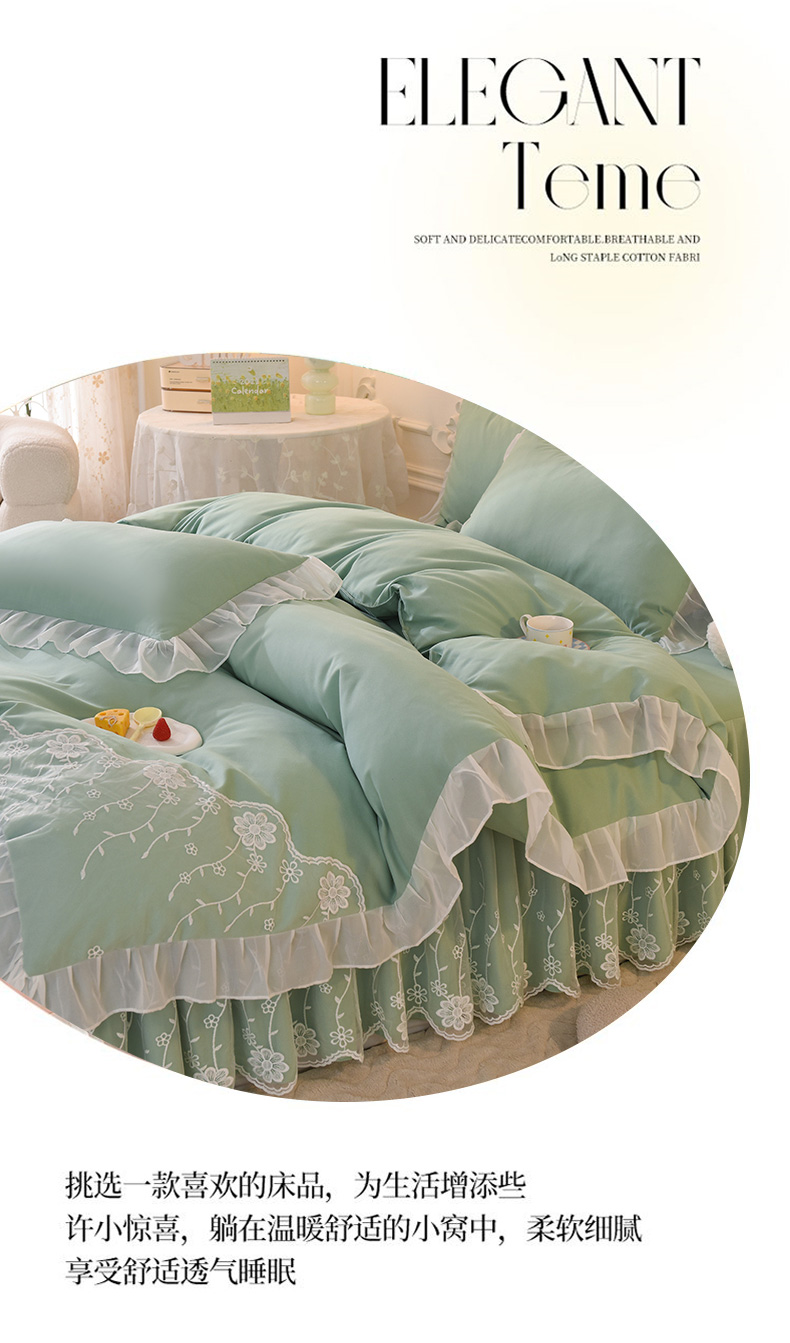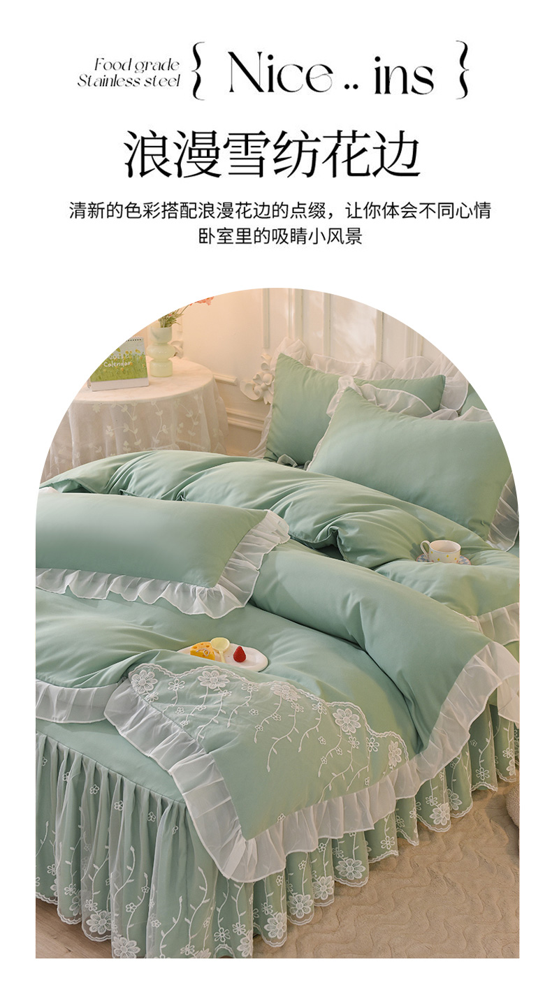 商品名称:后庭寝室 2025新款亲肤雪纺花边刺绣蕾丝公主四件套-花香系列 花香-奶绿