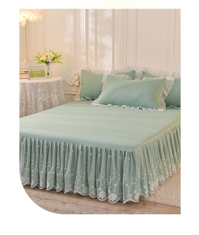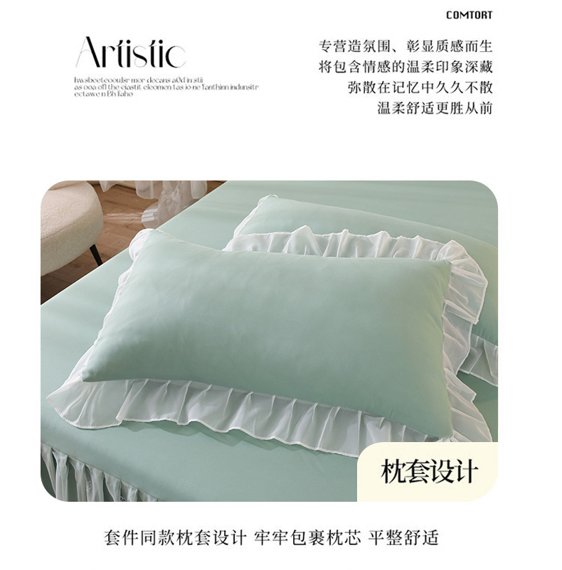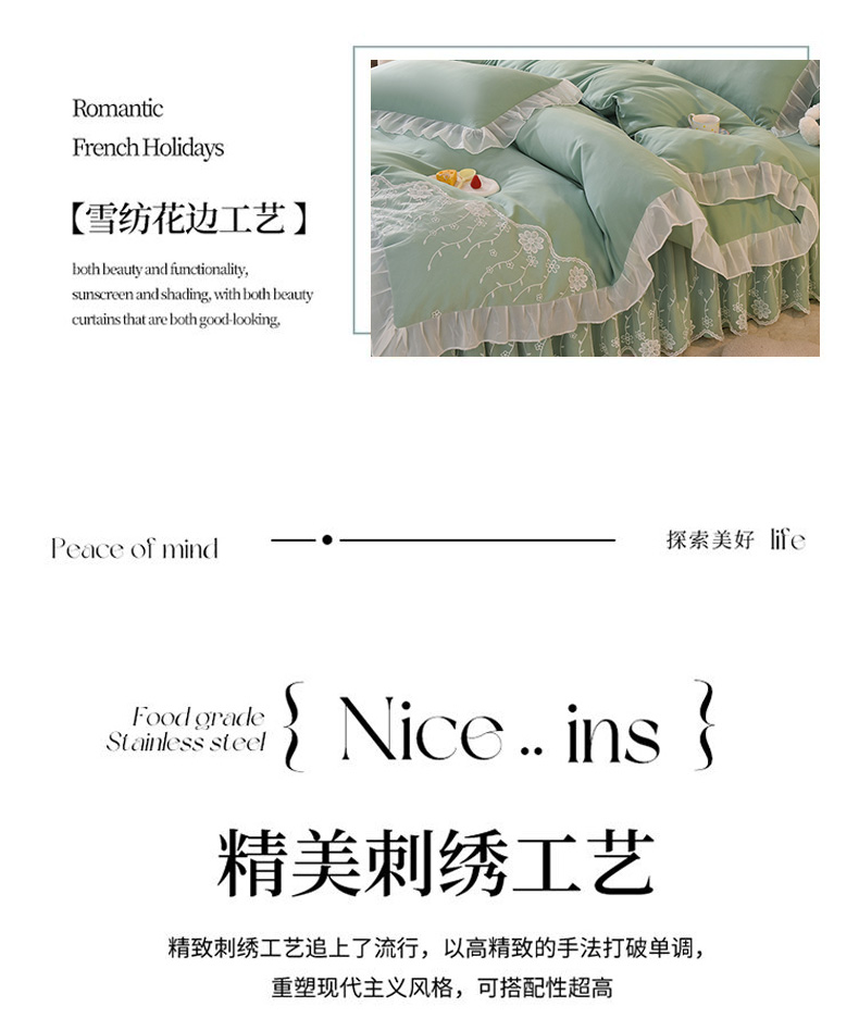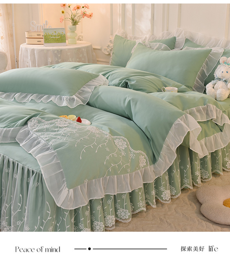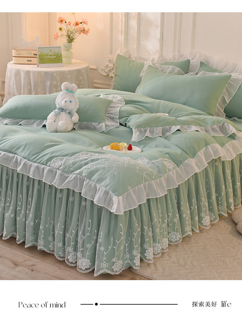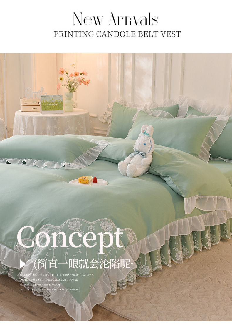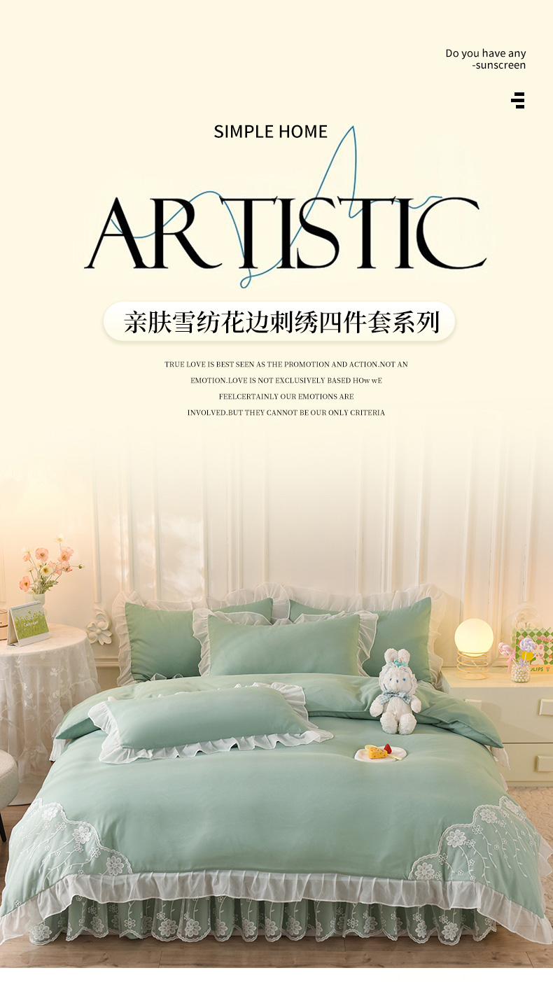 商品名称:后庭寝室 2025新款亲肤雪纺花边刺绣蕾丝公主四件套-花香系列 花香-奶绿