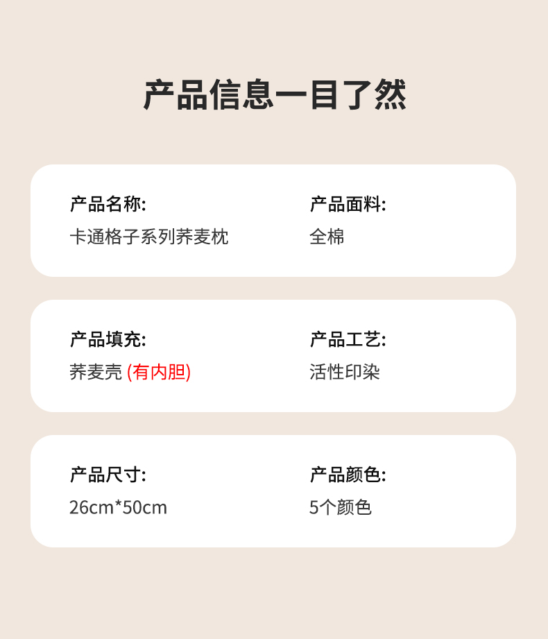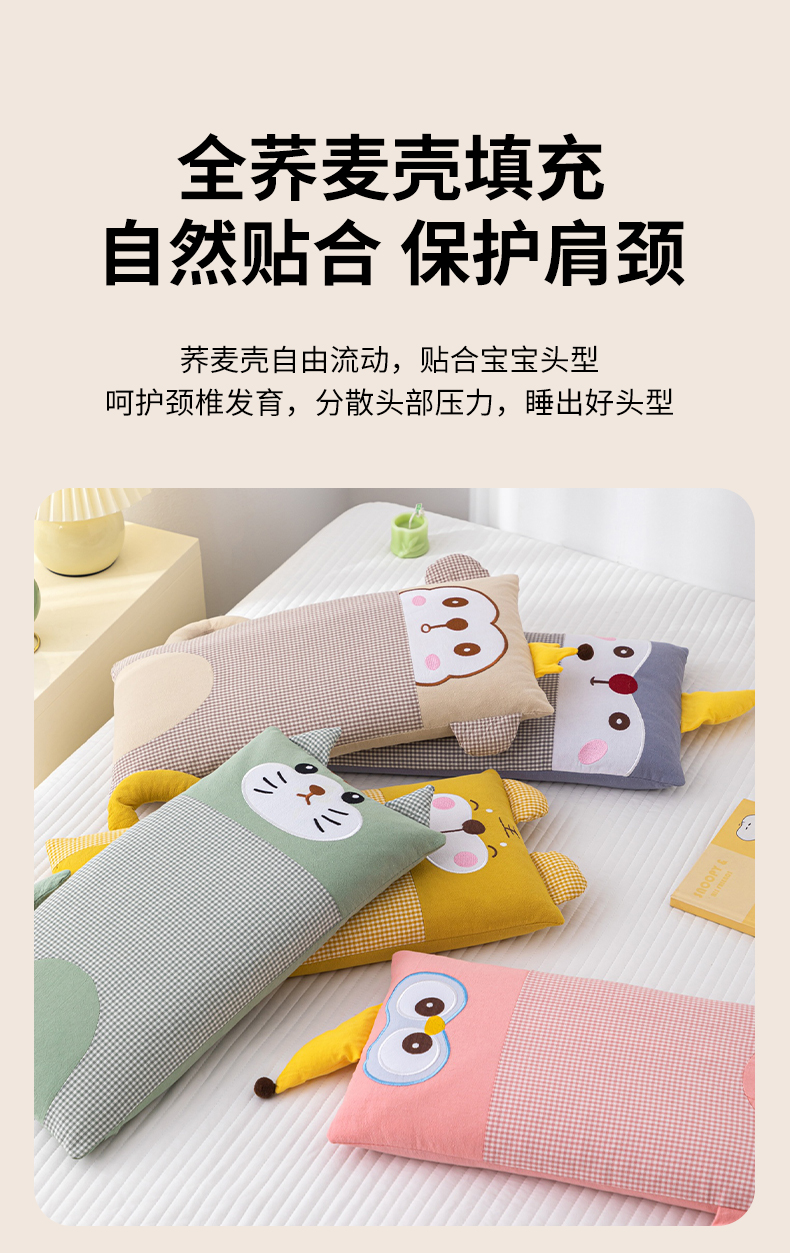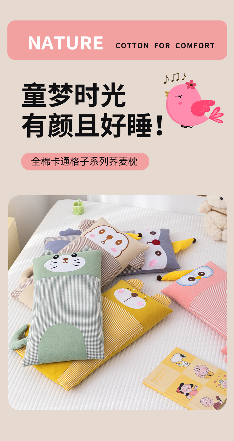 商品名称:(总)仁宇枕业 2025新款全棉纯棉卡通格子儿童荞麦枕枕头枕芯