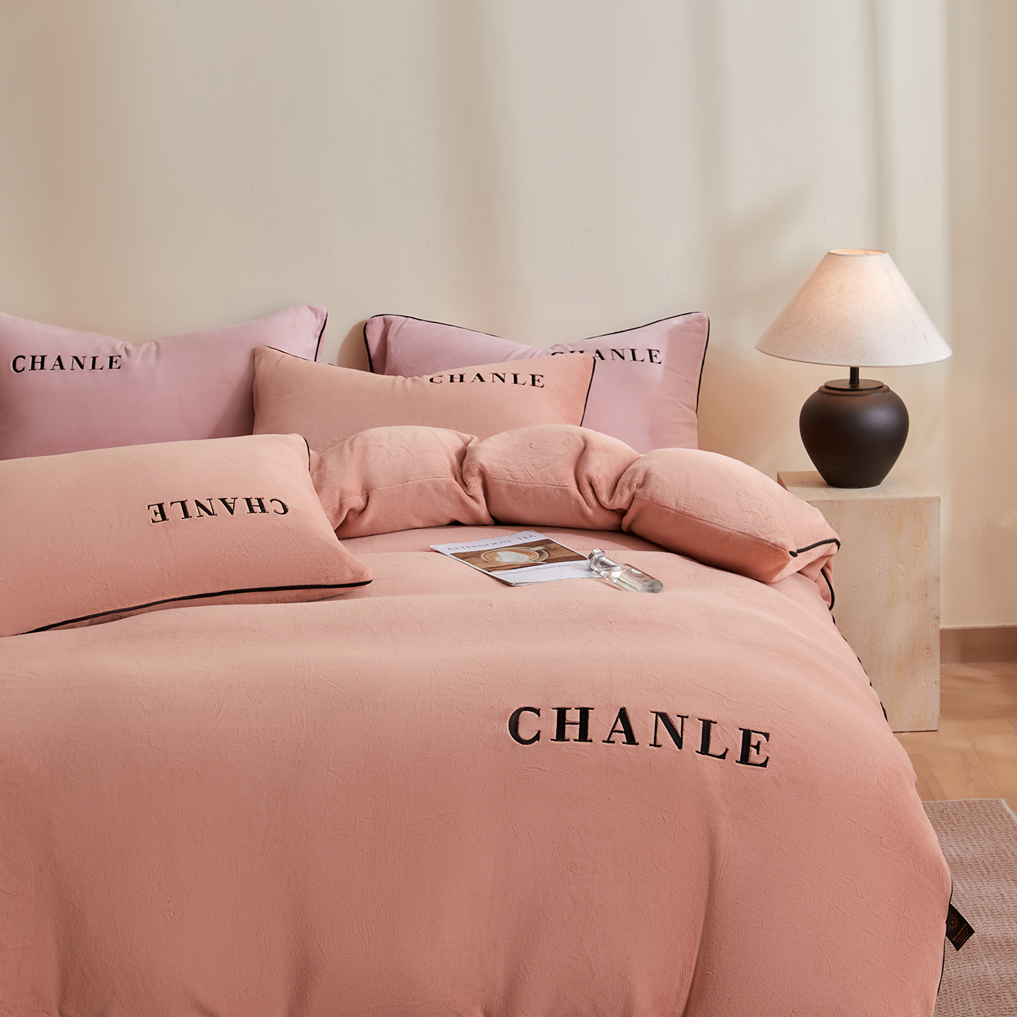 商品名称:锦禾穗 2025新款240克全消光母婴A类牛奶绒刺绣四件套-莫妮 粉色