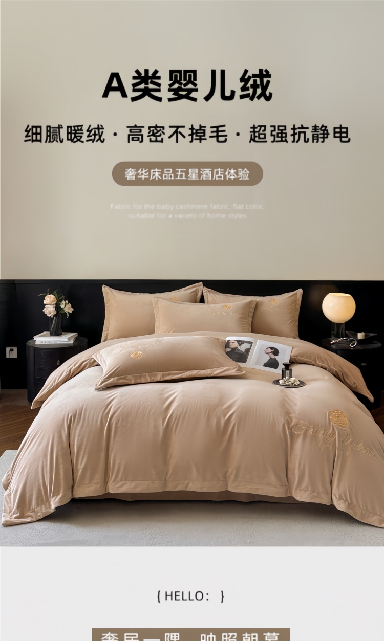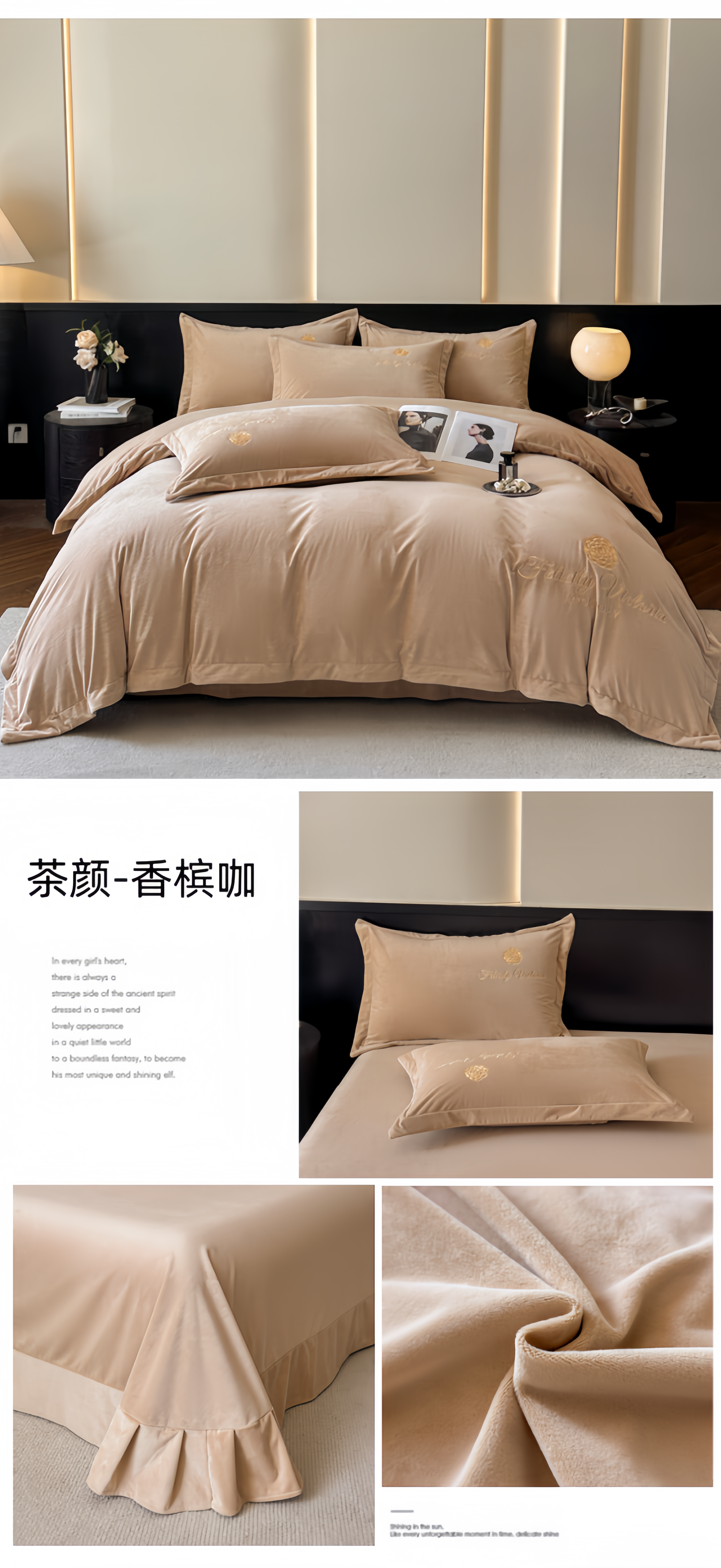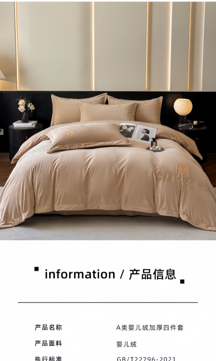 商品名称:鸿织源2025新款-茶颜系列 宝宝绒宽边四件套 茶颜-香槟咖