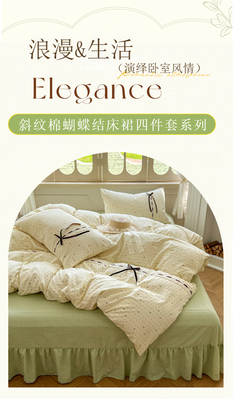商品名称:老K (原美阁) 2025新款床裙款蝴蝶结细丝斜纹韩版四件套 绿色蝴蝶结