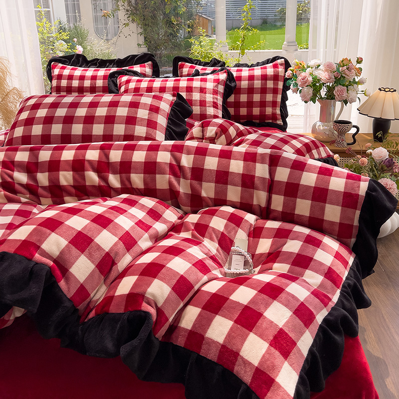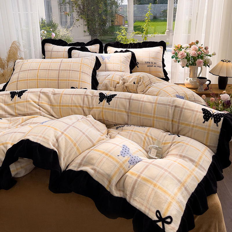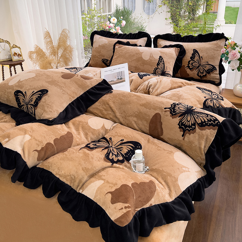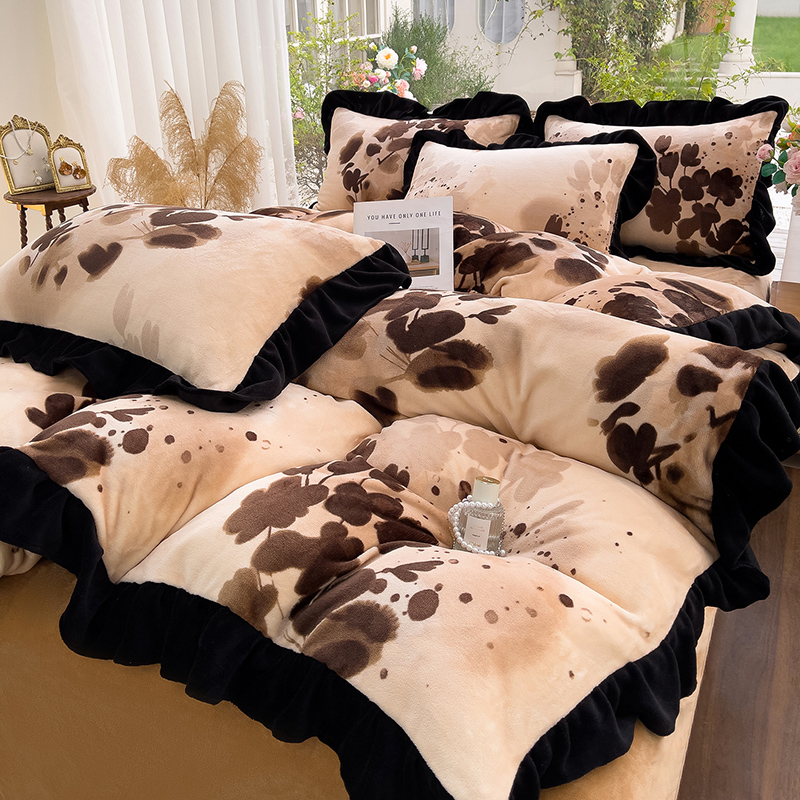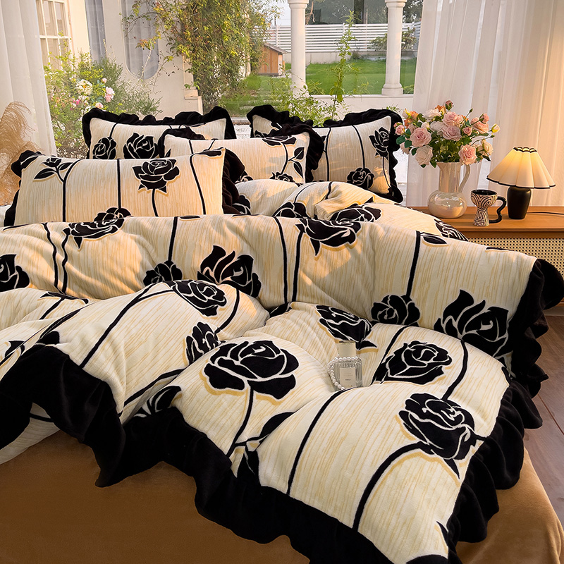 (总)赛丽雅 2025新款赫本风牛奶绒床裙款黑色花边四件套花边款 8-9 斤加厚面料,红杉,芳菲,幻蝶,漫花,墨染,墨舞,沐夏,暖阳,秋日,紫澜