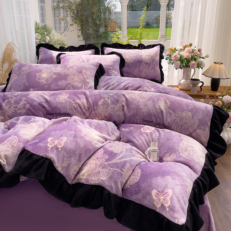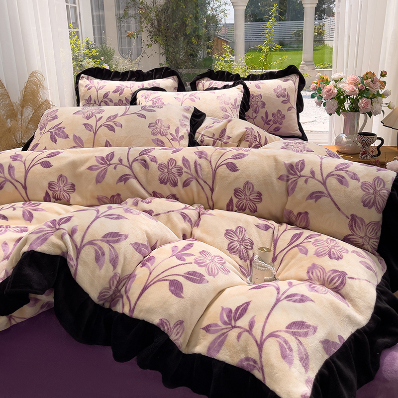 商品名称:赛丽雅 2025新款赫本风牛奶绒床裙款黑色花边四件套花边款 8-9 斤加厚面料 紫澜