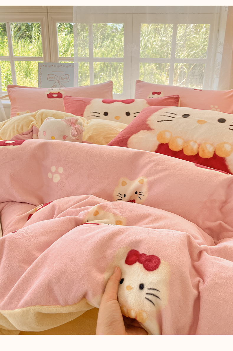 如一 2025新款高克重卡通印花牛奶绒四件套第三批 猫咪粉