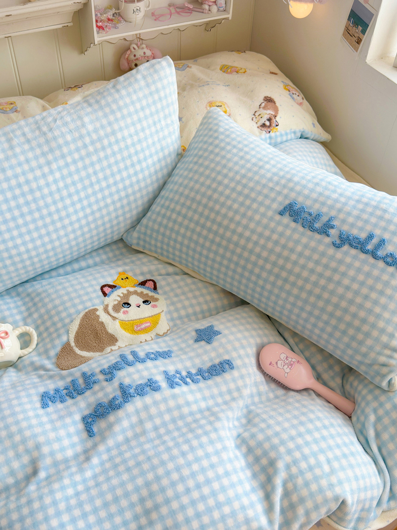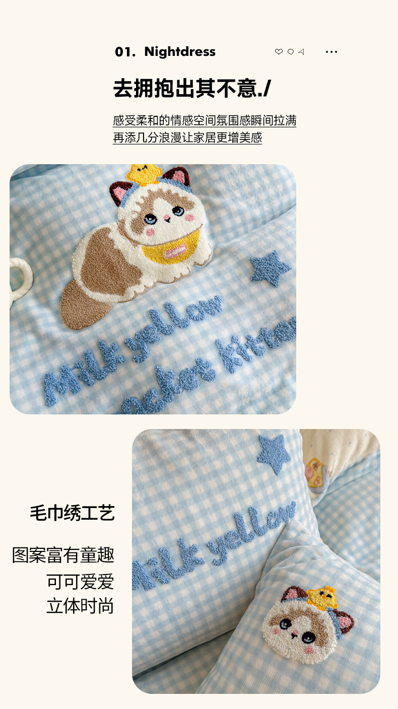 商品名称:Sweet dreams甜梦 2025新款全消光牛奶绒毛巾绣印花四件套 格子小狗