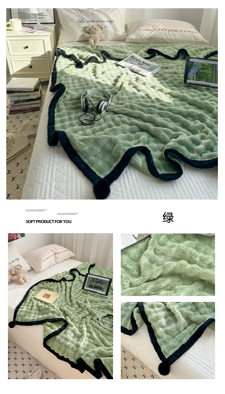 小叮当家纺仓储工厂店 2025新款简约泡泡绒黑球包边毛毯毯子午睡毯 泡泡-米