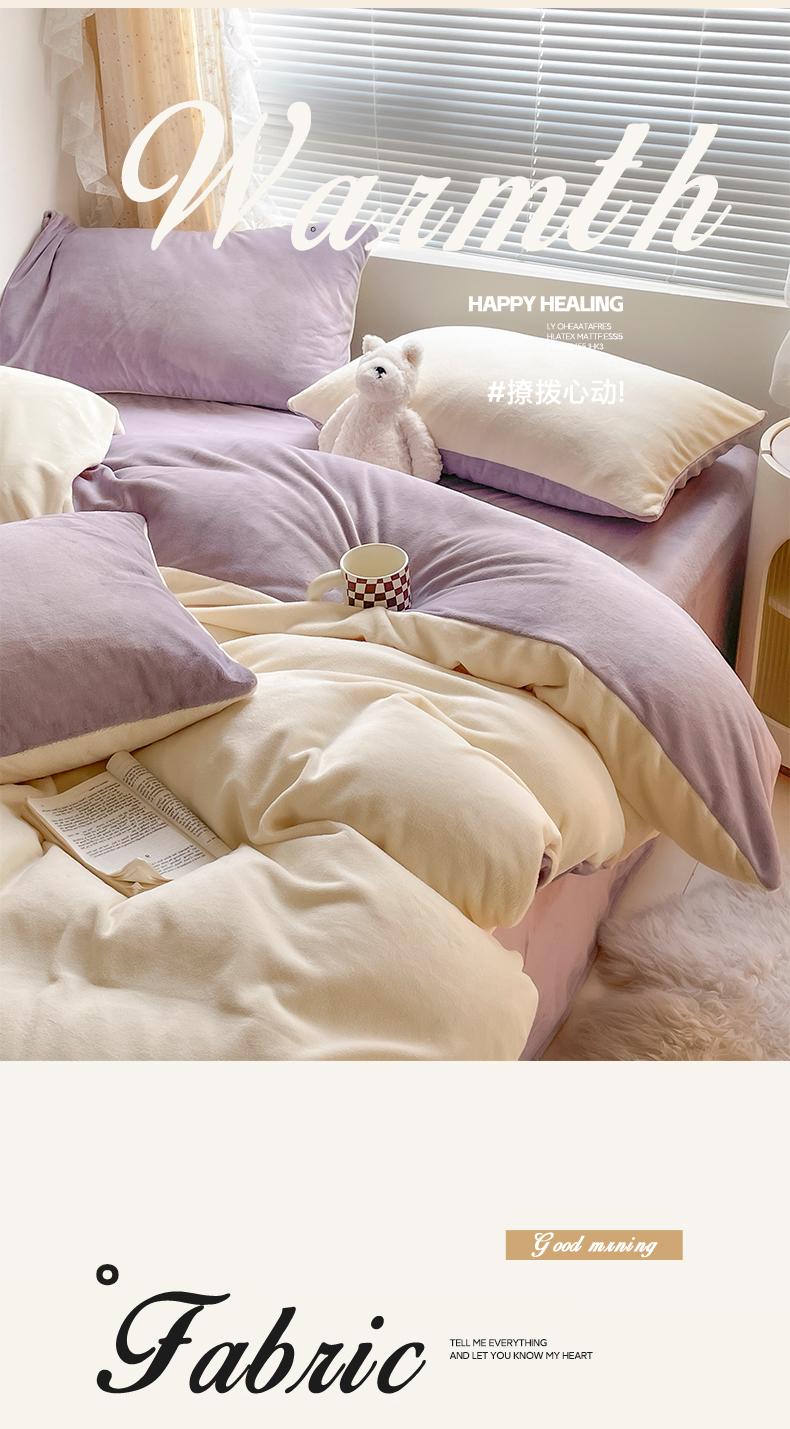 商品名称:小叮当家纺仓储工厂店 2025新款纯色双拼牛奶绒四件套190克 卡尔-奶黄+浅紫
