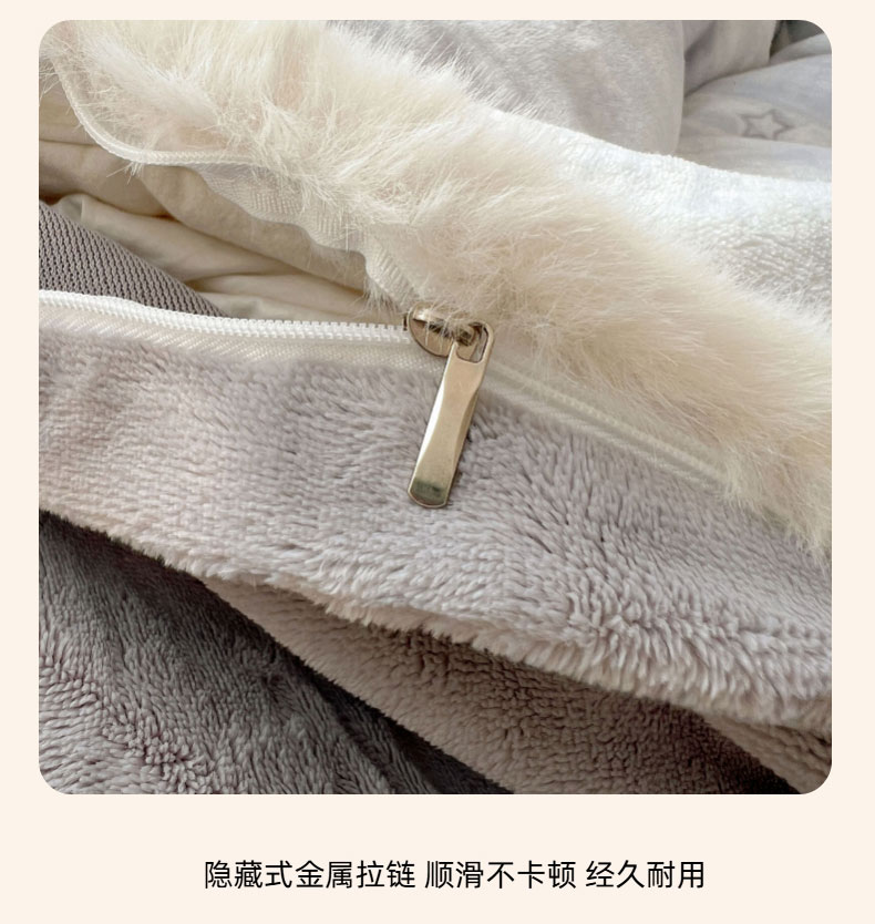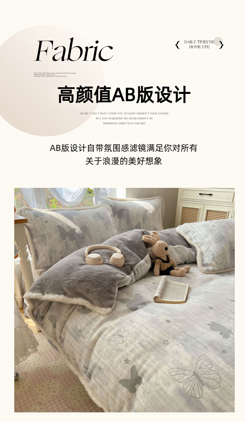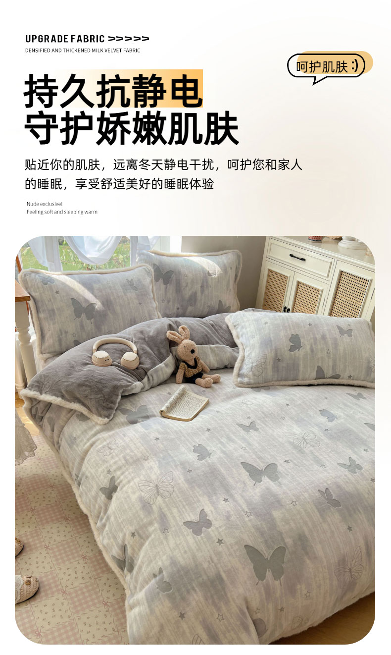 商品名称:十里居 2025新款兔毛条花边款雕花牛奶绒四件套 蝶舞灰