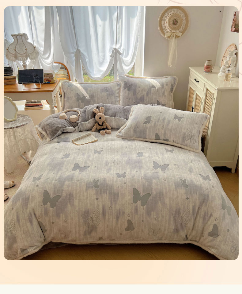 十里居 2025新款兔毛条花边款雕花牛奶绒四件套 蝶舞灰