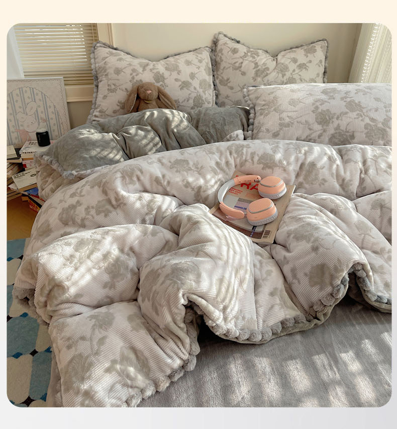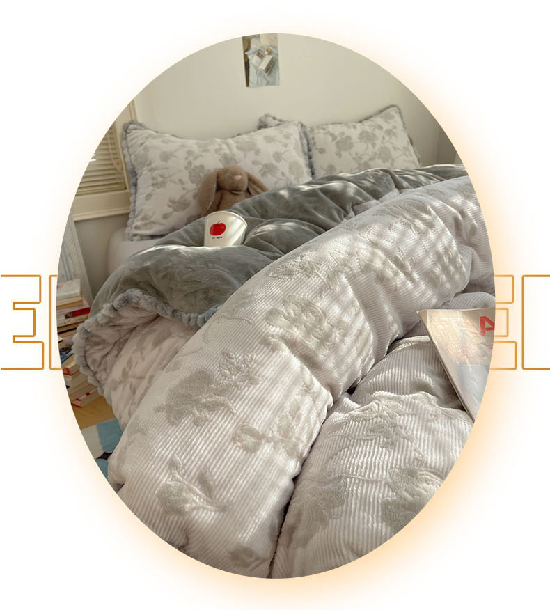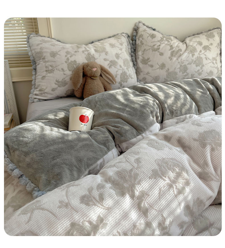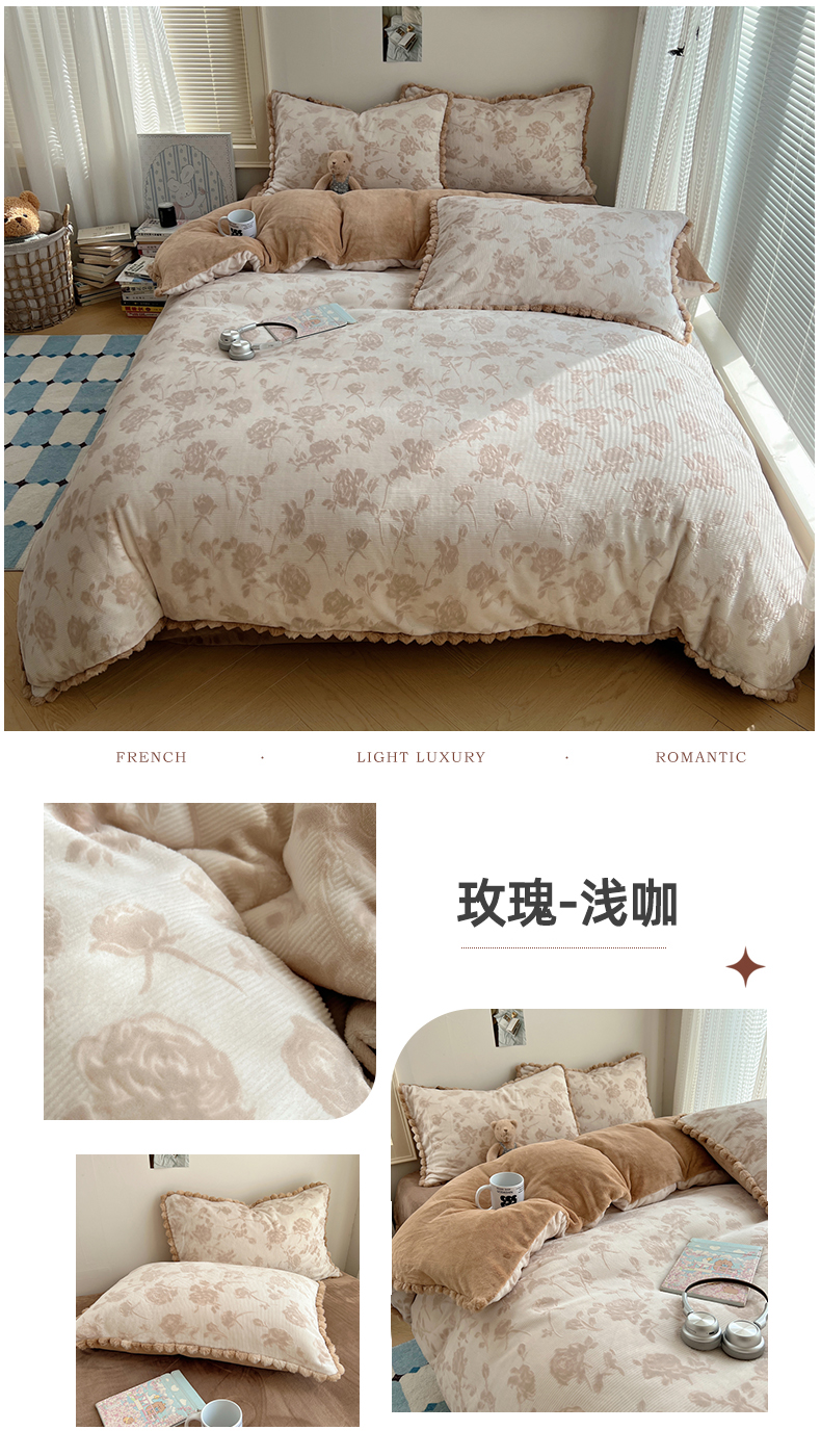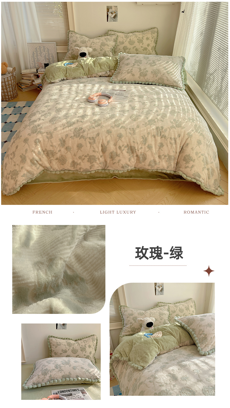 (总)十里居 2025新款法式复古兔毛球雕花牛奶绒四件套,玫瑰-灰,玫瑰-粉,玫瑰-绿,玫瑰-浅咖