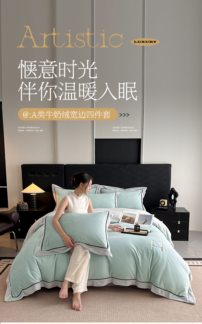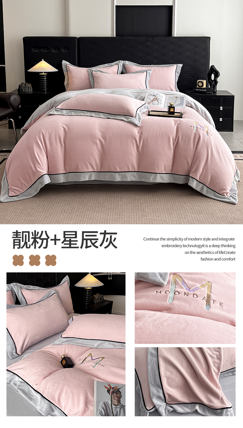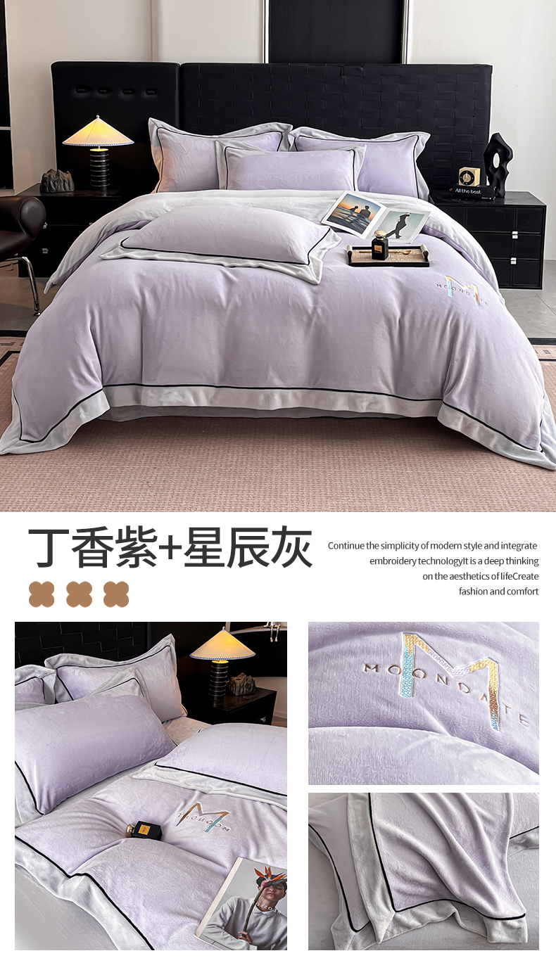 (总)遇见家居生活馆 2025新款A类牛奶绒玛利亚绒宽边四件套(控价:标准178,加大188,床笠款183),靓粉+星辰灰,丁香紫+星辰灰,清澈蓝+星辰灰,奶昔白+亚麻驼,经典灰+香槟,宾利蓝+星辰灰