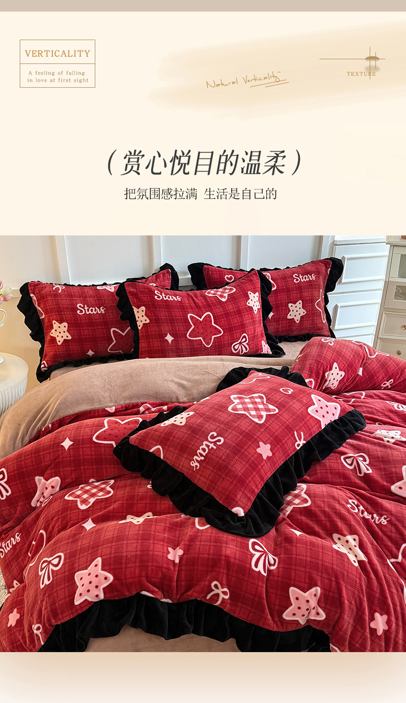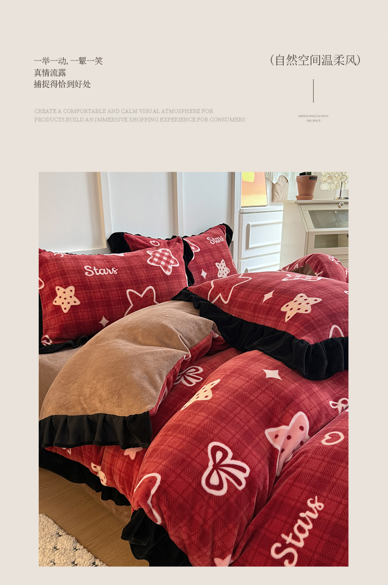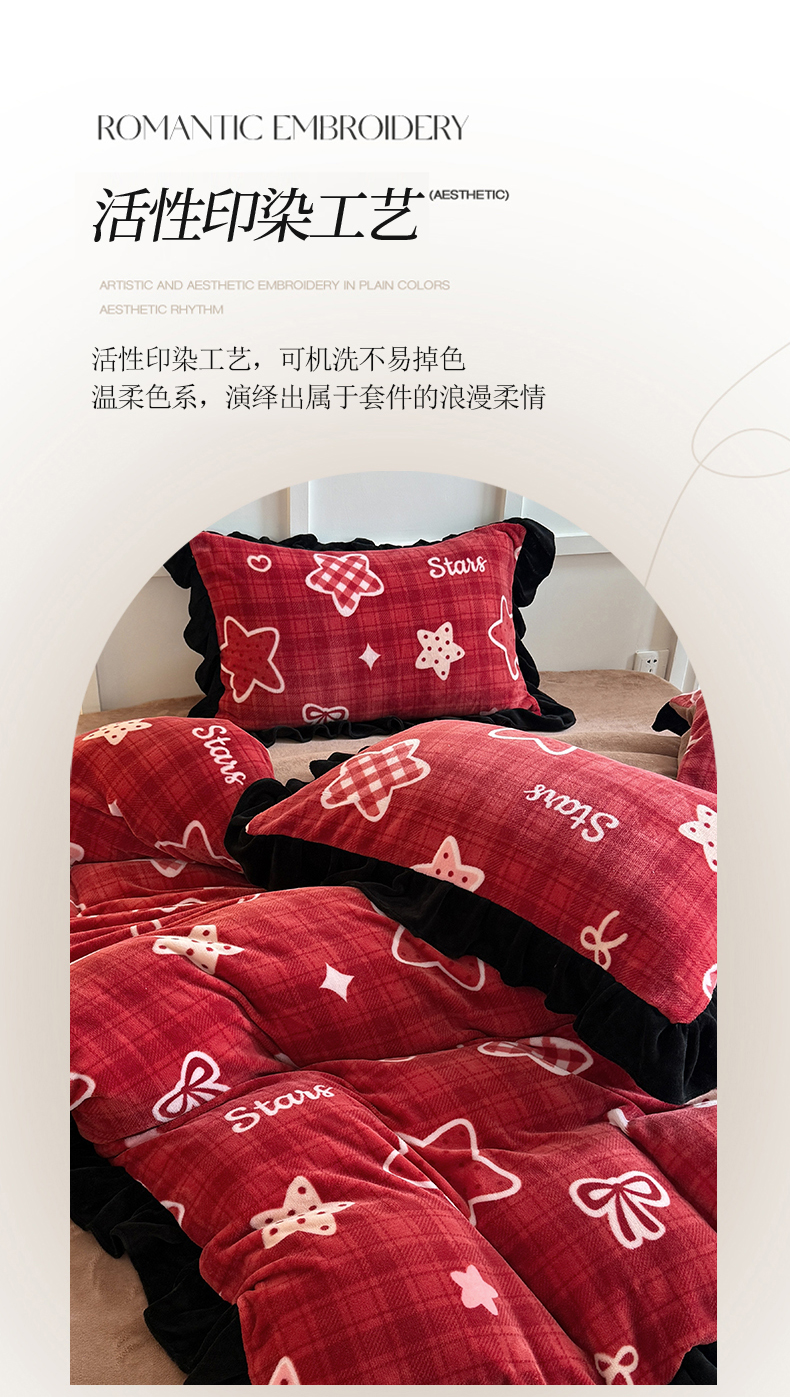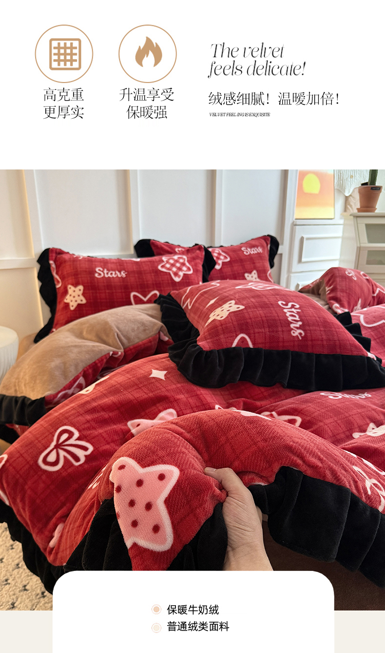 当前位置: 91家纺网 > 商品网购 > 床品套件 > 四件套 > 牛奶绒四件套 > 艾特你 2025新款200g全工艺牛奶绒花边款四件套吊边床单 花边绒-圣诞星星