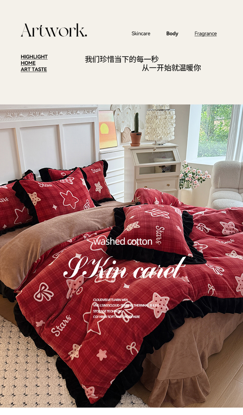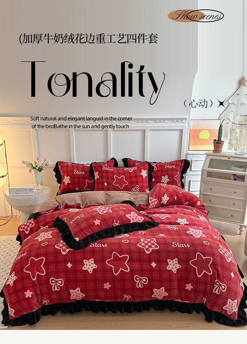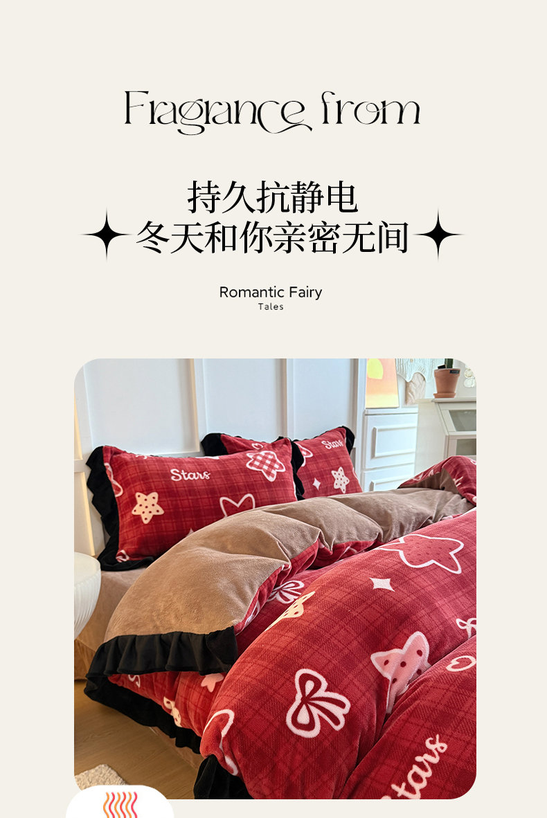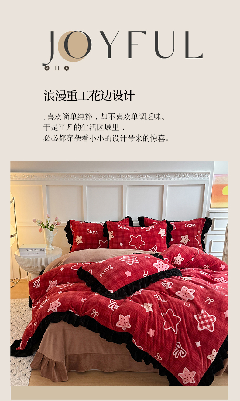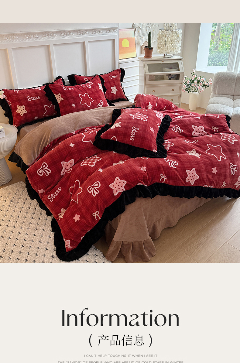 当前位置: 91家纺网 > 商品网购 > 床品套件 > 四件套 > 牛奶绒四件套 > 艾特你 2025新款200g全工艺牛奶绒花边款四件套吊边床单 花边绒-圣诞星星