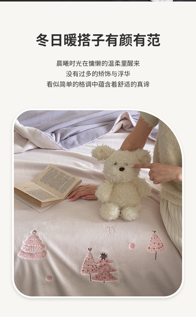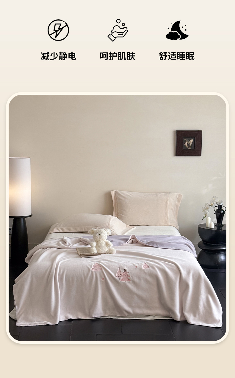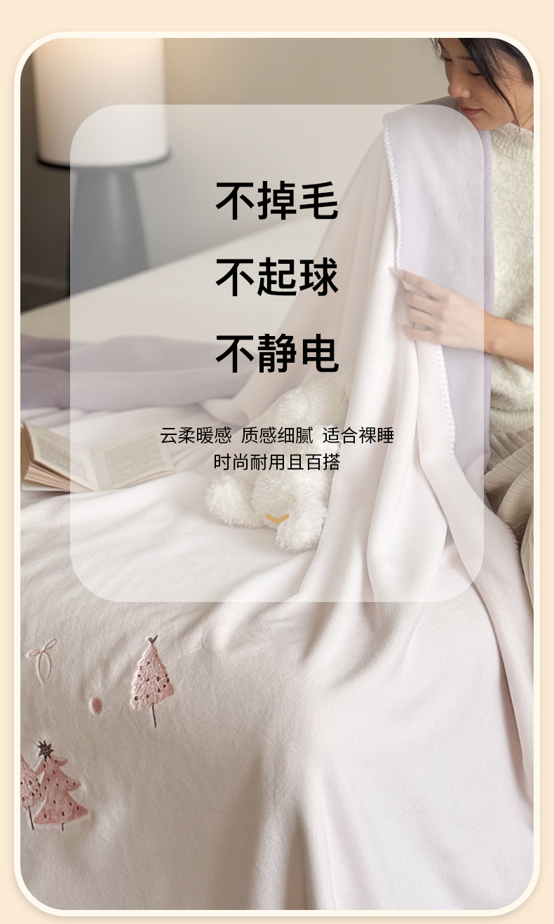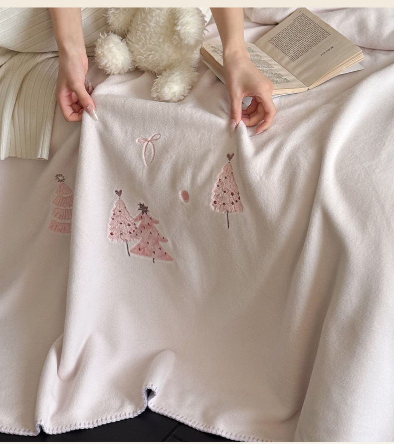 商品名称:云栖家居 2025新品双层加厚高克重消光沙发毯仿羊绒纯色刺绣盖毛毯毯子 圣诞小树-粉