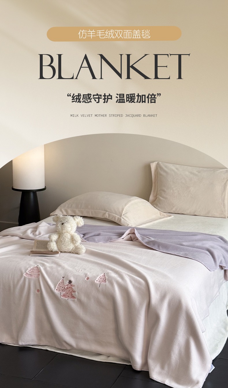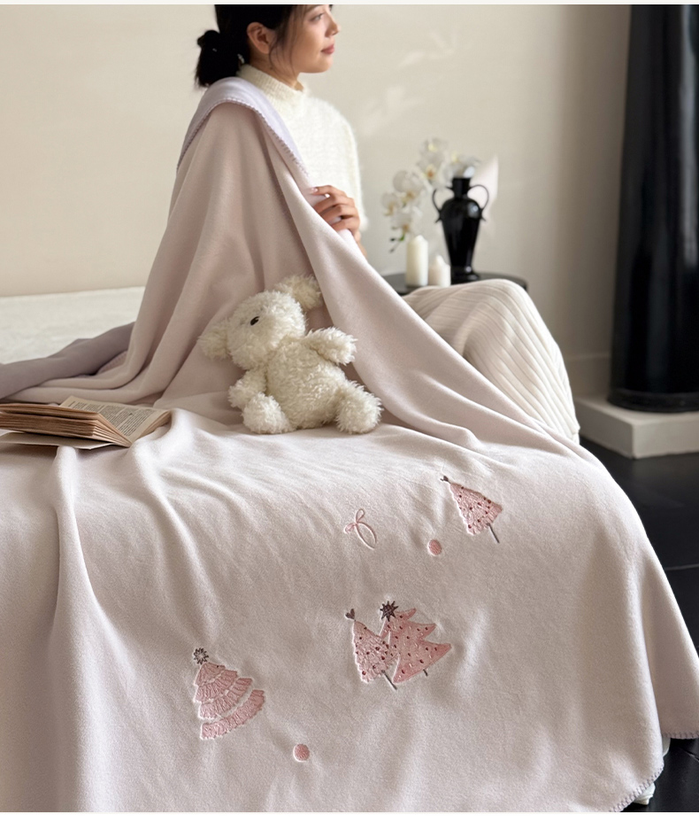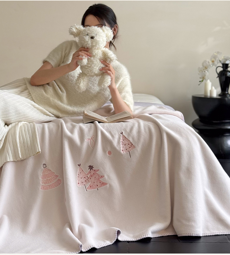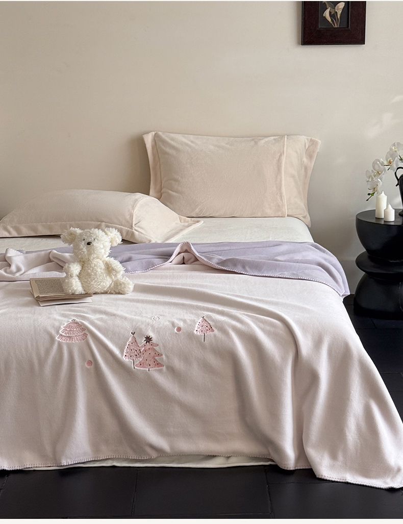 云栖家居 2025新品双层加厚高克重消光沙发毯仿羊绒纯色刺绣盖毛毯毯子 圣诞小树-粉