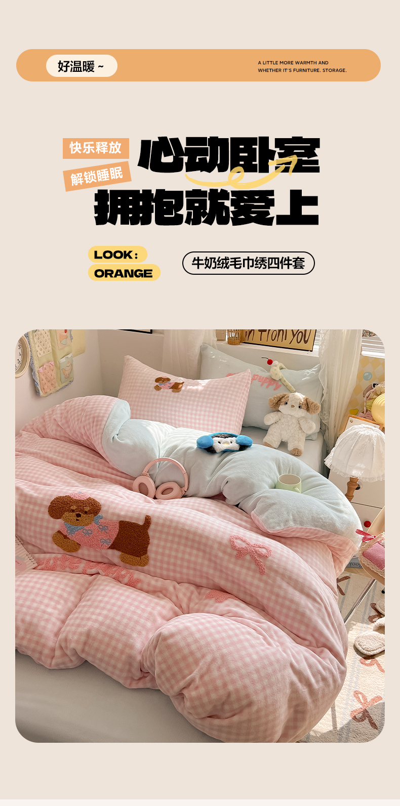 (总)韩都家居 2025新款高克重萌系牛奶绒毛巾绣四件套,可爱猫咪,帕帕狗,毛毛狗,欢乐仔仔