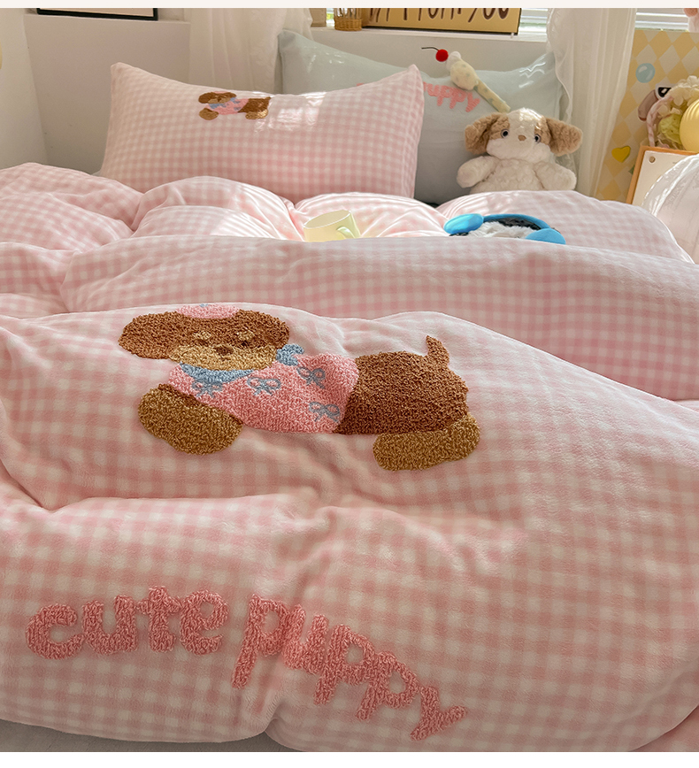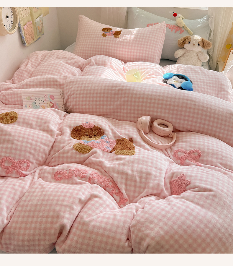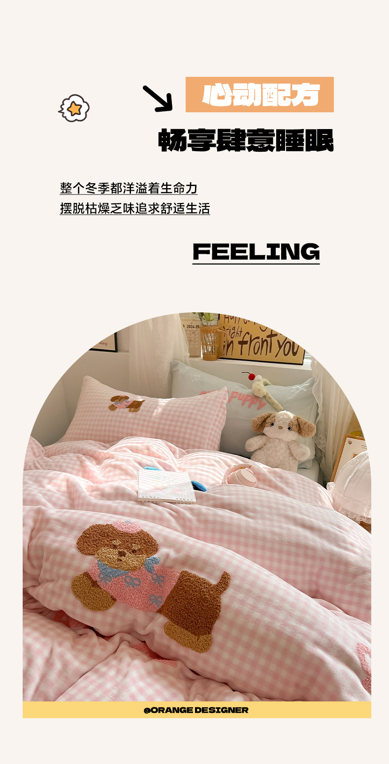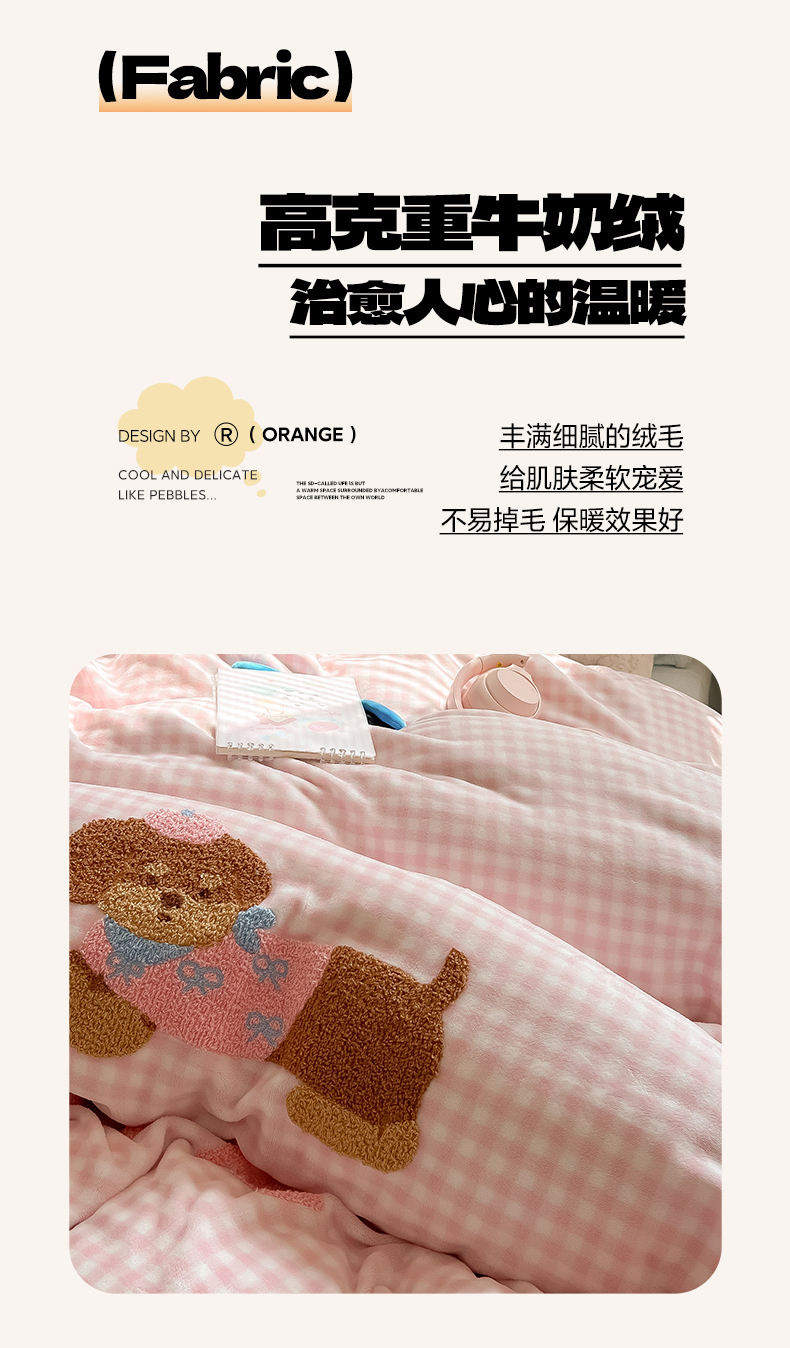 (总)韩都家居 2025新款卡通贴布绣系列加厚牛奶绒四件套,乖乖兔,冬日猫咪,苹果狗狗,绅士小狗,顽皮西高地,幸运小熊