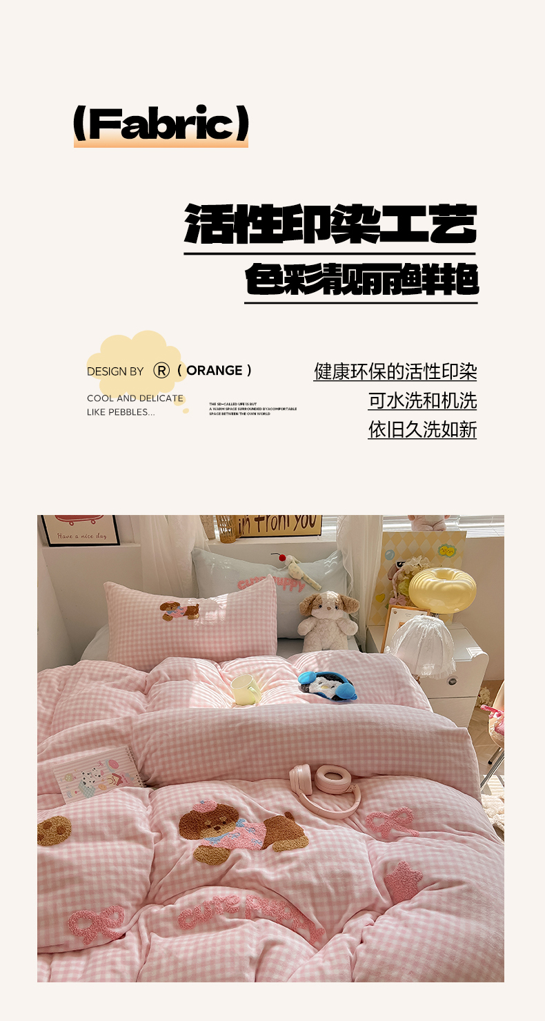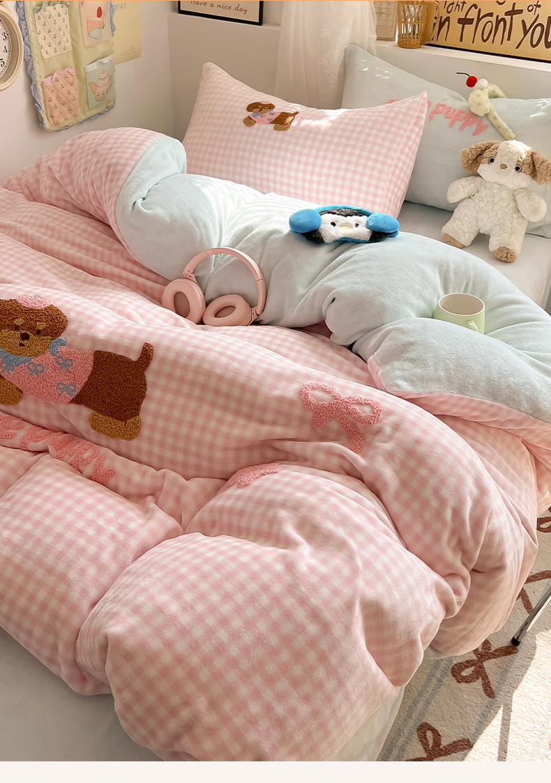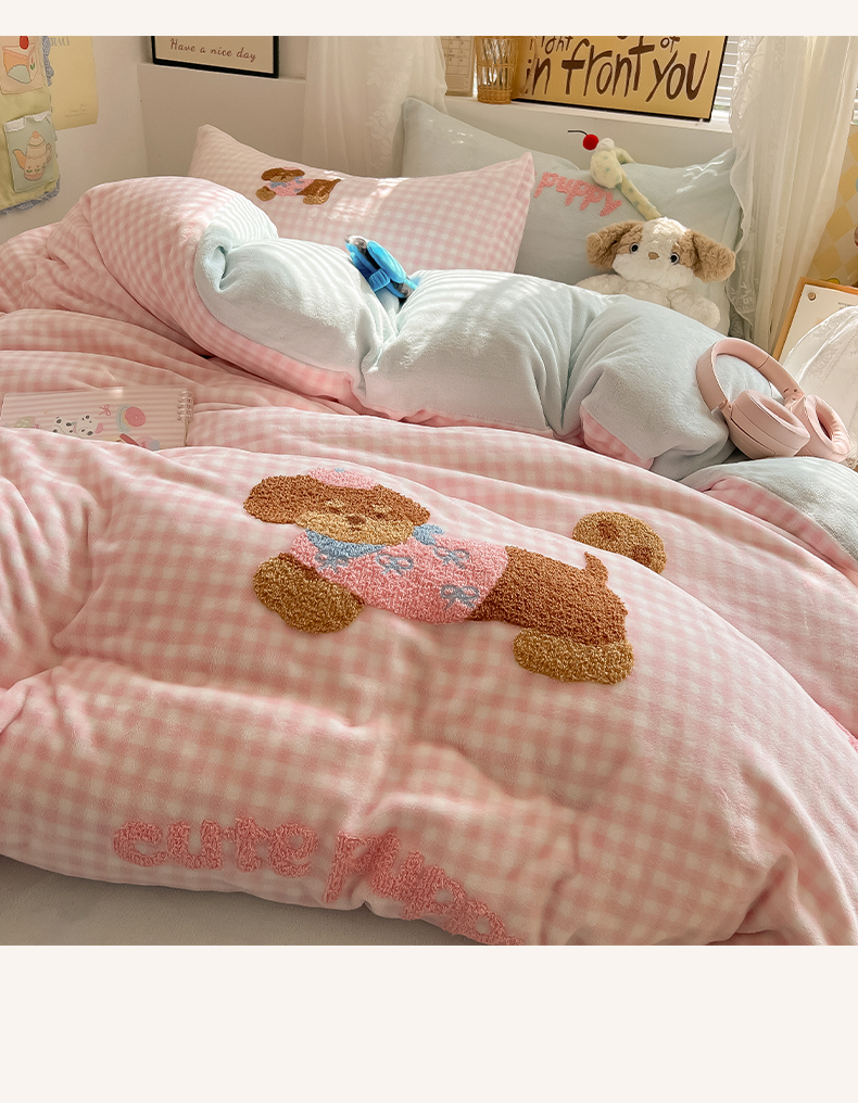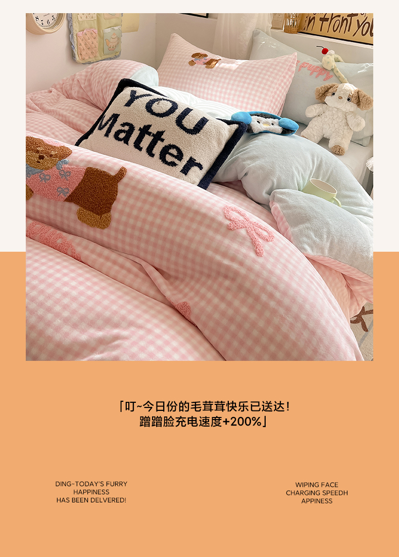 (总)韩都家居 2025新款卡通贴布绣系列加厚牛奶绒四件套,乖乖兔,冬日猫咪,苹果狗狗,绅士小狗,顽皮西高地,幸运小熊