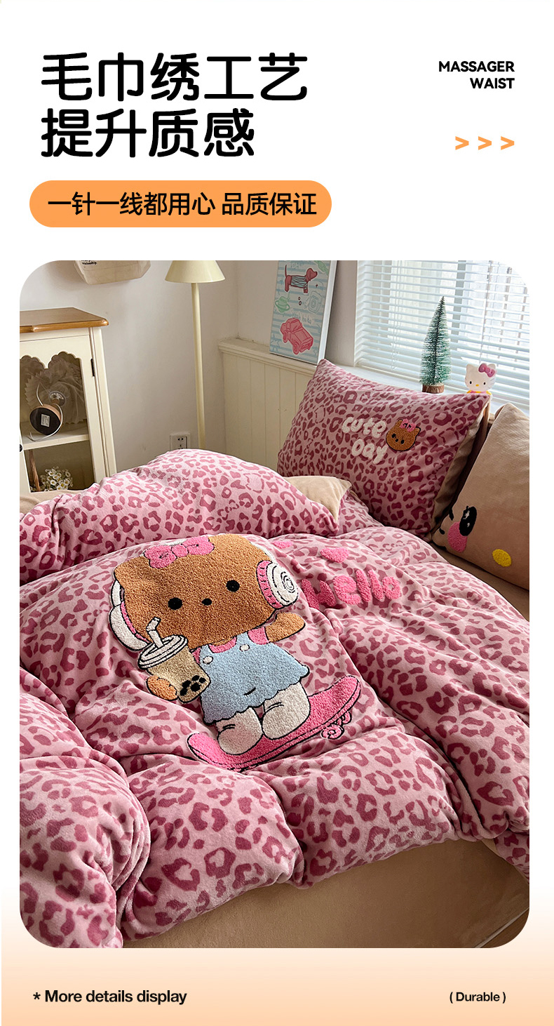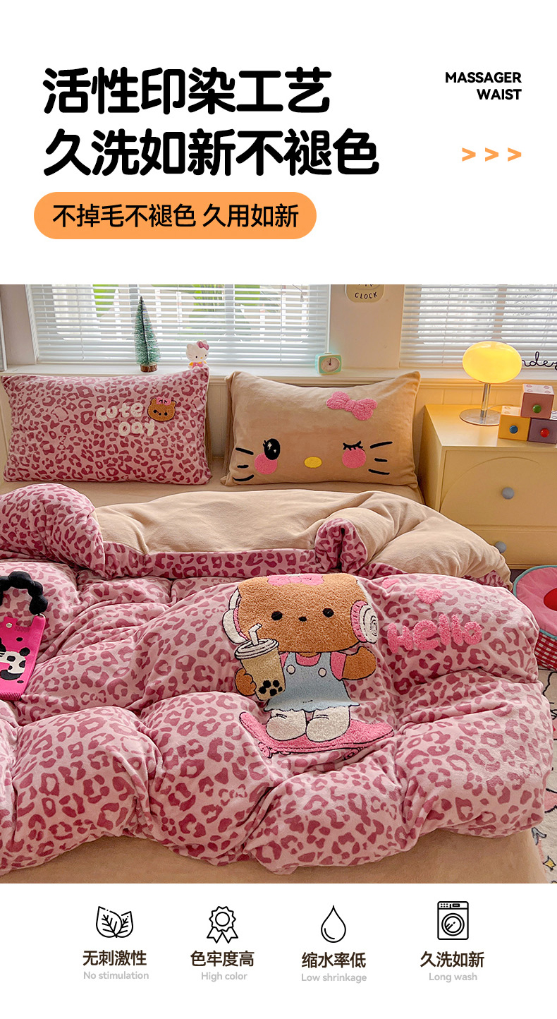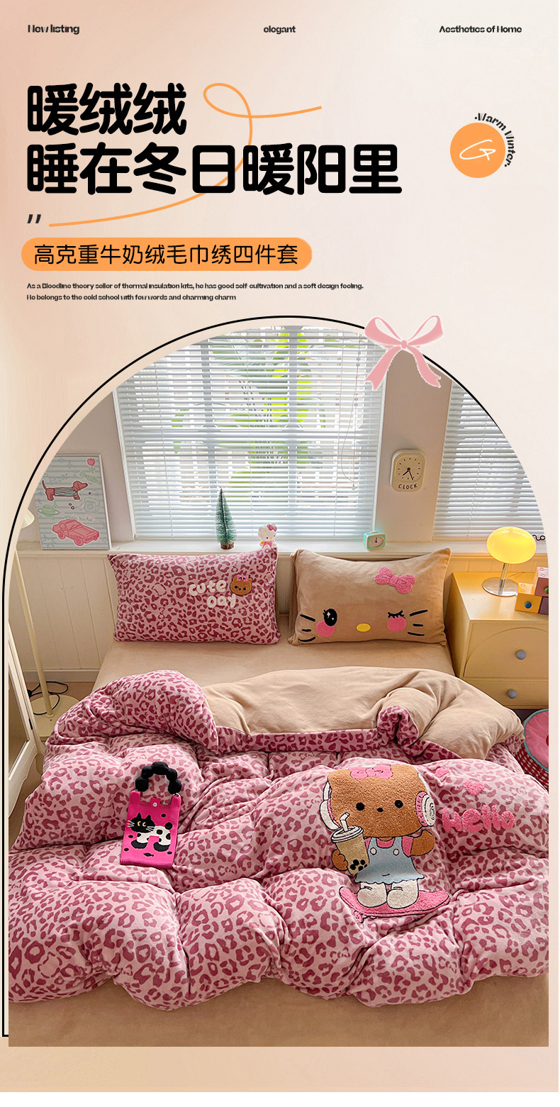 当前位置: 91家纺网 > 商品网购 > 床品套件 > 四件套 > 牛奶绒四件套 > 优选 2025新款高克重200g牛奶绒数码印花毛巾绣卡通四件套直播爆款电商爆款 黑皮粉