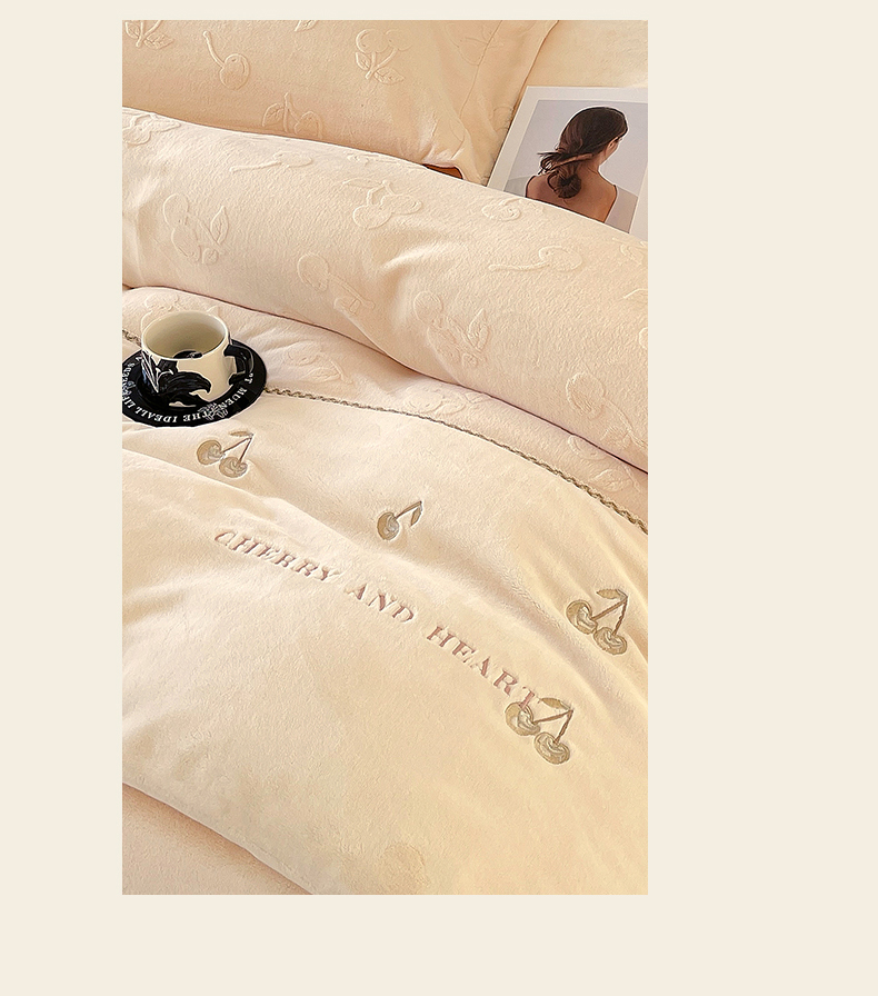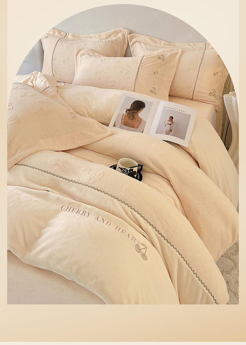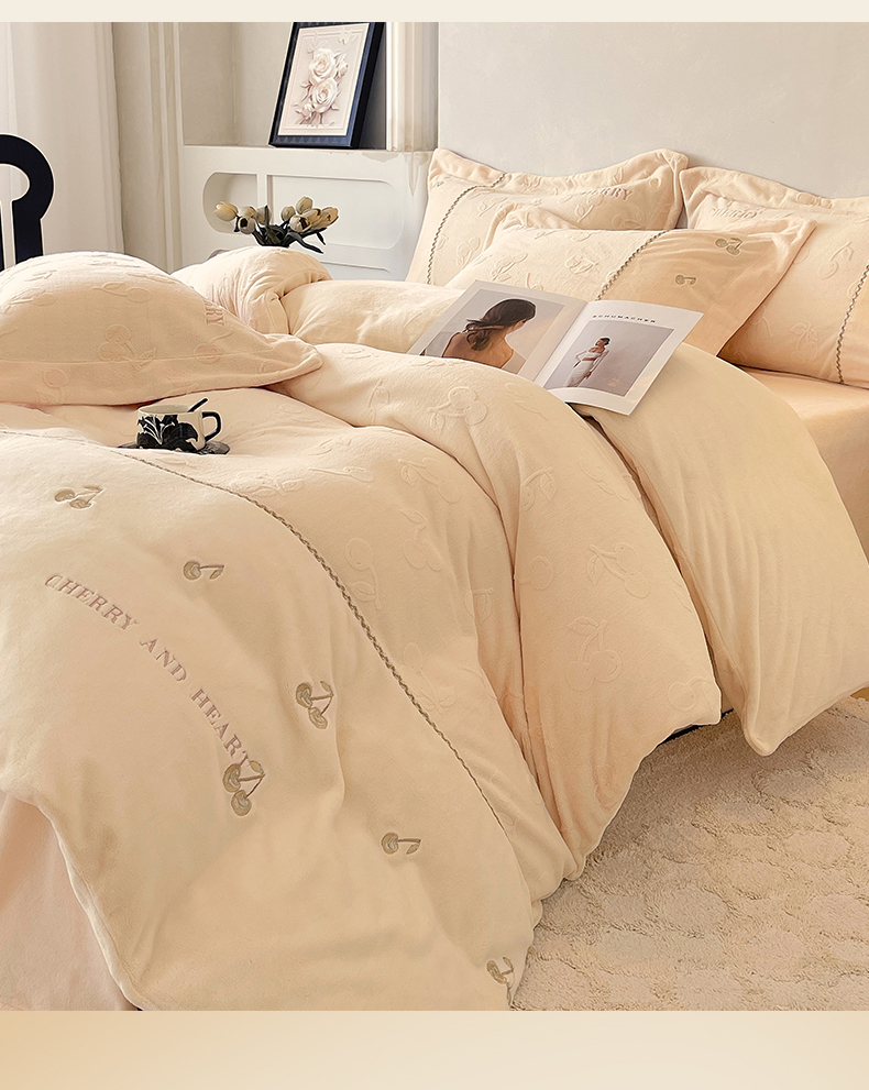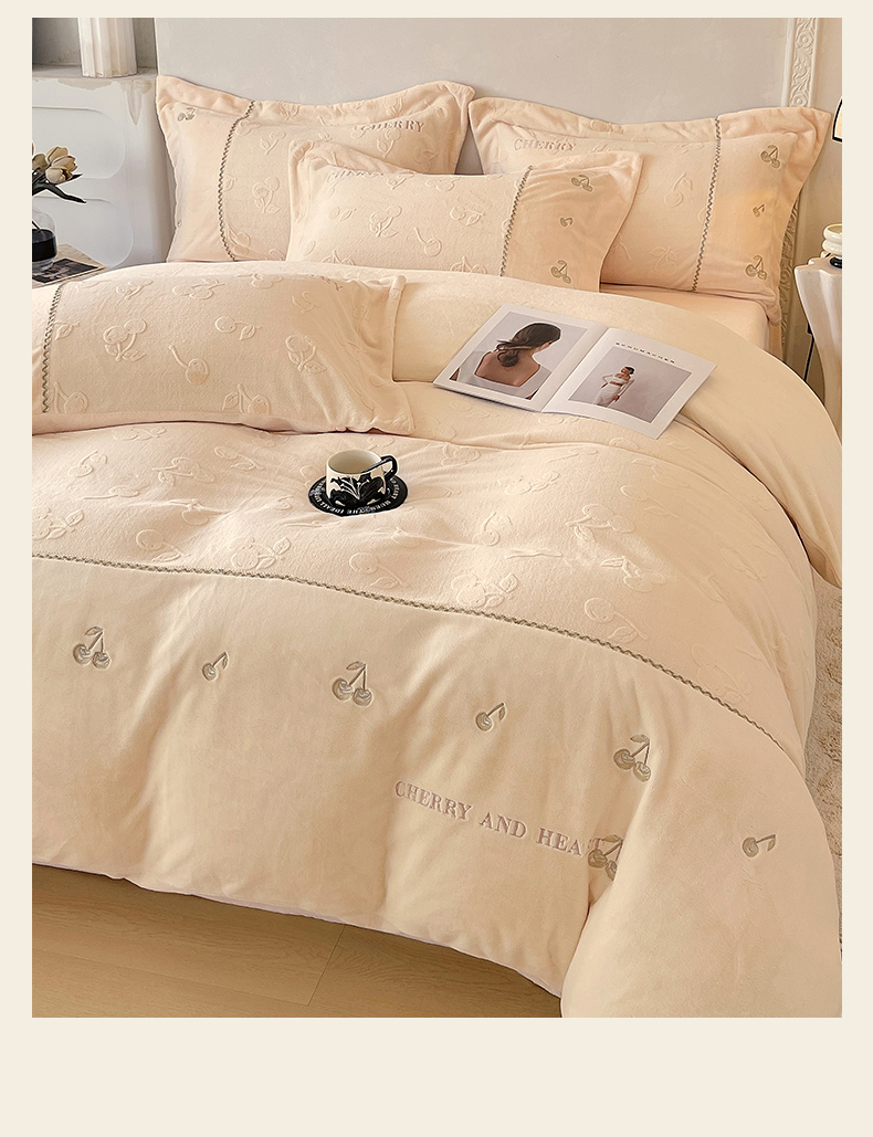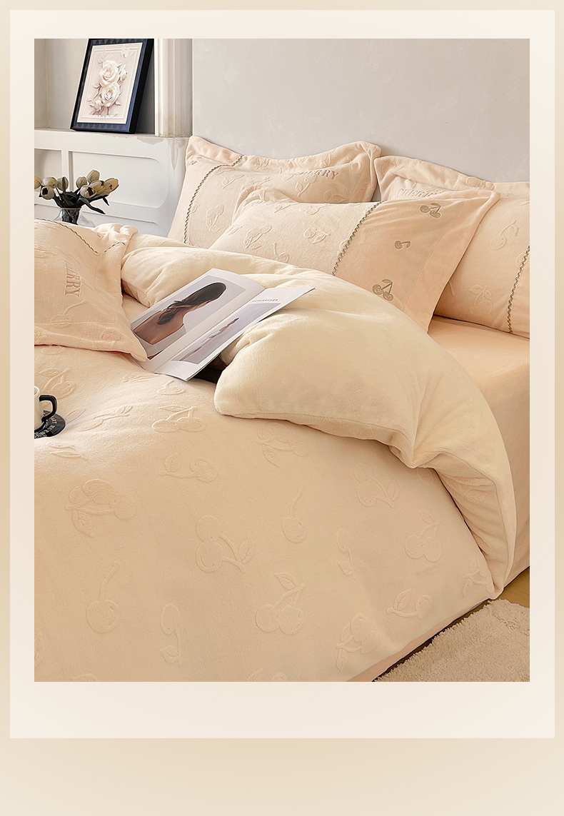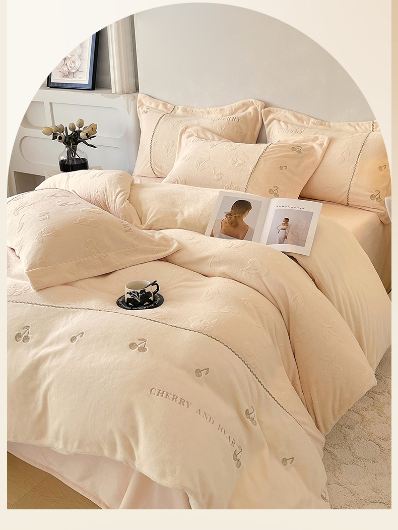 鼎飞家纺 2025新款高克重牛奶绒立体烂花+刺绣四件套--初恋樱桃系列 初恋樱桃-奶昔