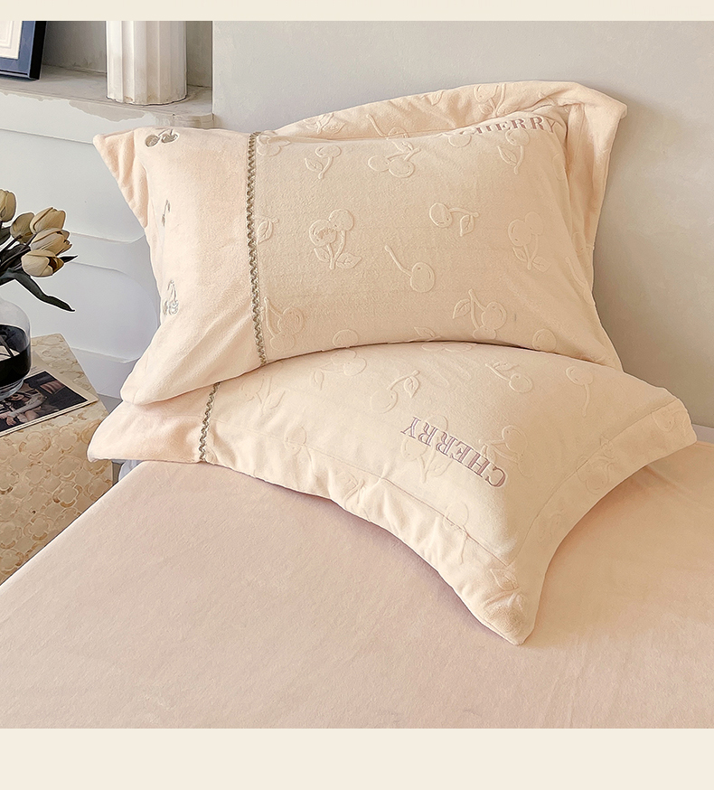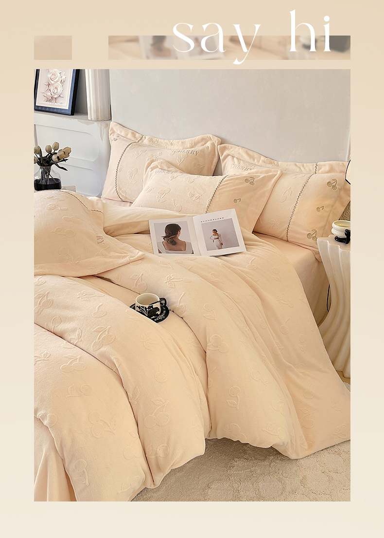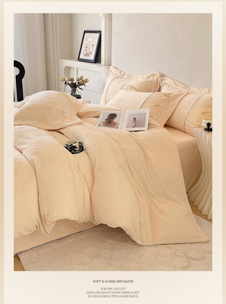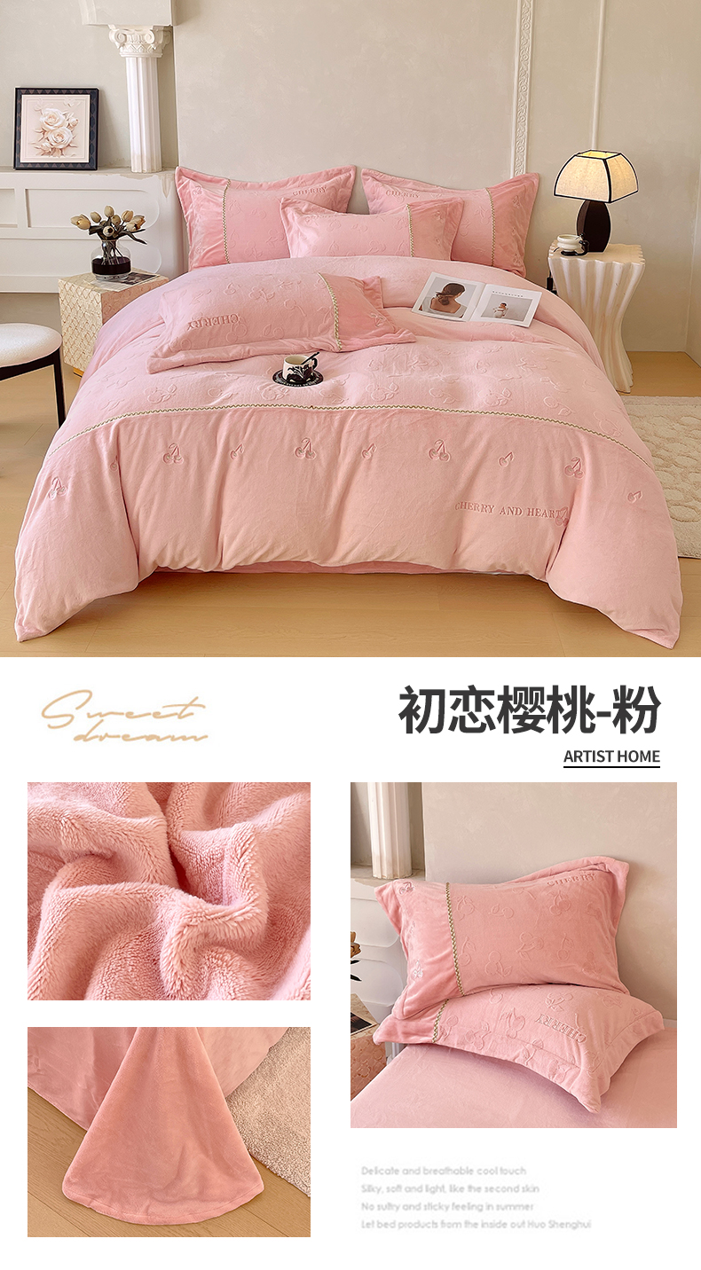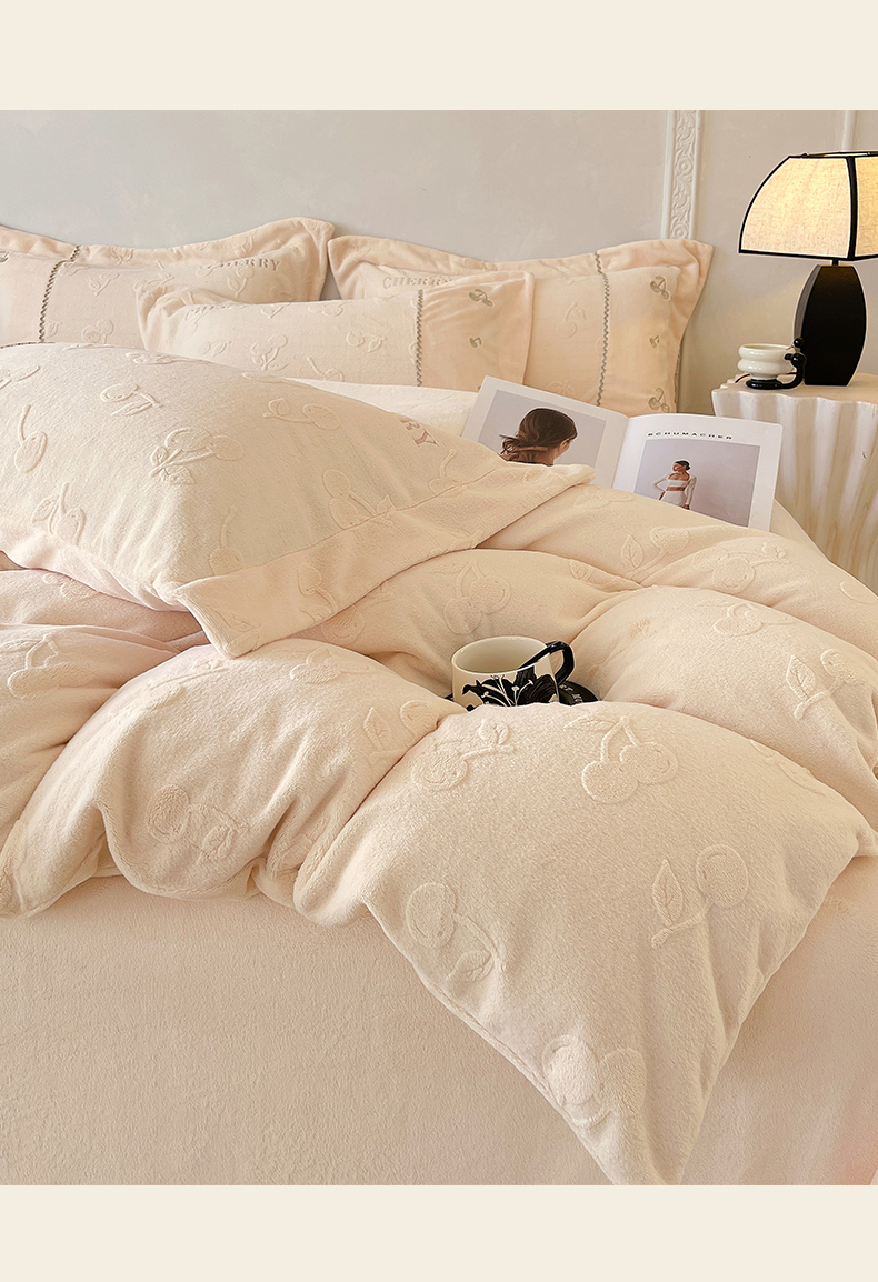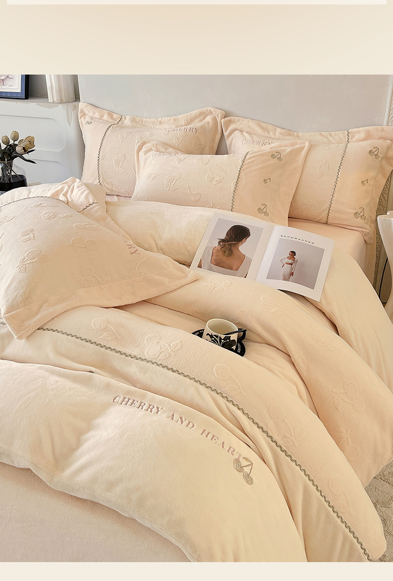 鼎飞家纺 2025新款高克重牛奶绒立体烂花+刺绣四件套--初恋樱桃系列 初恋樱桃-奶昔