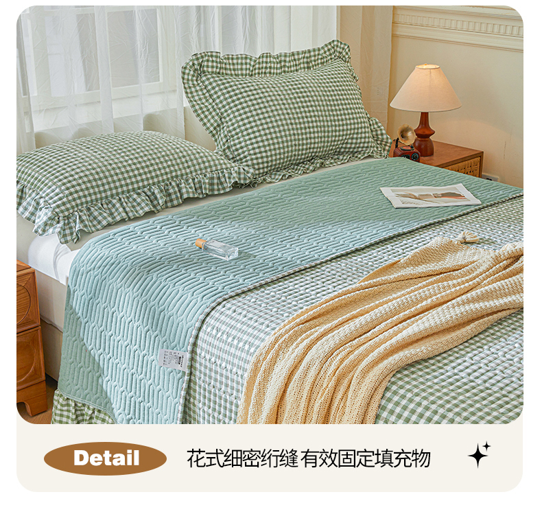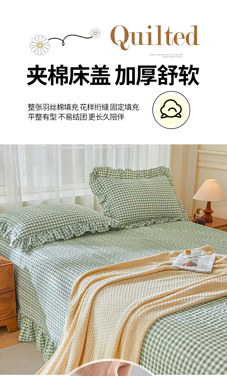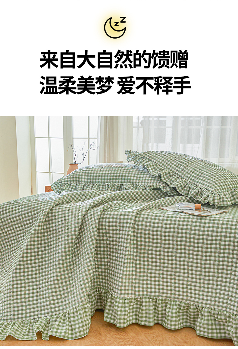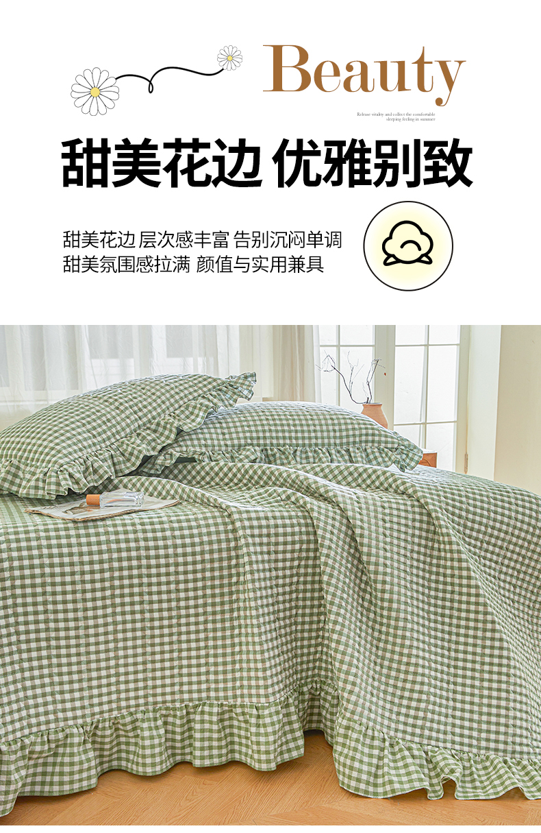 • 91家纺网 家纺一手货源 找家纺 珂博家纺 2025新款韩版花边纯棉全棉水洗棉色织床盖三件套单枕套 绿咖小格