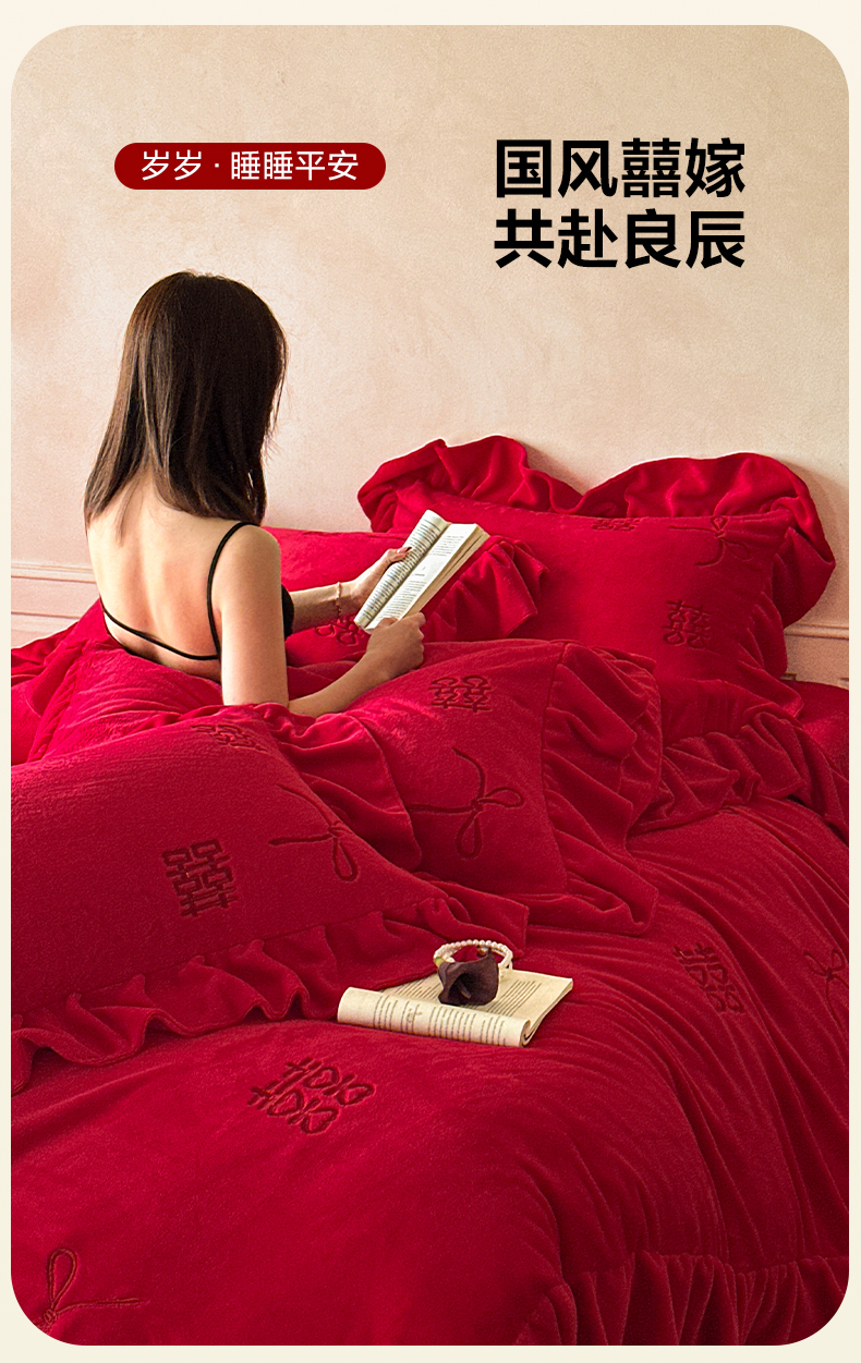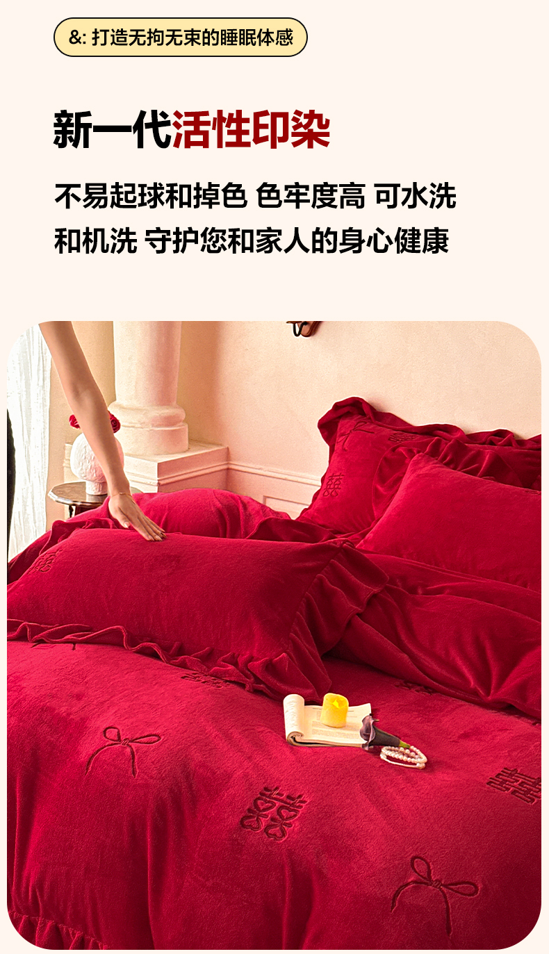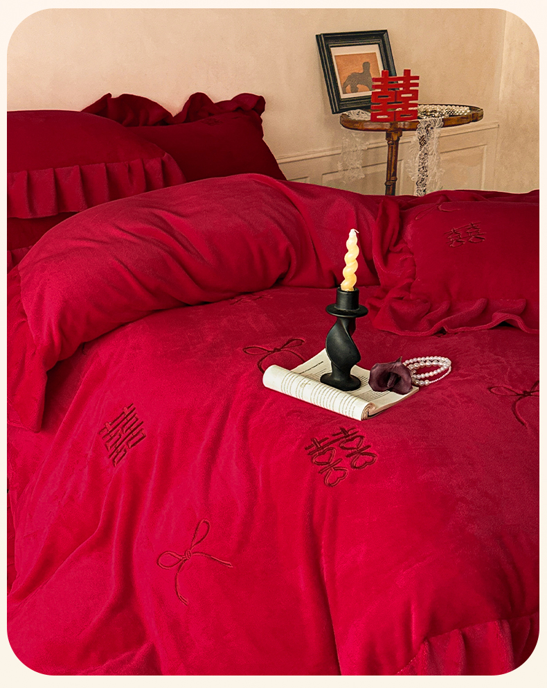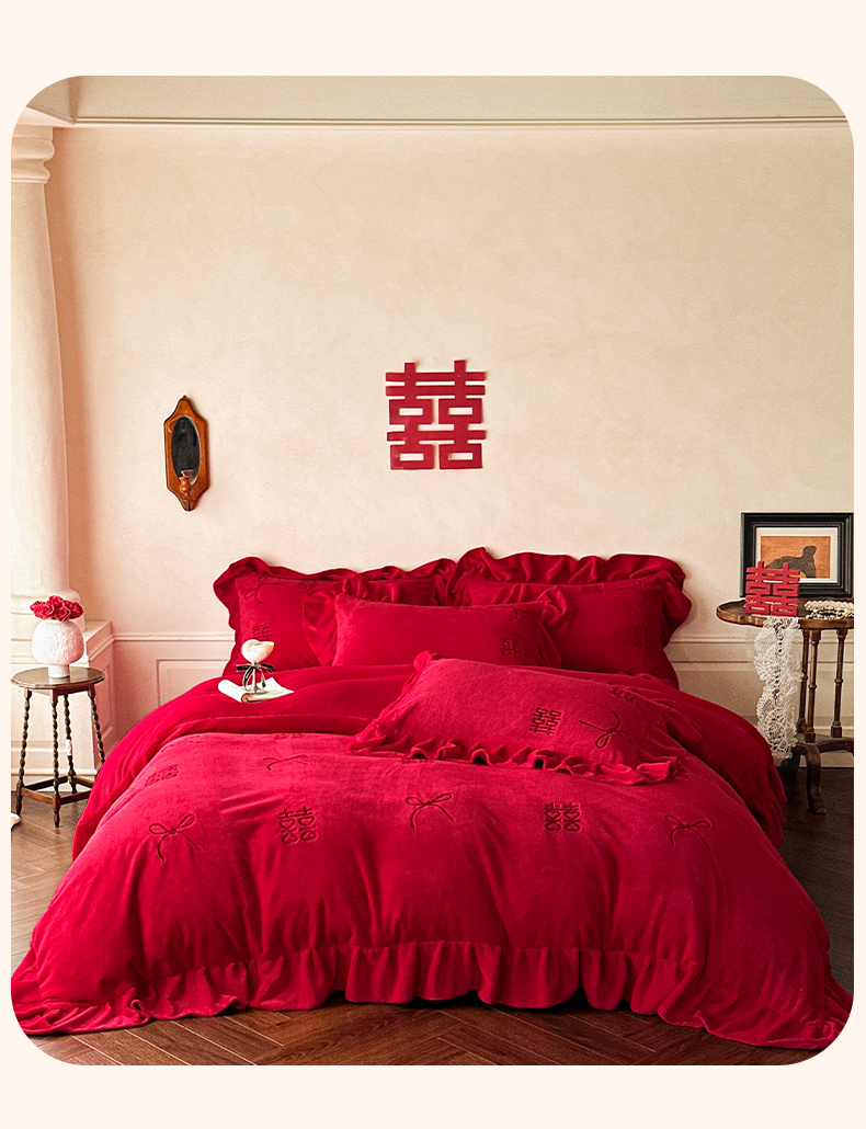欧乐蒂 2025新款婚庆款牛奶绒刺绣系列四件套-爱相随 爱相随-喜红