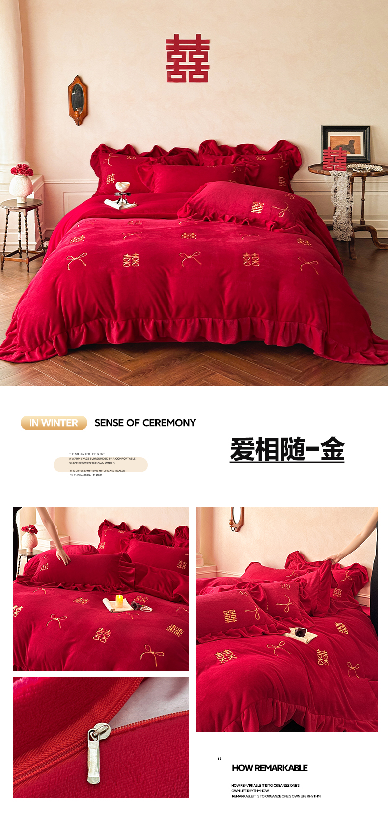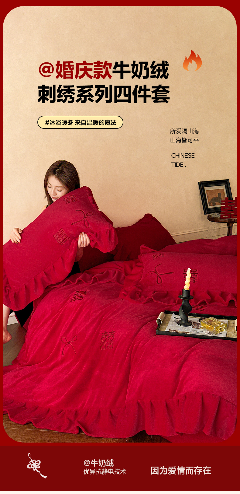 商品名称:欧乐蒂 2025新款婚庆款牛奶绒刺绣系列四件套-爱相随 爱相随-喜红