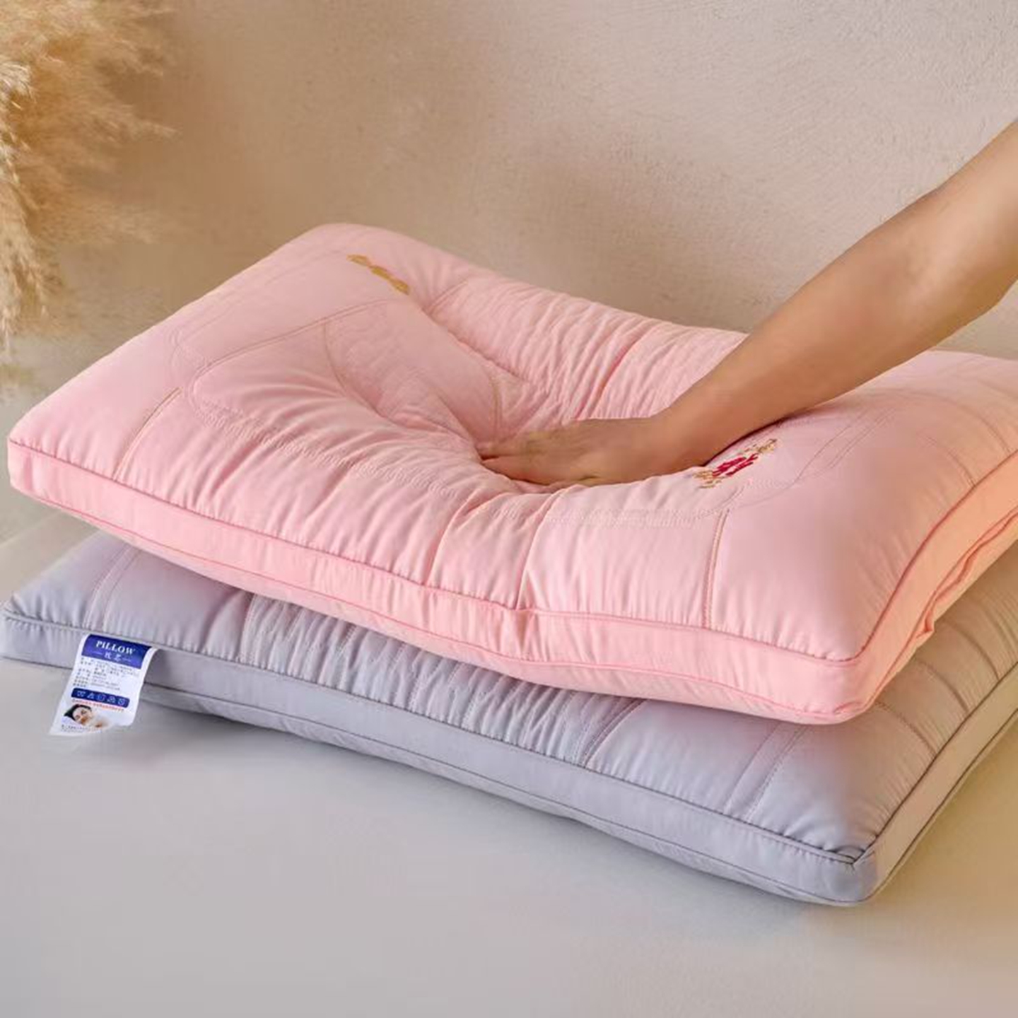 (总)剑桥枕业 2026新款提花烫钻H低矮枕芯 柔软矮超薄枕头 学生扁平基础枕头,白色,米色,灰色,粉色