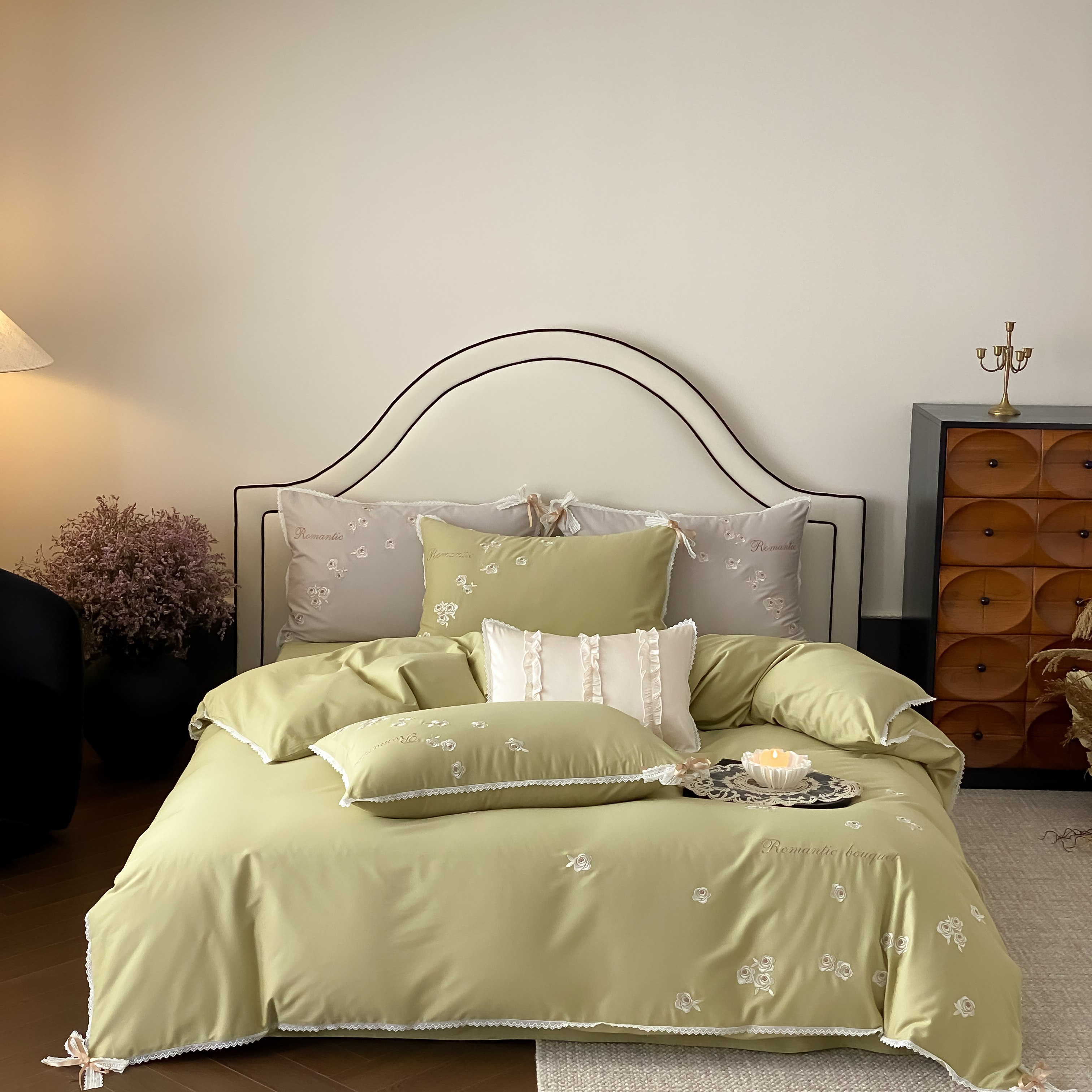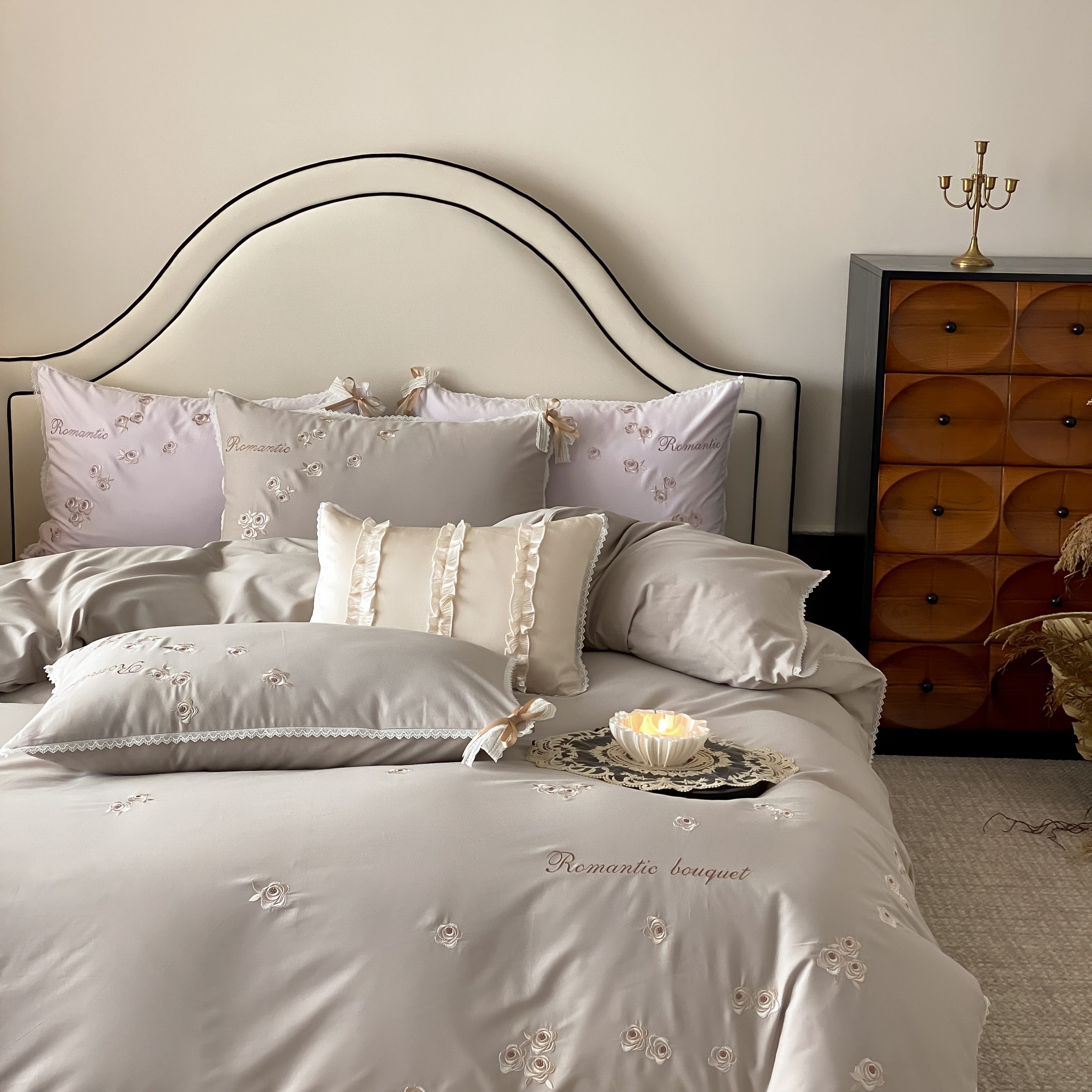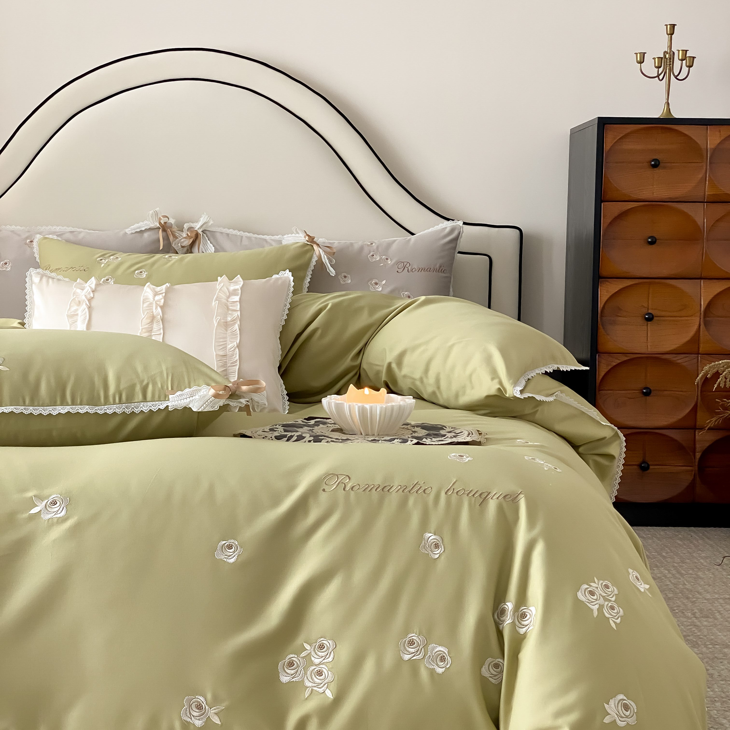 (总)佳汐蓝 2025春夏新品双层皱皱纱刺绣+织带+荷叶边四件套--白茶花,奶白,曲奇